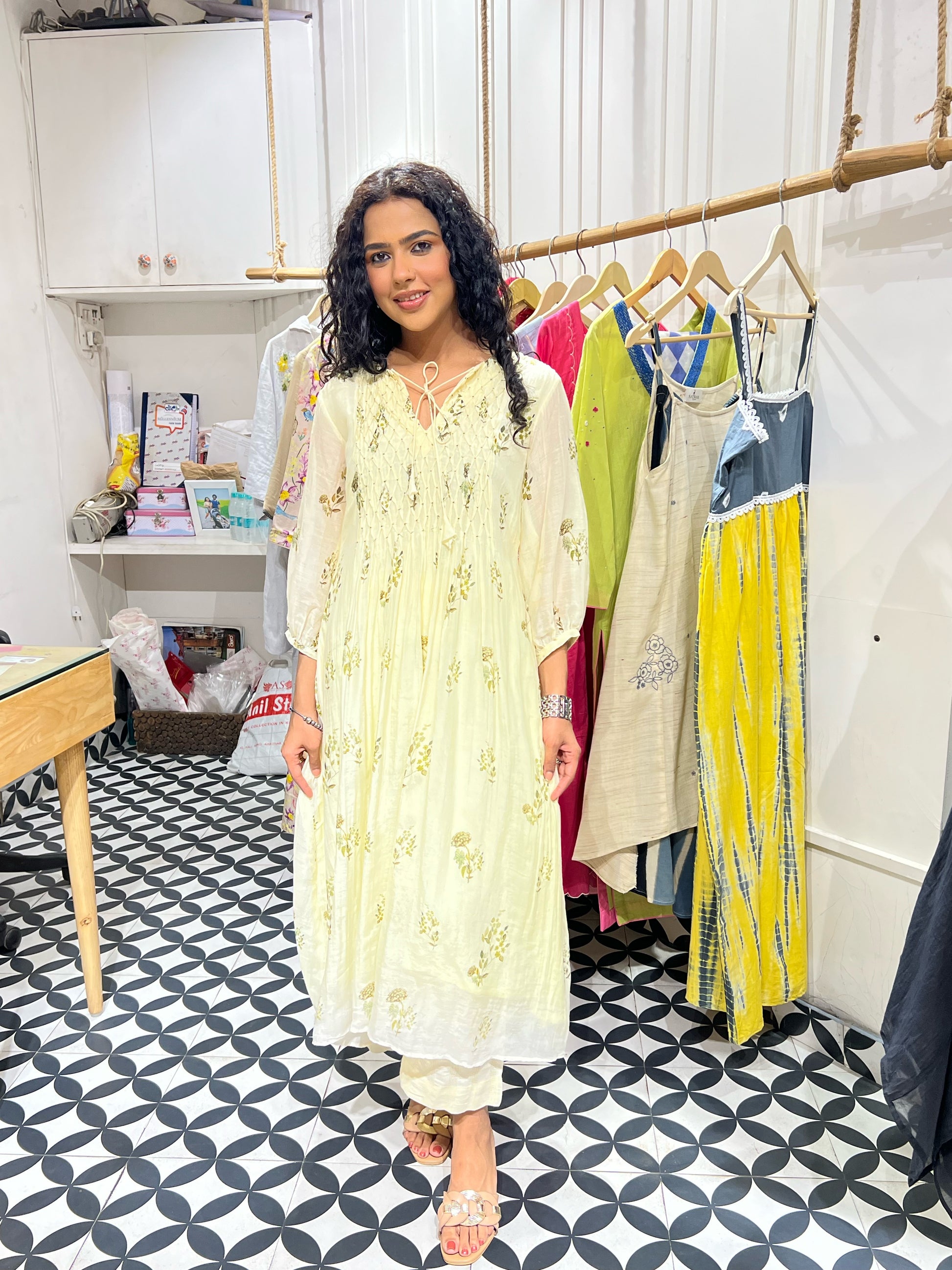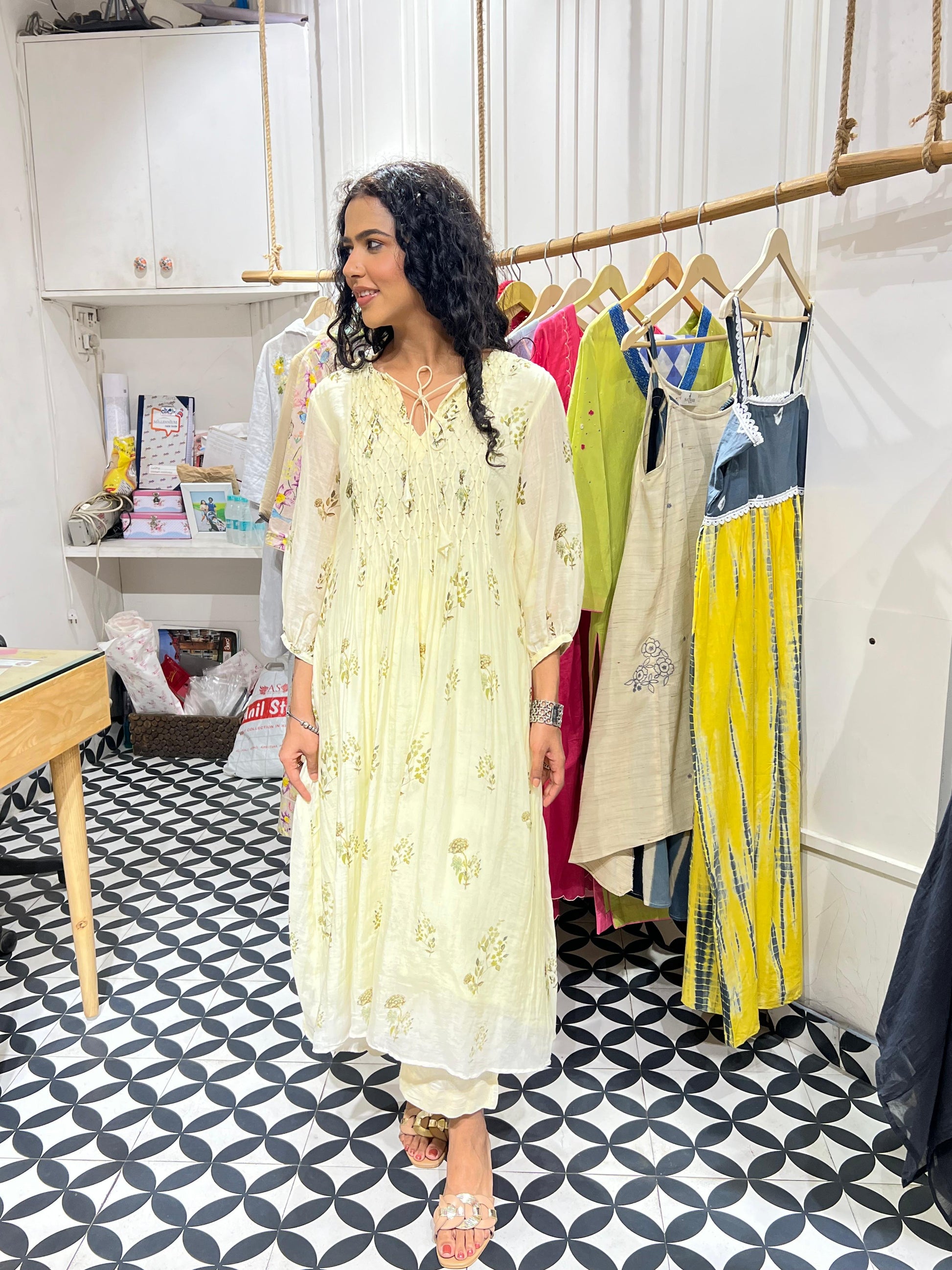 Crafted in airy Chanderi silk fabric, this hand-printed kurta features intricate smocking details on the front, adding a charming texture and fit. It’s paired with cotton pants that carry a self-print design, offering both comfort and a cohesive look. A versatile outfit for both everyday elegance and special occasions.