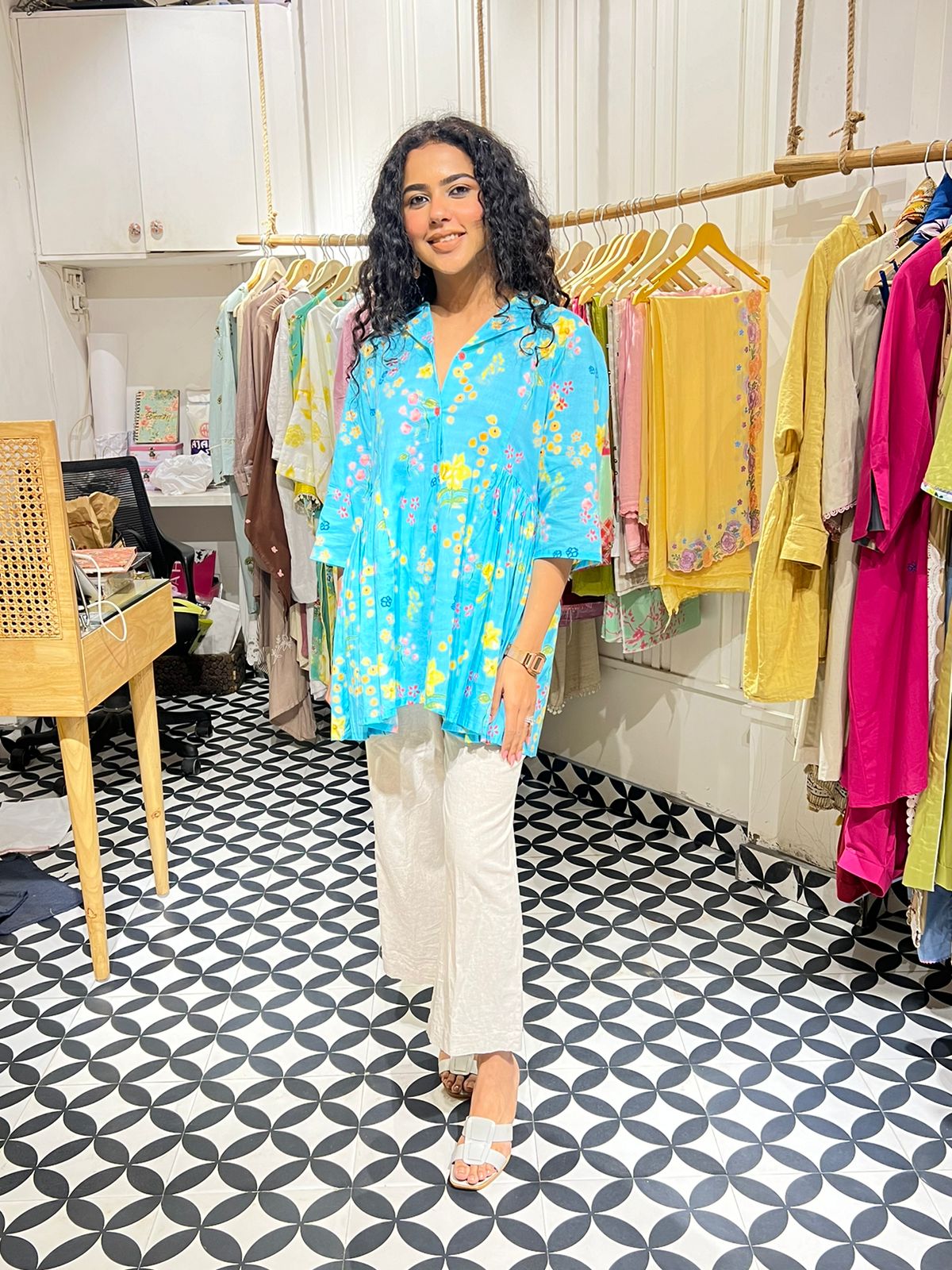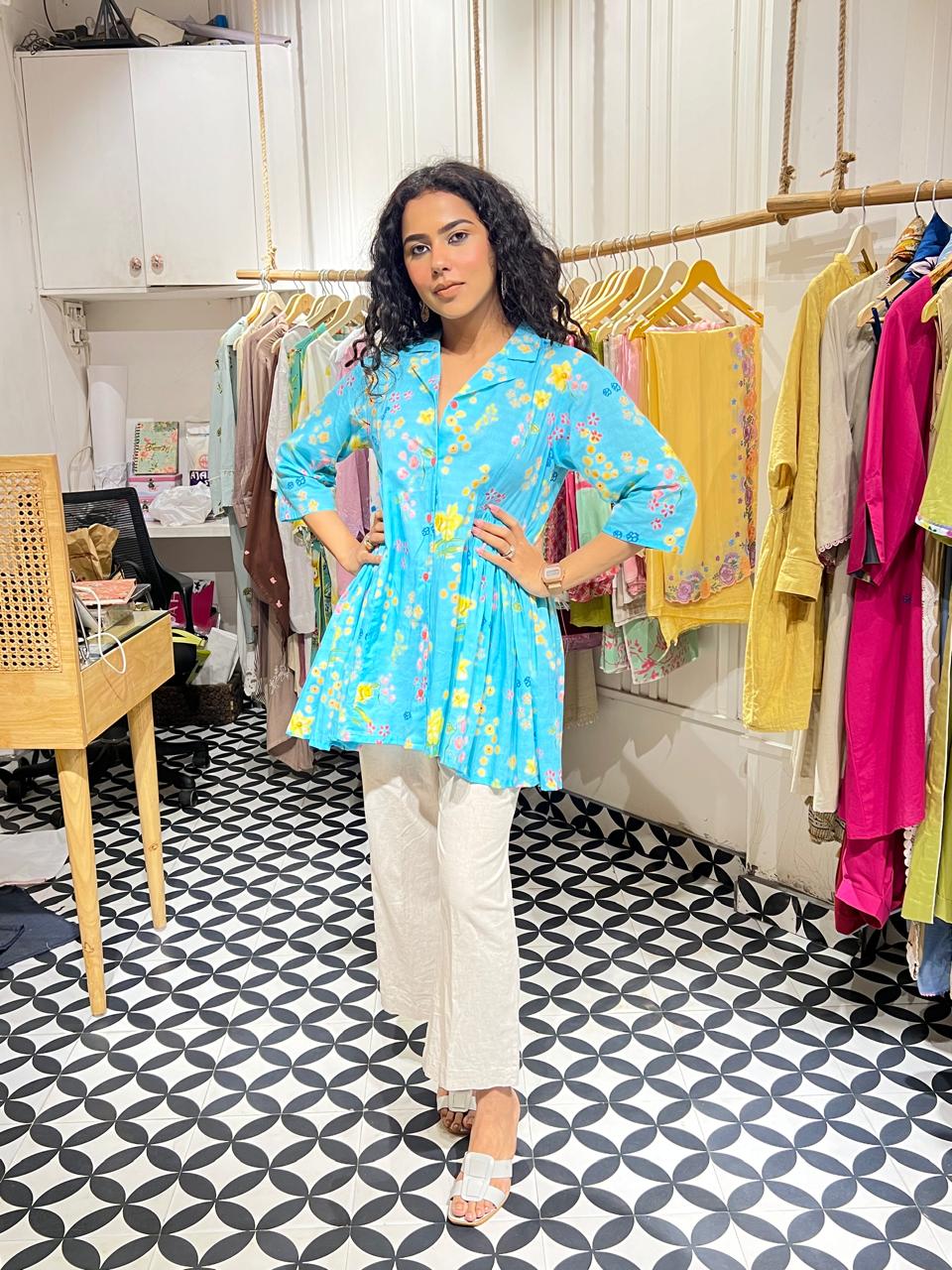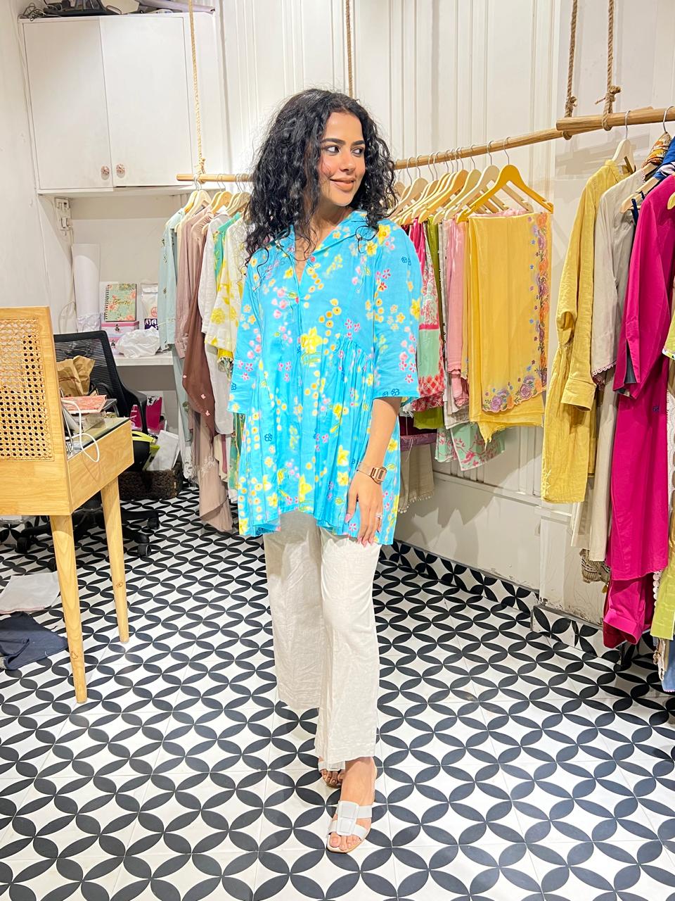 Elevate your wardrobe with this exquisite cyan coord set, where pure cotton meets a vibrant burst of floral beauty. 🌸💙 The top is adorned with a delightful array of flowers in hues of yellow, green, pink, red, and dark blue, creating a lively and fresh look that’s perfect for any season. The matching neutral pants provide the perfect balance, allowing the top to stand out while ensuring a versatile, effortless style. Whether you're stepping out for a casual day out or a relaxed evening gathering, this coord set offers the ideal blend of comfort, elegance, and a touch of nature's charm.