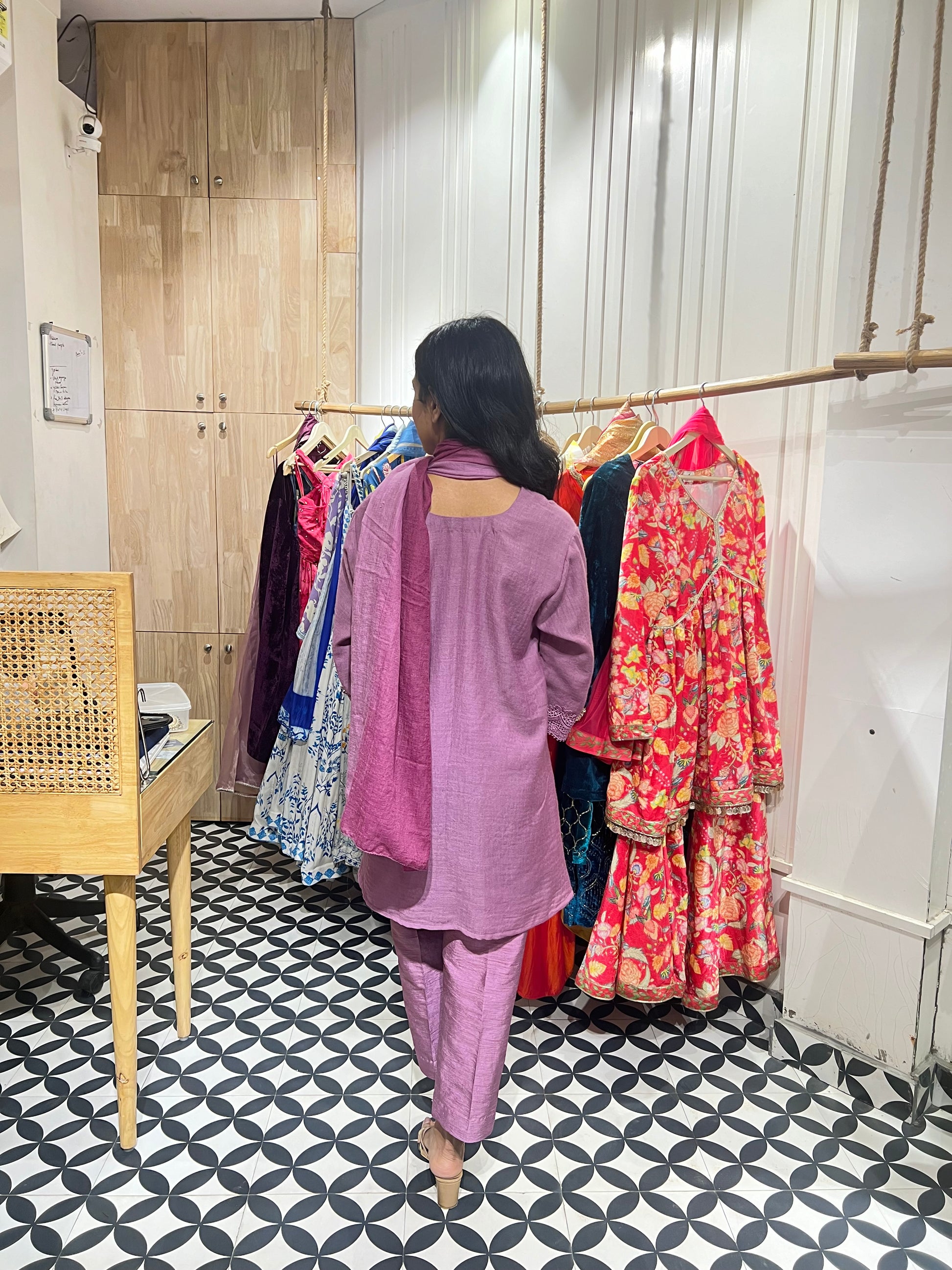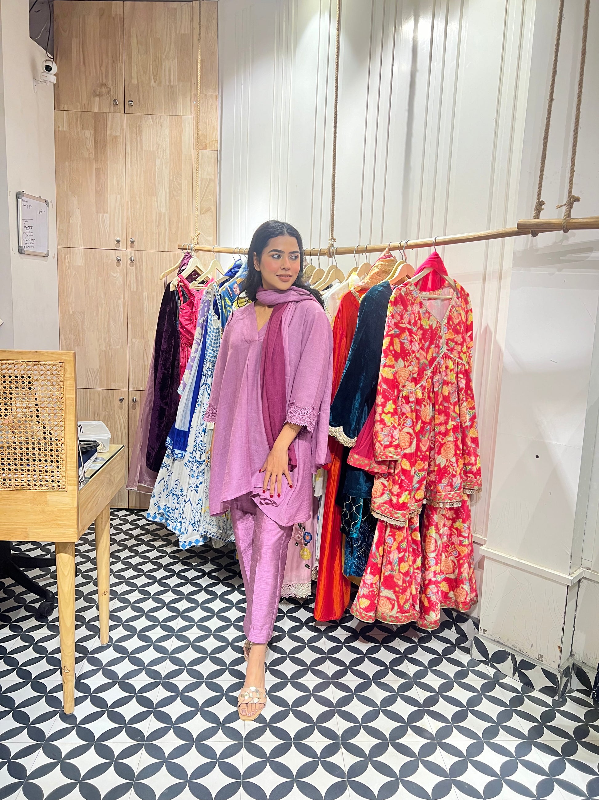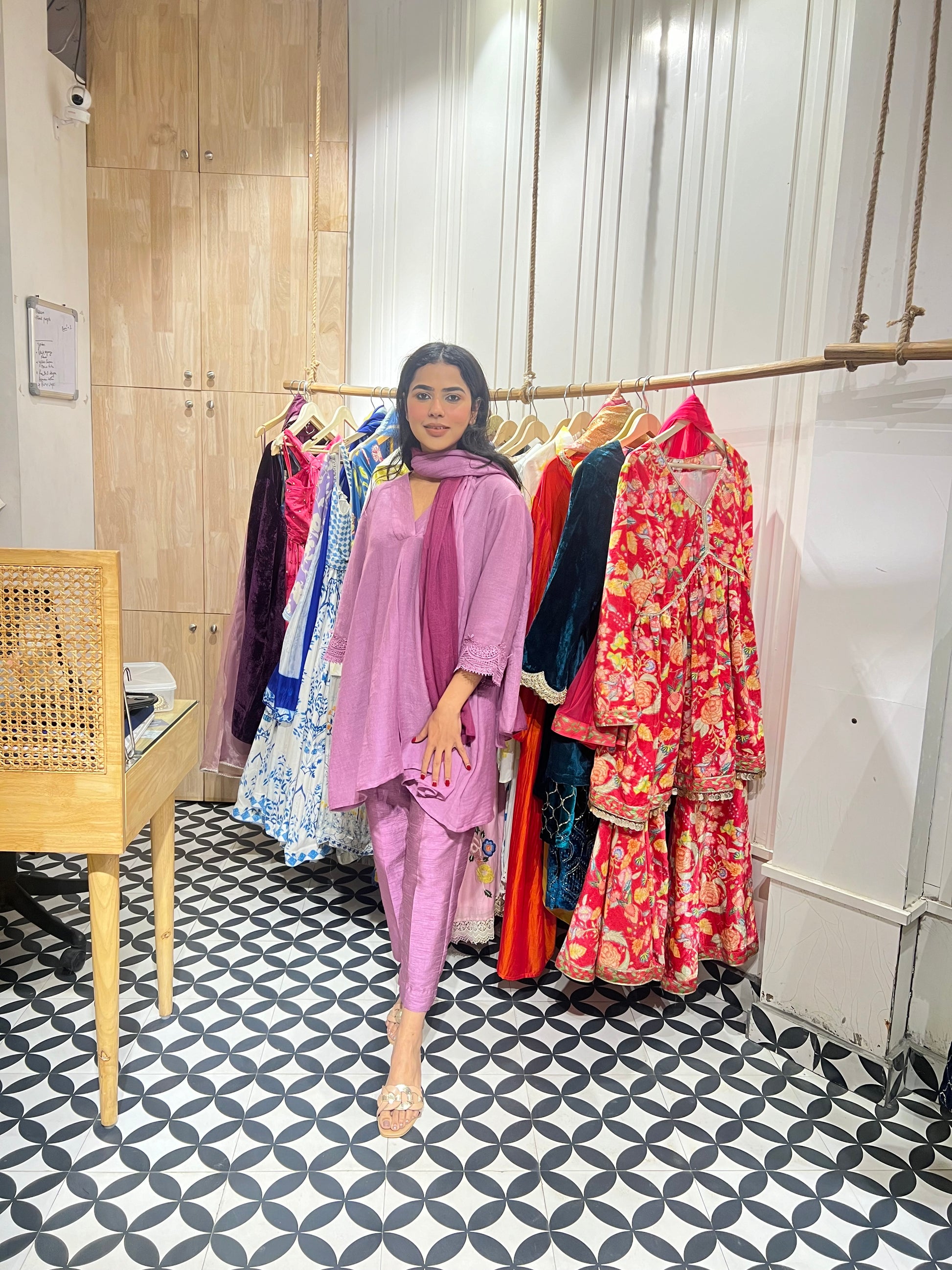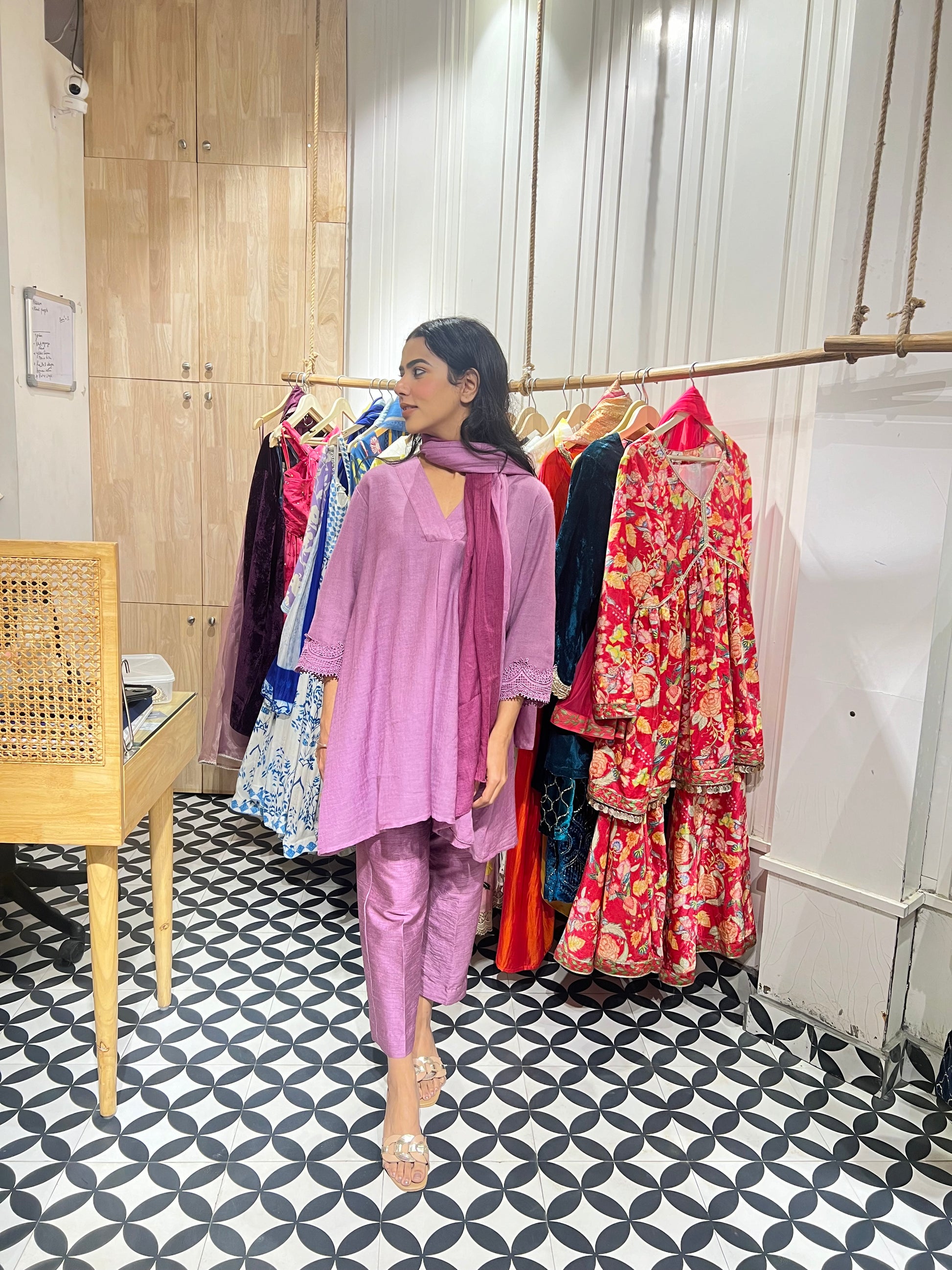 Stay warm and stylish this winter with our luxurious Lavender Pashmina Set. Designed in a cozy wintery hue, it features a stunning two-toned Pashmina stole for a touch of elegance. The outfit is crafted with a flattering box pleat that complements every body type and enhanced with delicate lace detailing on the sleeves.