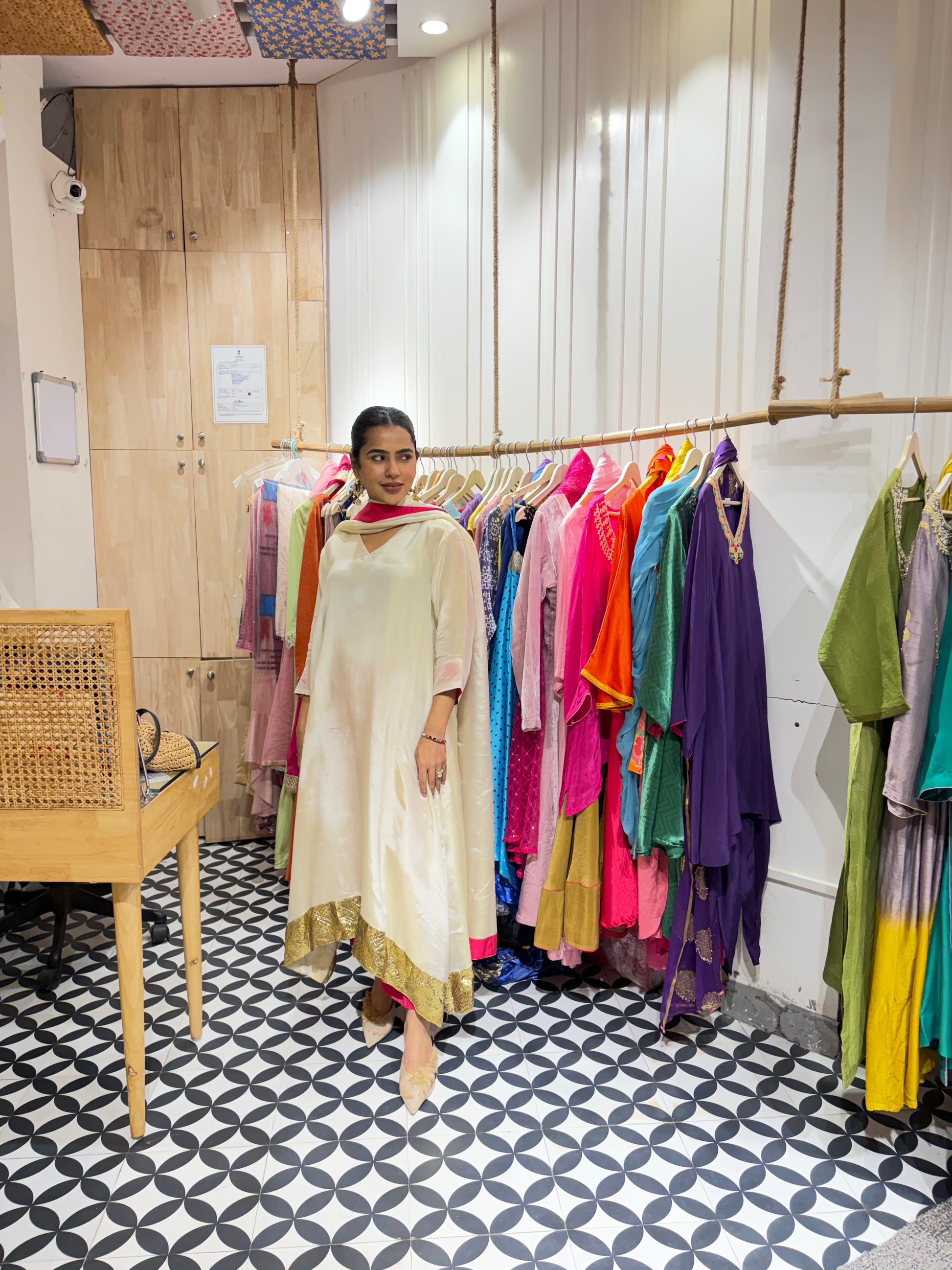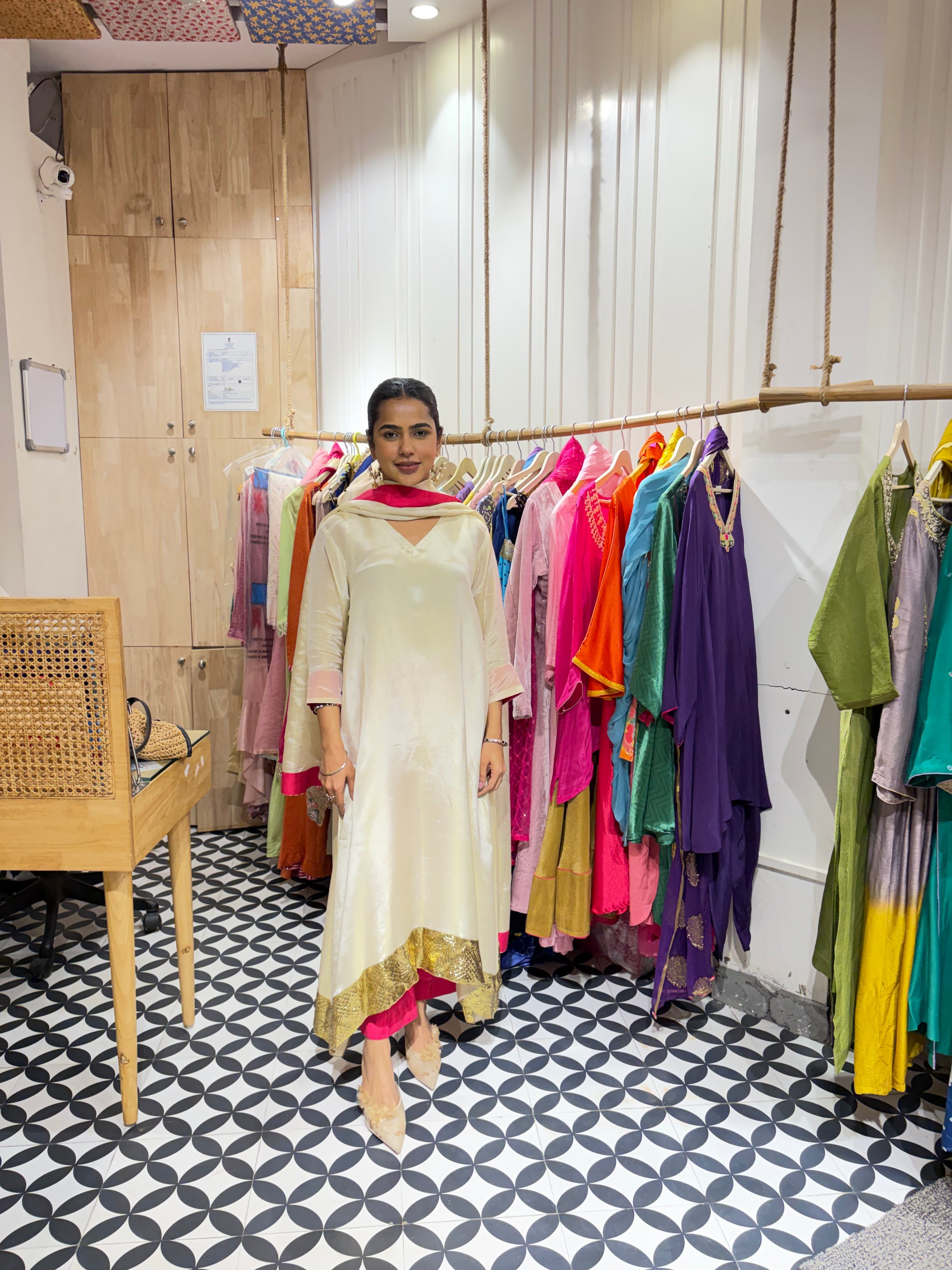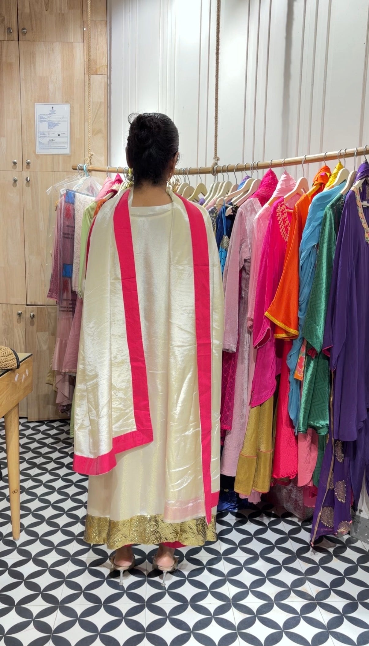 Make a statement in subtle luxury with this beautifully crafted Tissue Suit Set. The top, made from high-quality tissue fabric, flows freely in an anti-fit design that flatters every body type while keeping you comfortable throughout the day. Paired with bright hot pink pants in silk that bring energy and color to the outfit, and a coordinating dupatta featuring a hot pink border, this ensemble strikes the perfect balance between softness and vibrancy. Ideal for celebrations, get-togethers, or a refined everyday look.