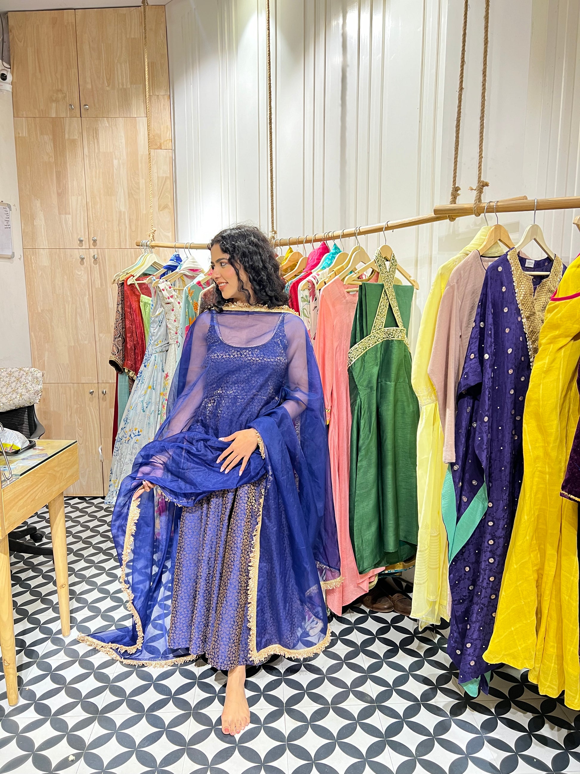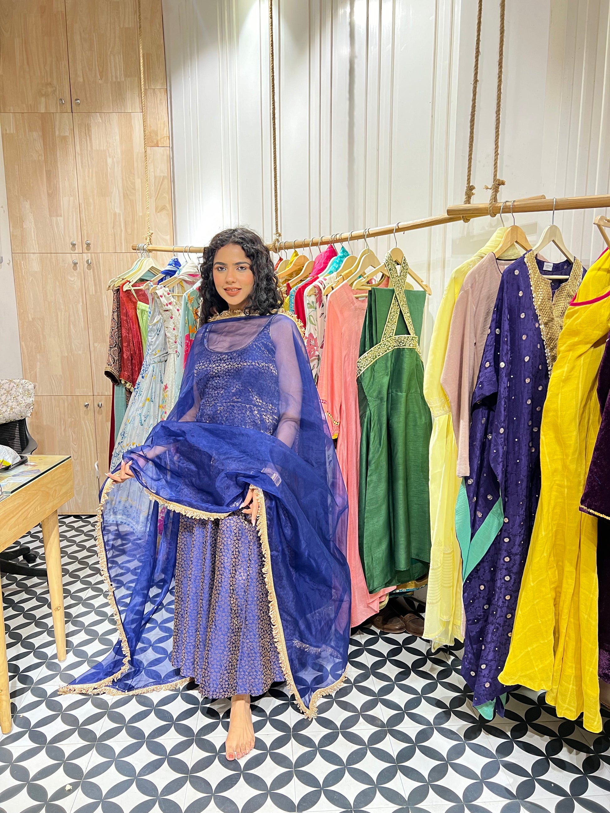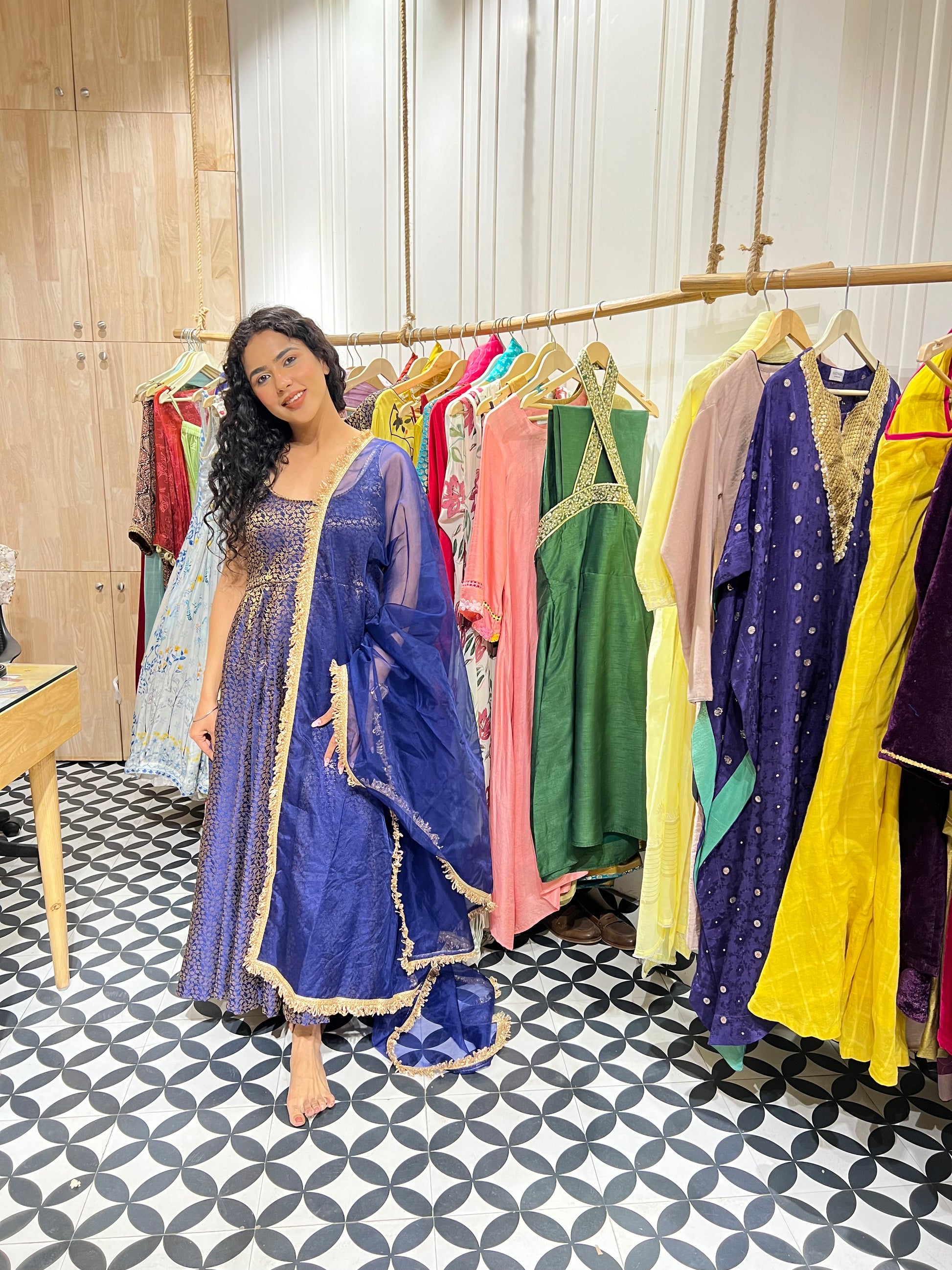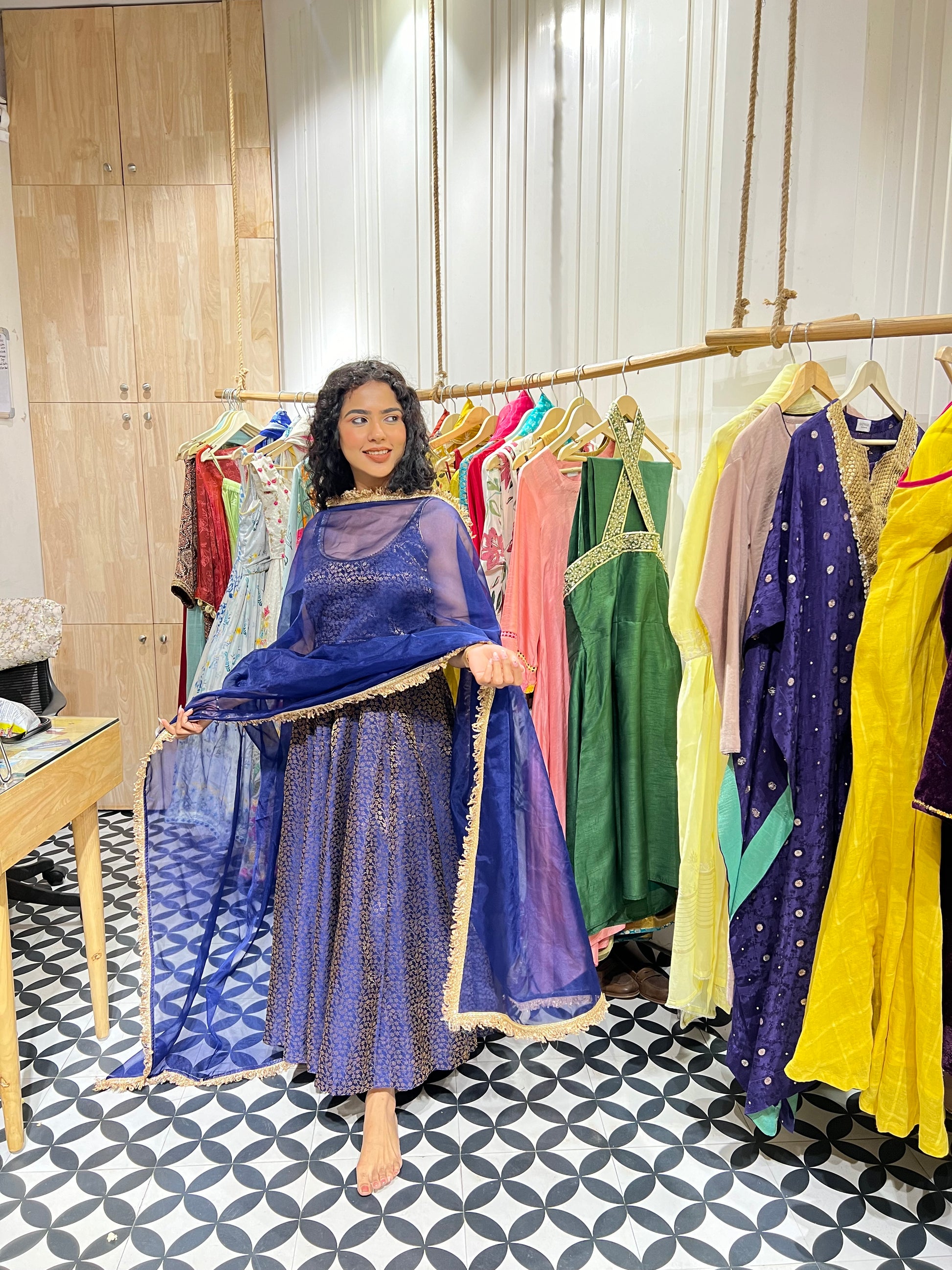 Make a statement at every wedding with this exquisite blue brocade Anarkali set. The luxurious brocade fabric creates a rich, timeless look, while the delicate organza dupatta adds an ethereal touch. The intricate kinari detailing on all four sides elevates the entire ensemble, making it the perfect blend of tradition and modern elegance. A true wardrobe essential for the upcoming wedding season, designed to make you feel graceful and stylish at every celebration ✨🌸