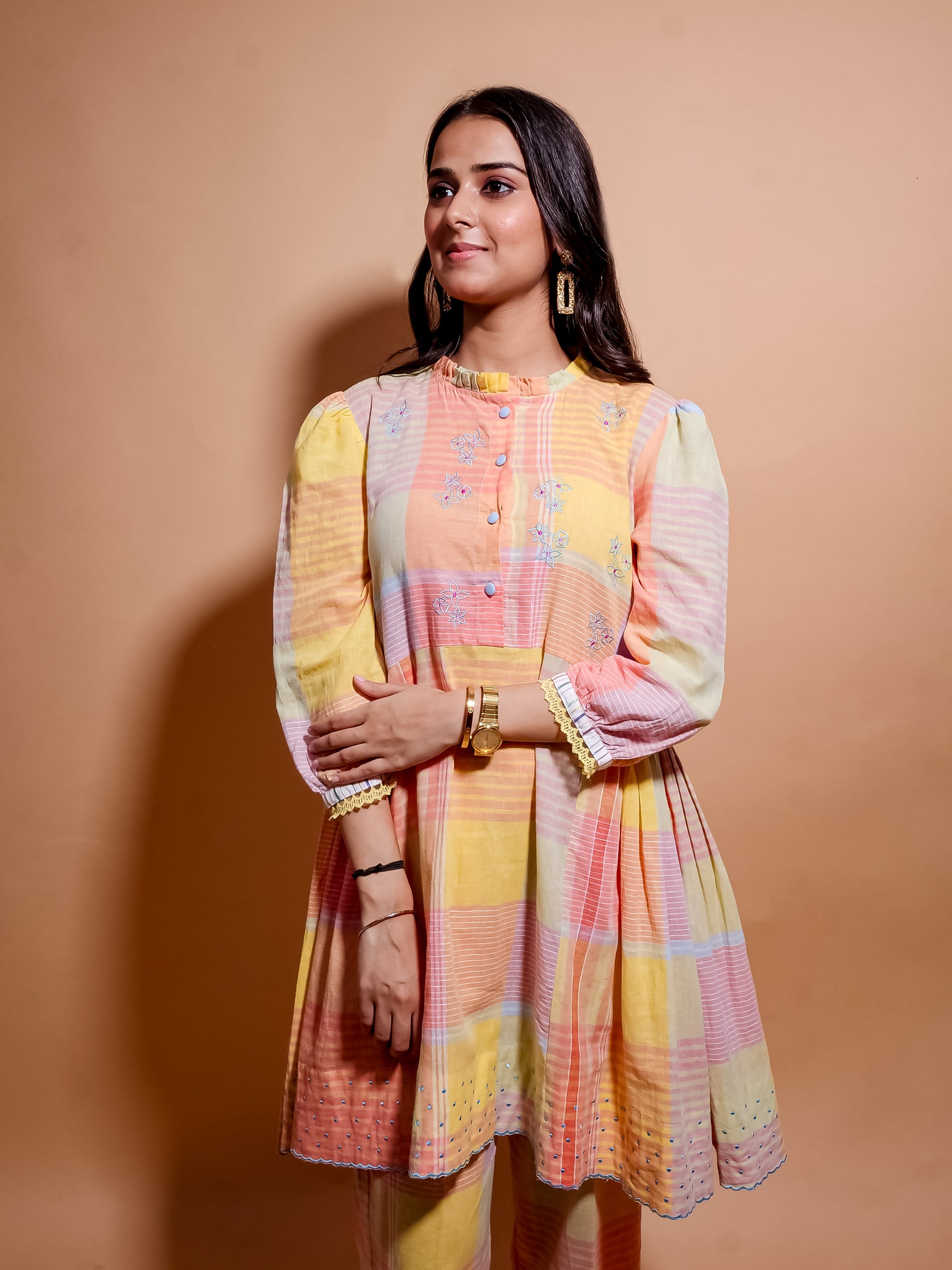 A classic co-ord set in an easy fit with contrast side panels on the yoke . The gathers on the yoke result in a stylish and comfortable fit. Features thread embroidery on the yoke, hemline and the pants. The shirt is finished with an embroidered white fabric facing.