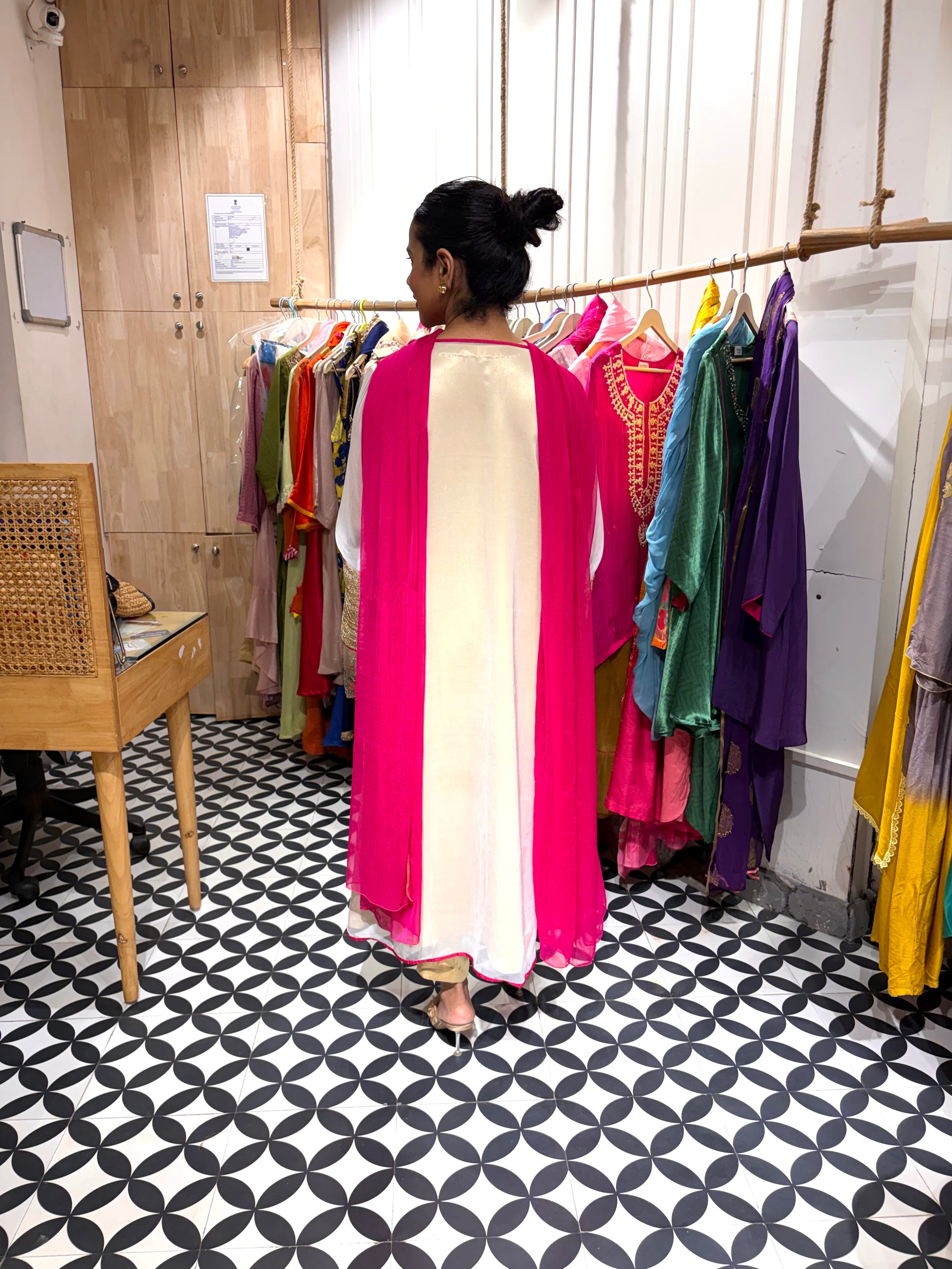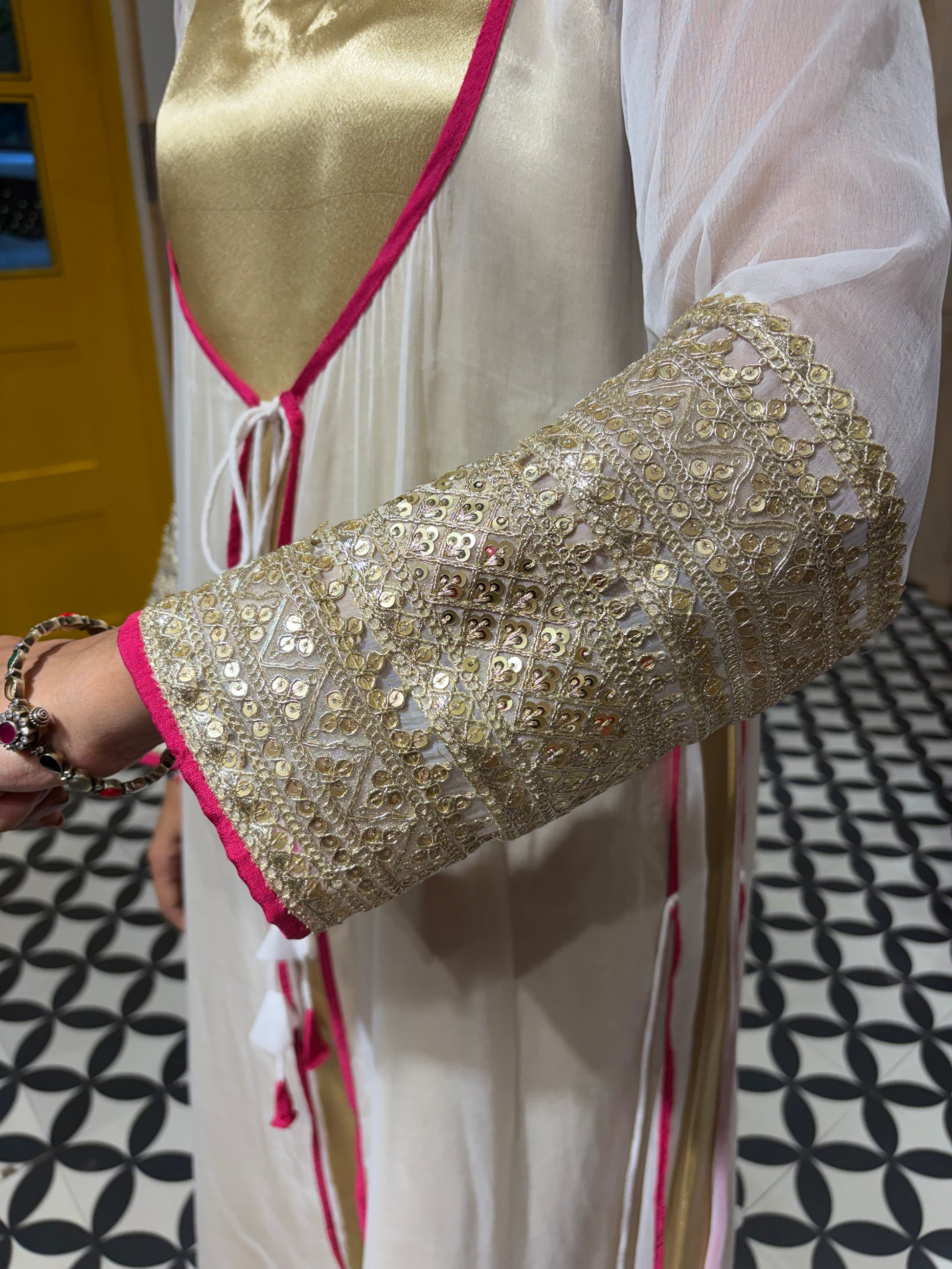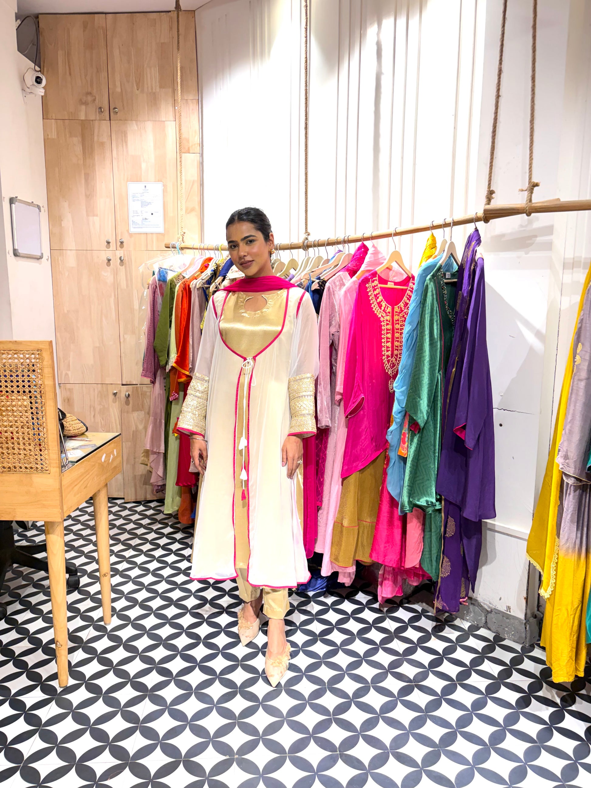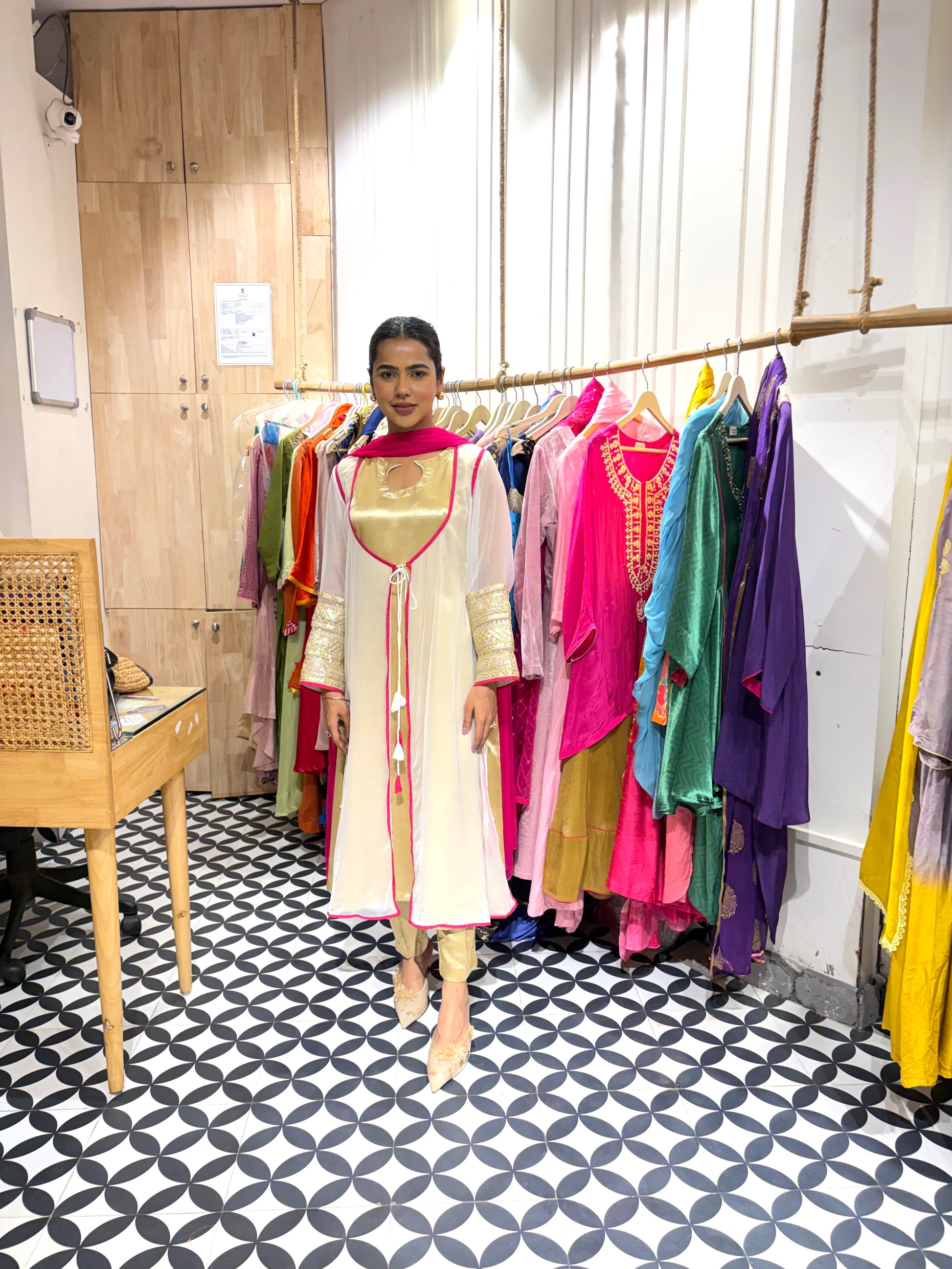 A vision in white and gold, this stunning suit set captures the essence of festive elegance ✨ Featuring a shimmering golden kurta with matching pants, layered under a white jacket adorned with soft pink piping, it’s the perfect mix of sophistication and charm. Finished with a dreamy chiffon pink dupatta, this look is all about timeless grace and subtle glamour 🌸👑