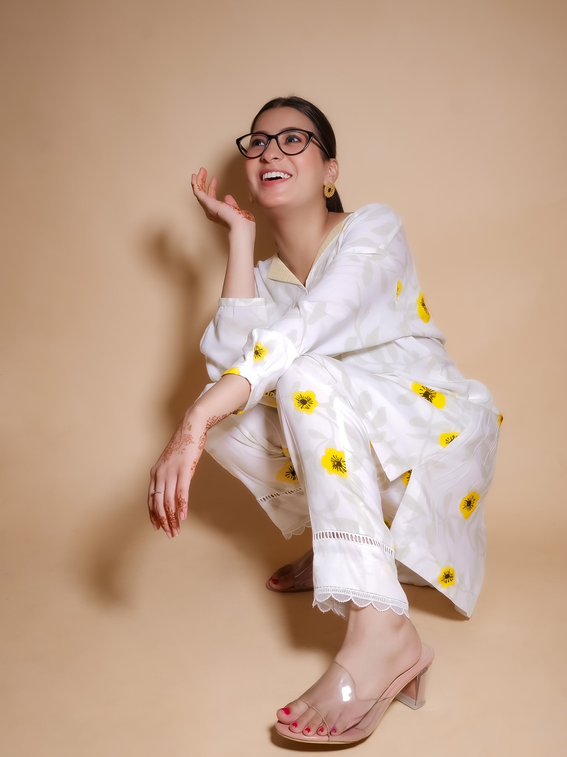 This rayon hand printed co-ord set has a flowy silhouette. Features drop shoulder and box pleat. The shirt’s collar is finished with a contrast printed facing . The pants have pockets and feature a beading and a lace near the hemline.