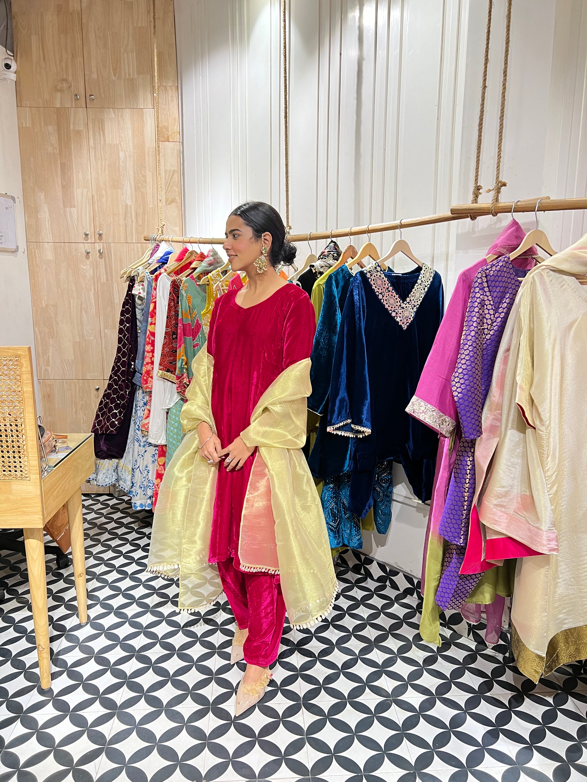 Add a touch of luxury to your wardrobe with this hot pink velvet suit. Made from rich velvet fabric, it offers both comfort and elegance. The mirror work on the sleeves provides a festive sparkle, while the golden organza dupatta complements the outfit with a soft, airy finish. Perfect for any special occasion, this suit is designed to make you shine🌸