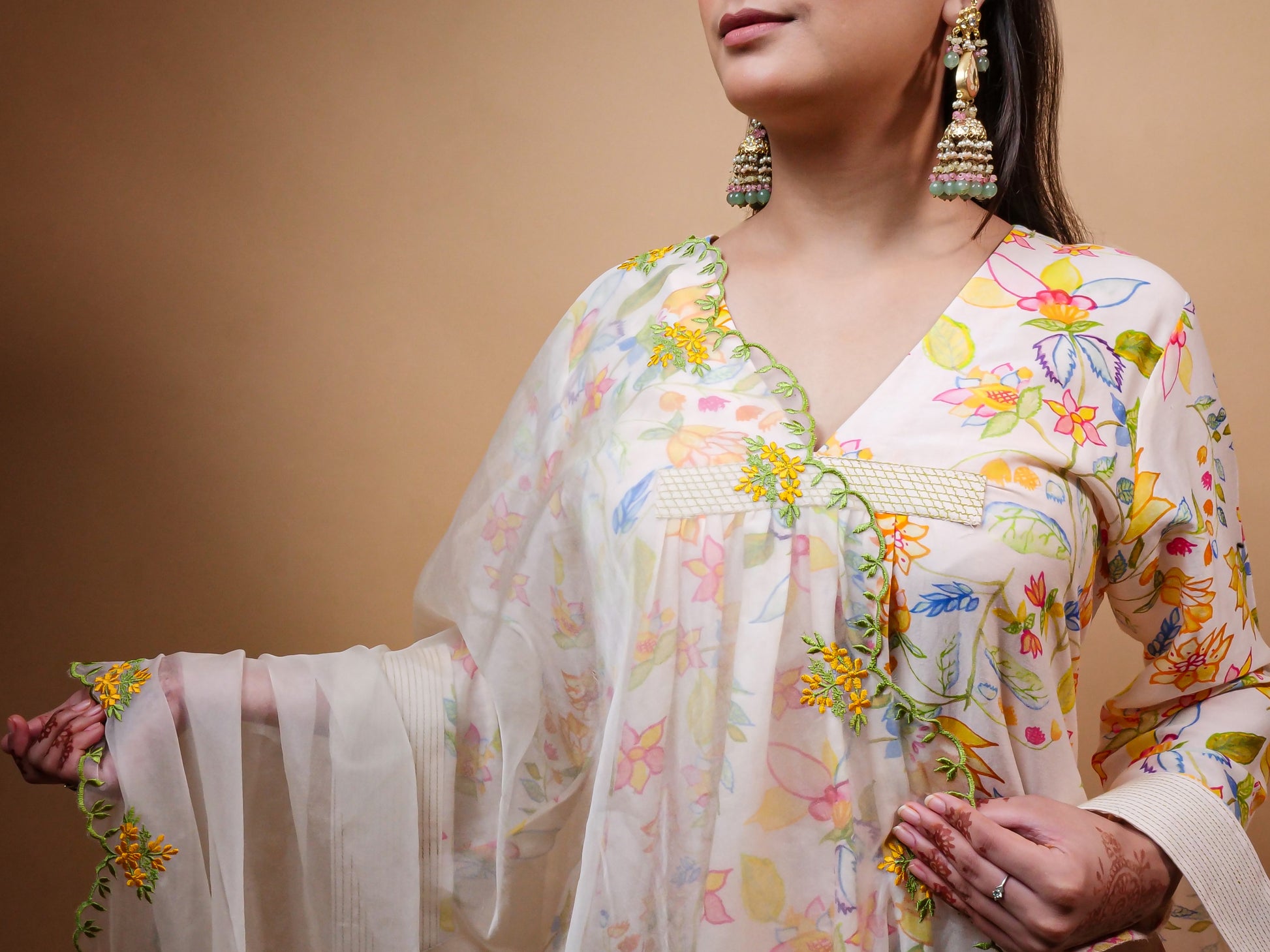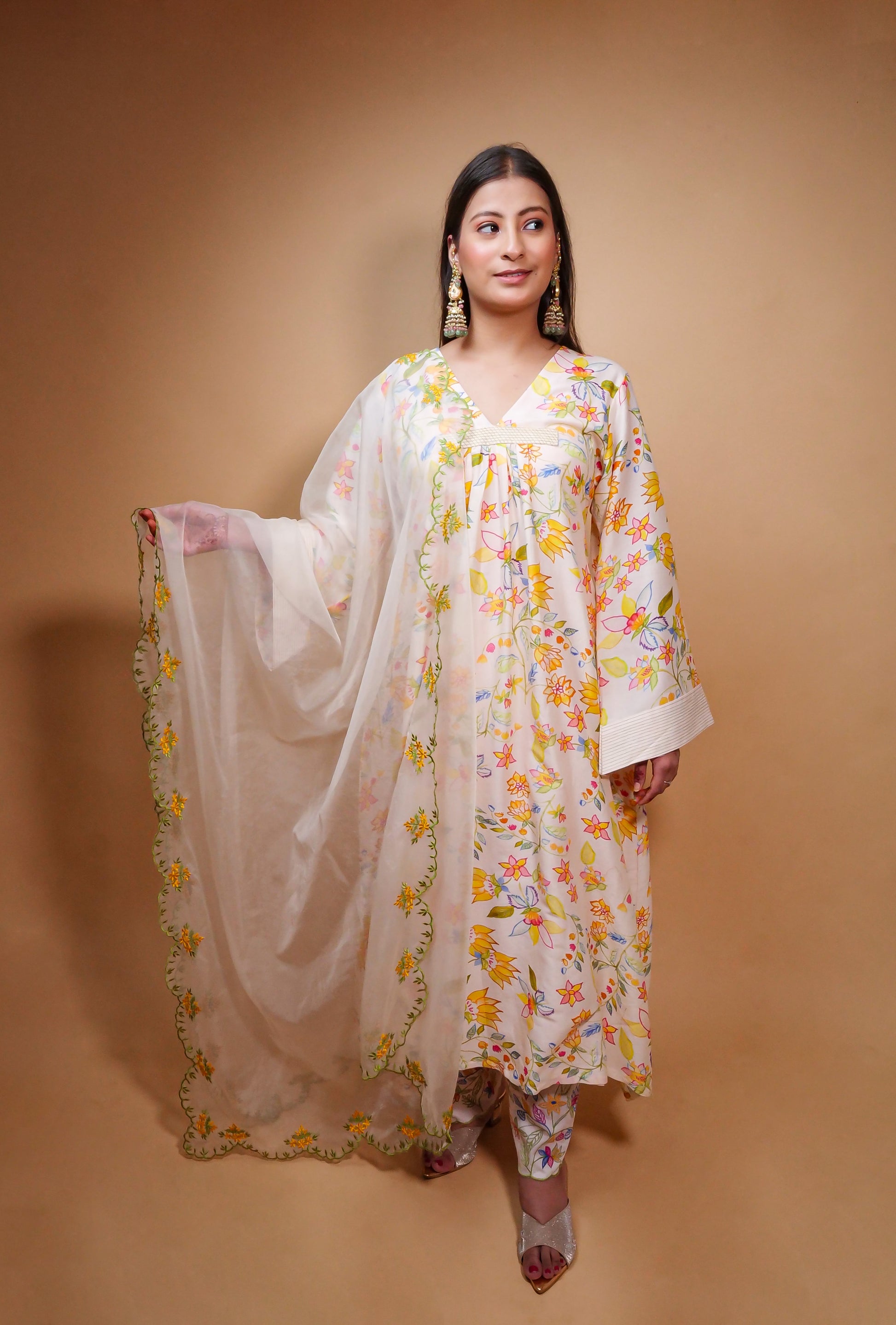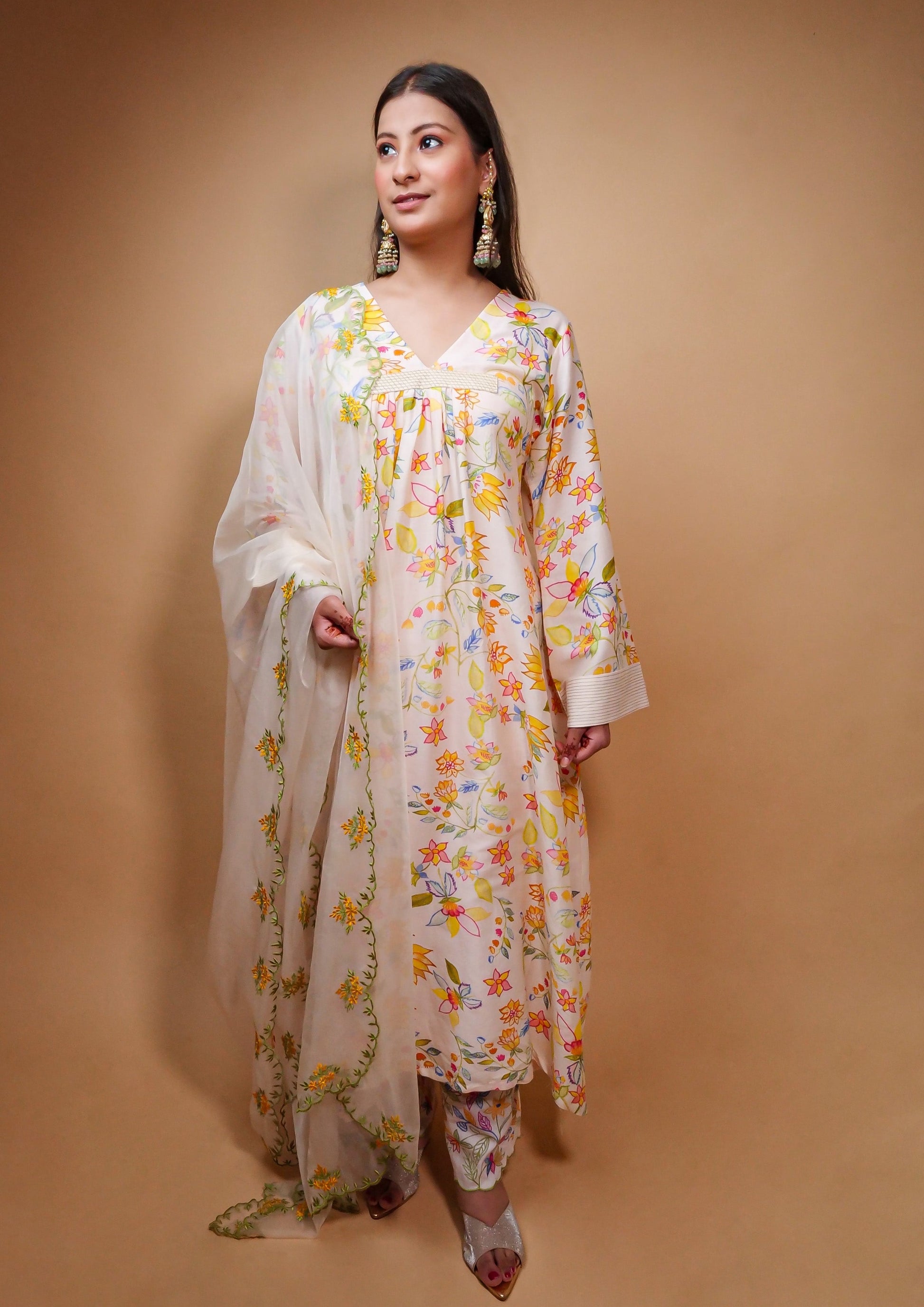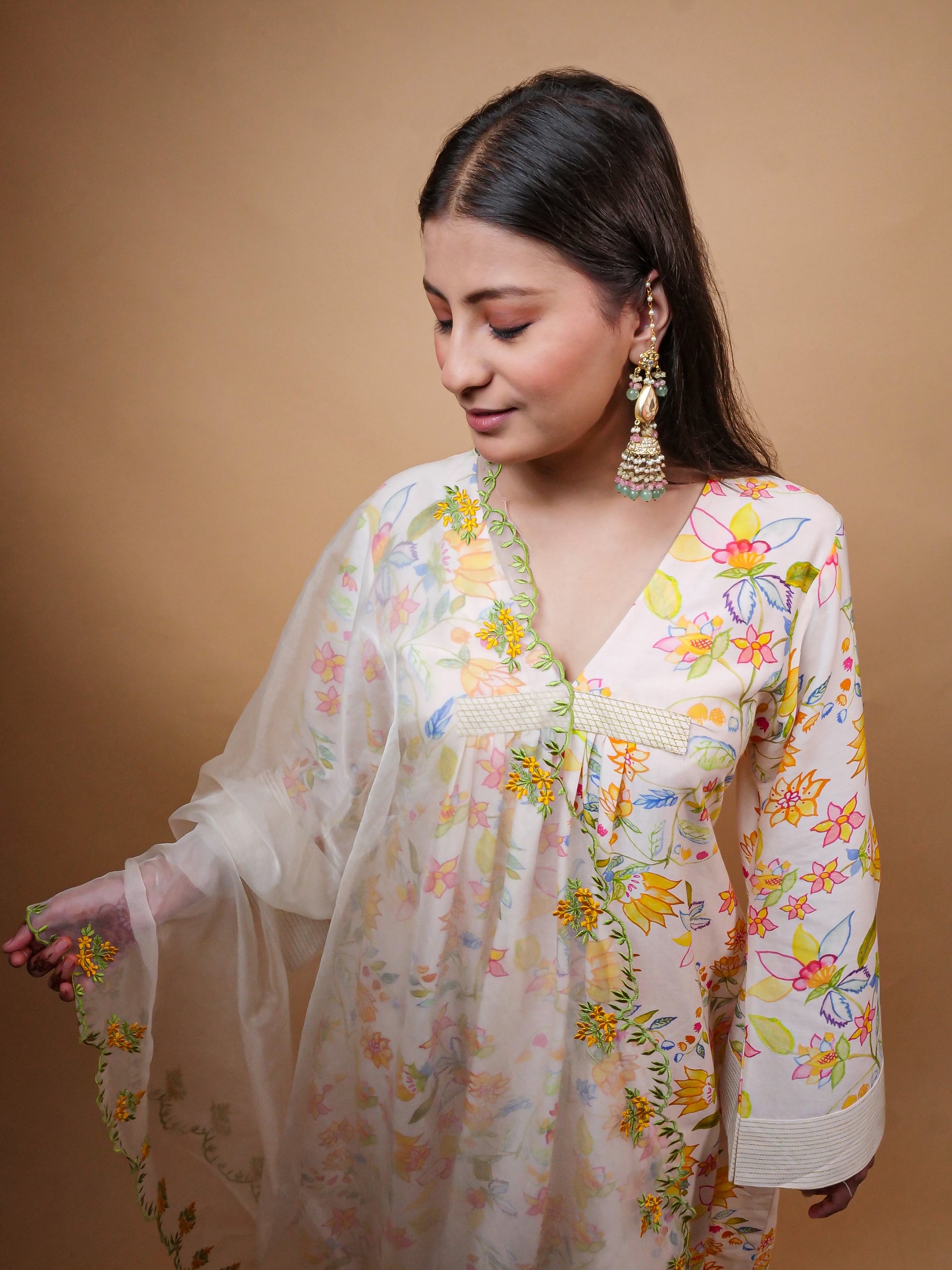 A kurta in chanderi with hand printed florals , cotton pants and an organza Dupatta.Features colourful thread embroidery on pants and dupatta.The kurta is lined with mul.