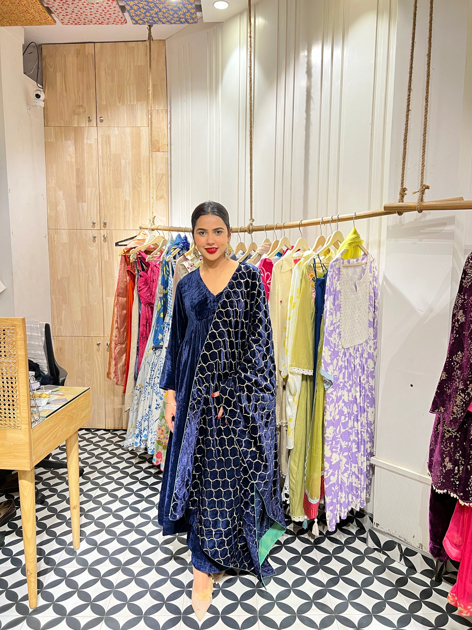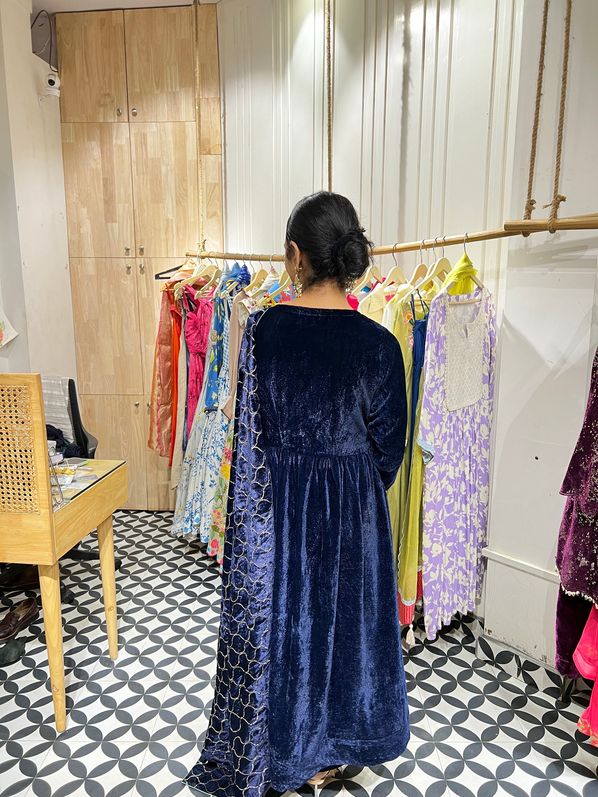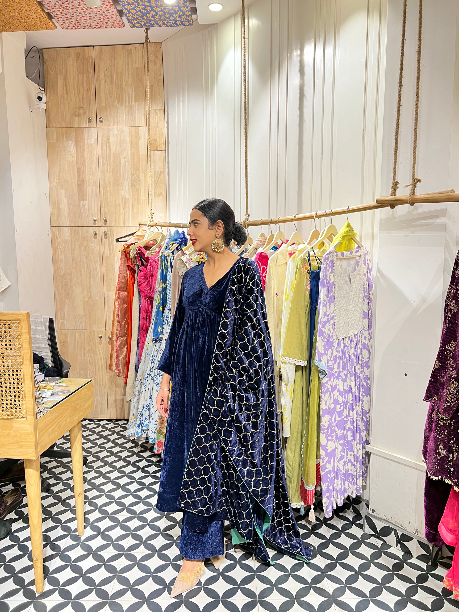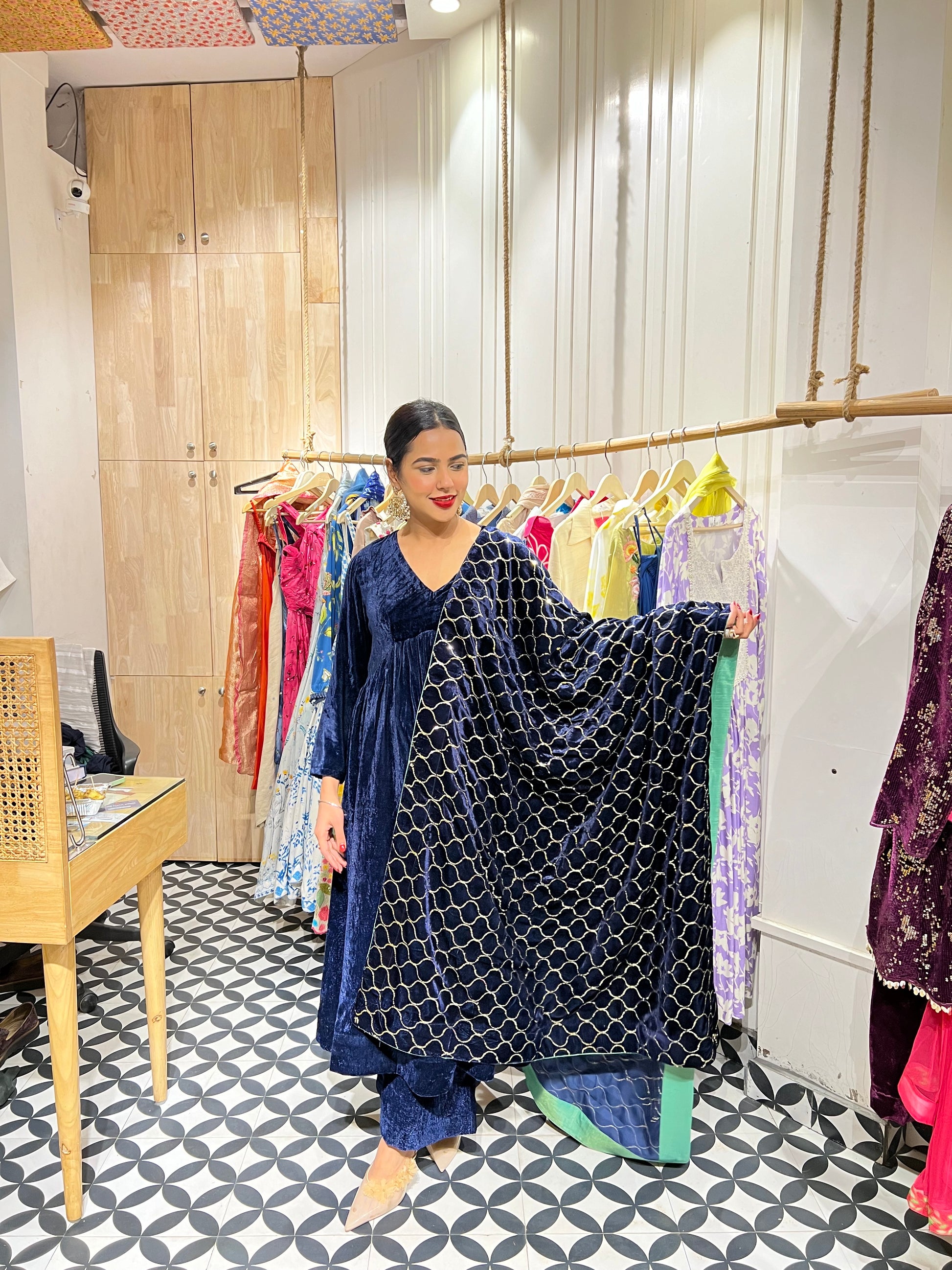 Crafted in rich royal blue velvet, this suit is the perfect blend of elegance and style. Featuring front gathers for a chic silhouette and paired with a shimmering sequin dupatta, it’s designed to make you stand out at any special occasion. A must-have for weddings, parties, and festive celebrations!