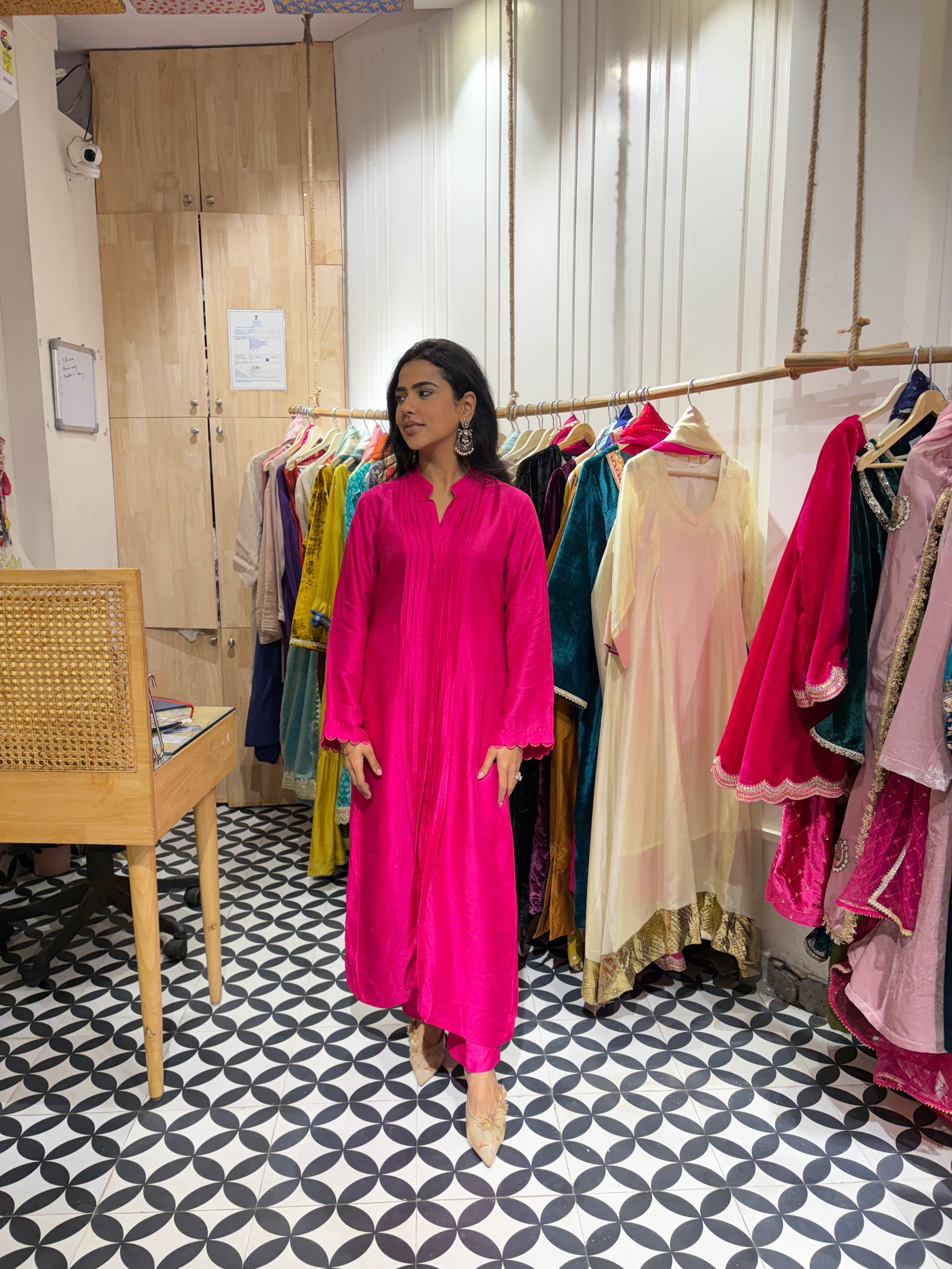 Brighten up gloomy winter days with this hot pink Pashmina kurta, designed for effortless elegance and everyday comfort. Featuring delicate pintex detailing on the kurta, this piece keeps the look minimal, graceful, and timeless.