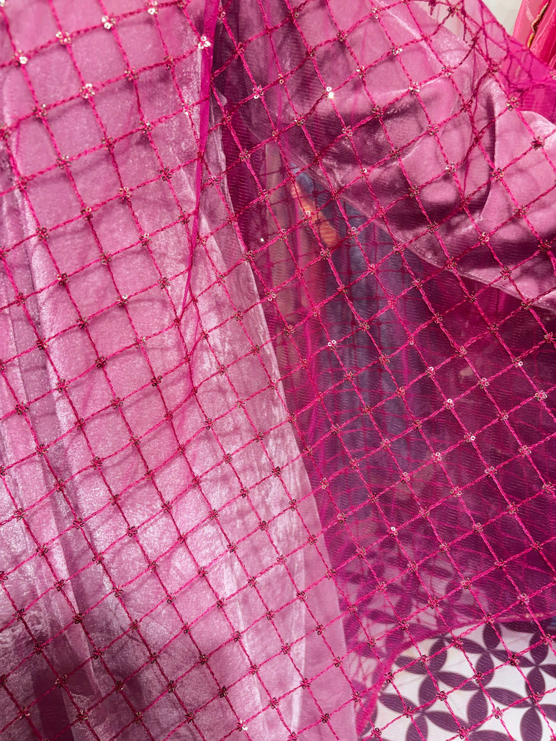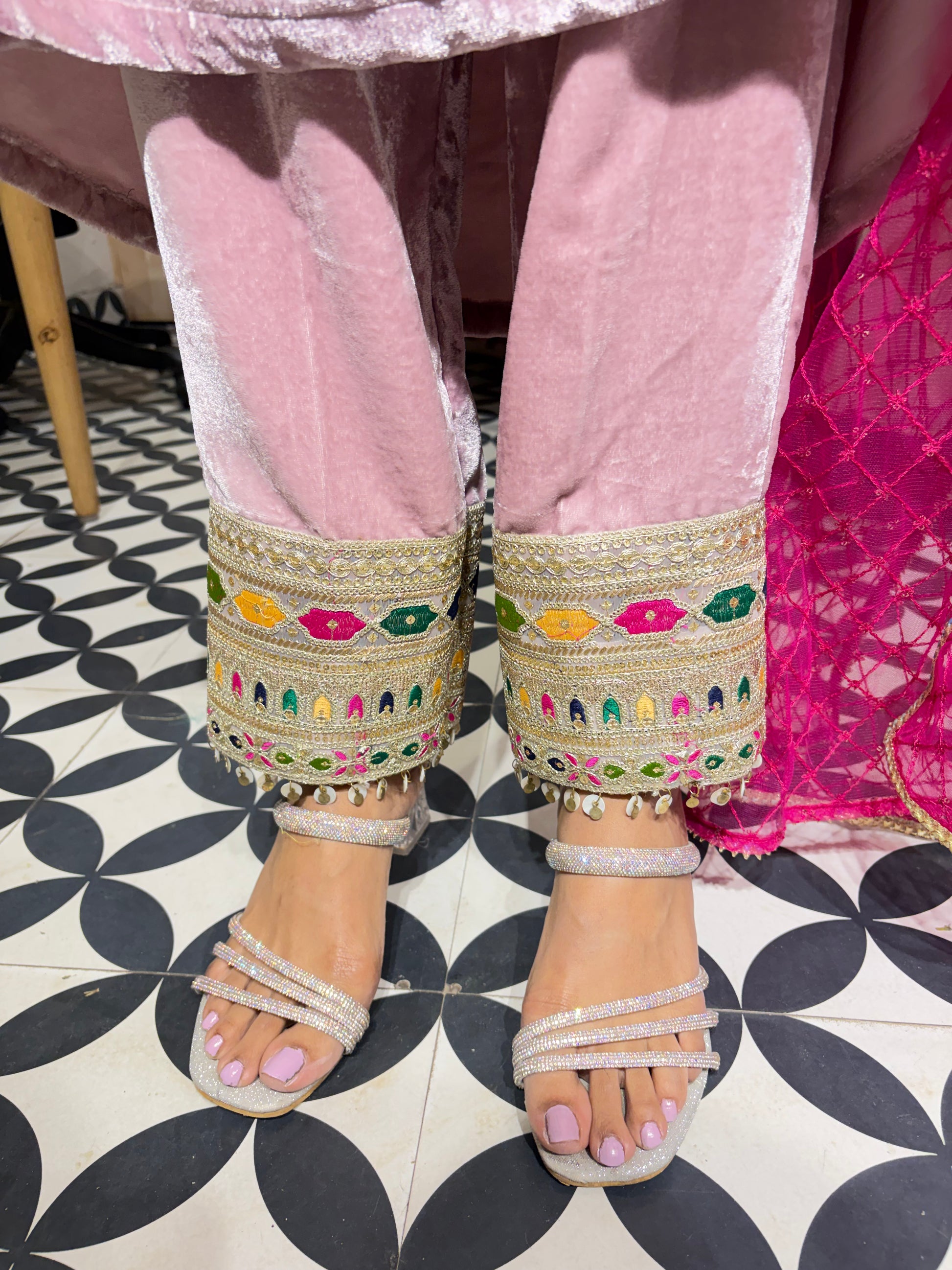This velvet suit set comes in a soft light pink shade paired with a hot pink net dupatta featuring delicate all-over sequin work. The dupatta is finished with lace detailing, adding a refined festive touch. The bottom is designed with layered laces for a premium, elegant look. Warm, soft, and stylish, this set is perfect for winter weddings, festive functions, and evening events. A timeless combination of comfort and luxury for your wardrobe.