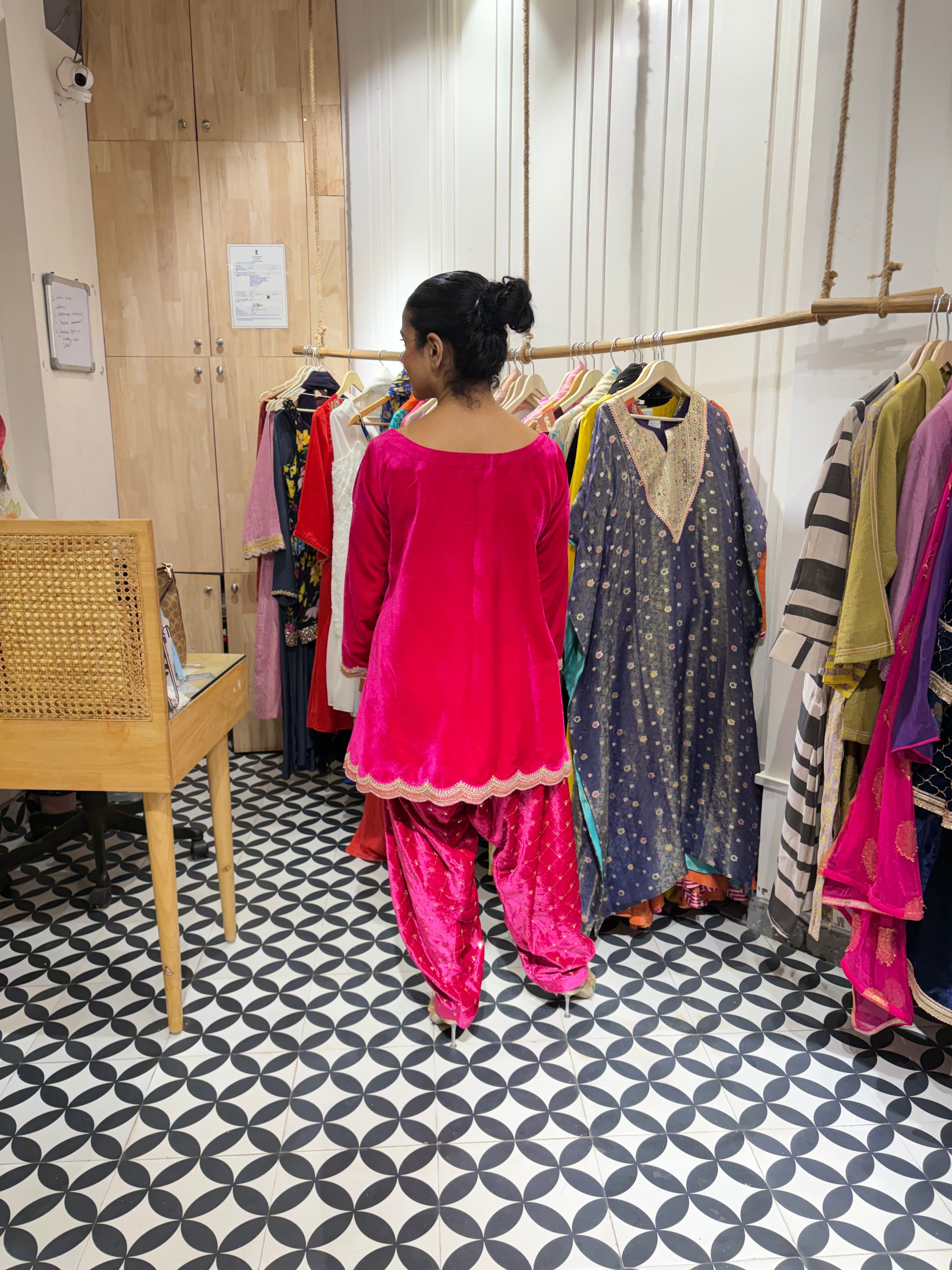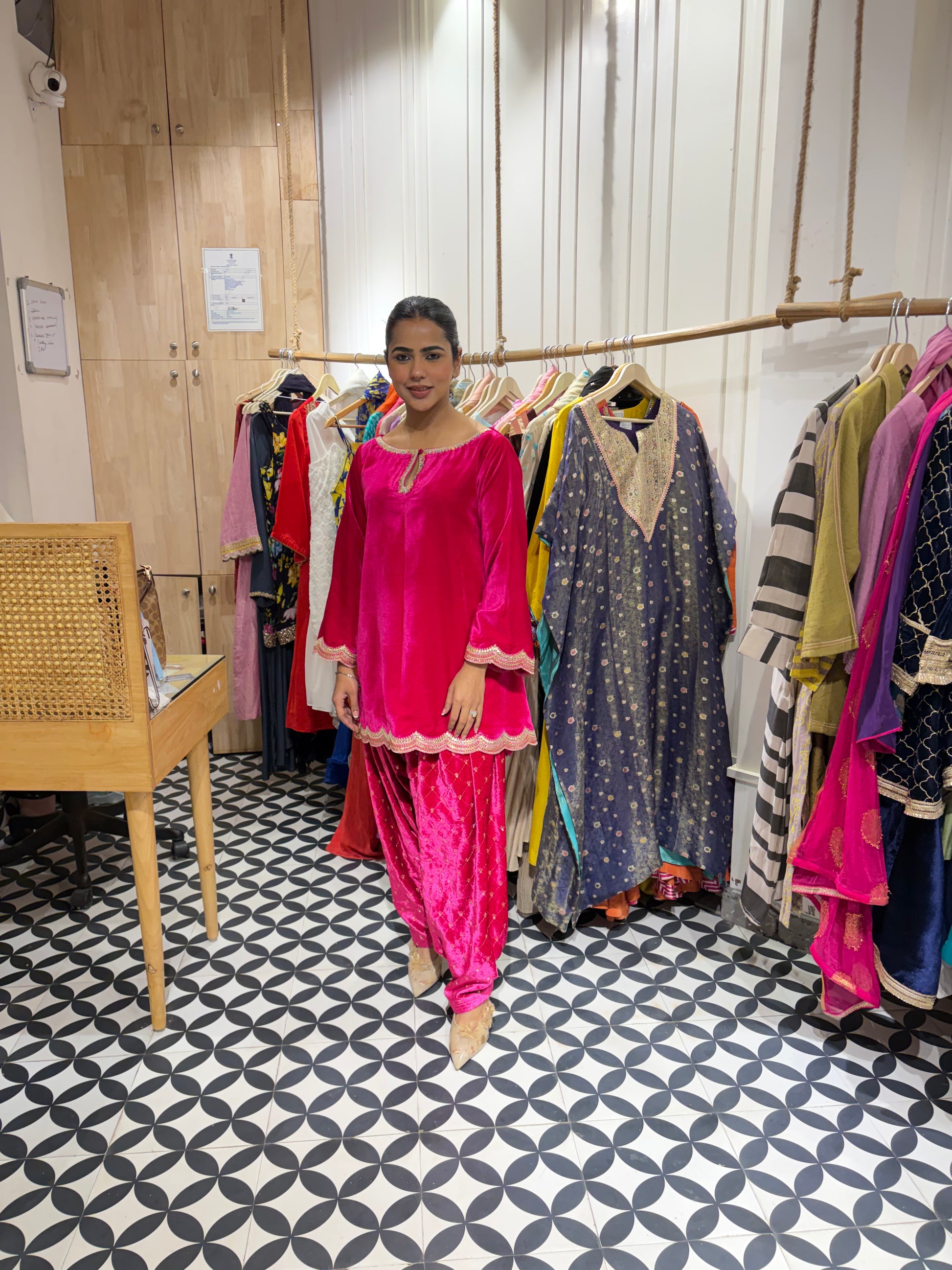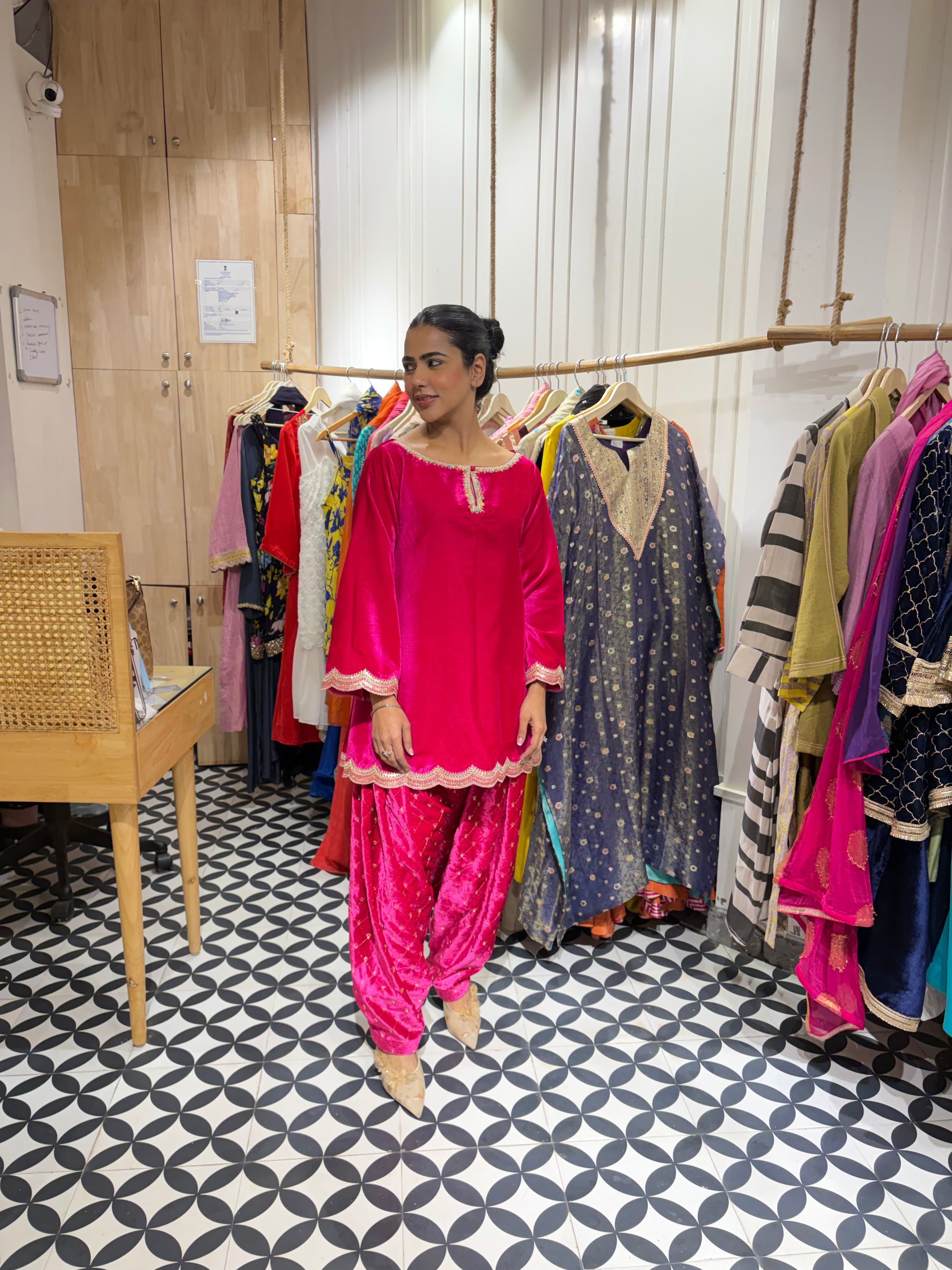 Introducing our Hot Pink Velvet Suit Set, crafted in premium soft velvet with a luxurious festive shine. The top is designed in a flattering A-line silhouette, detailed with scalloped hemline & sleeves and finished with a delicate lace neckline for an elegant touch.
