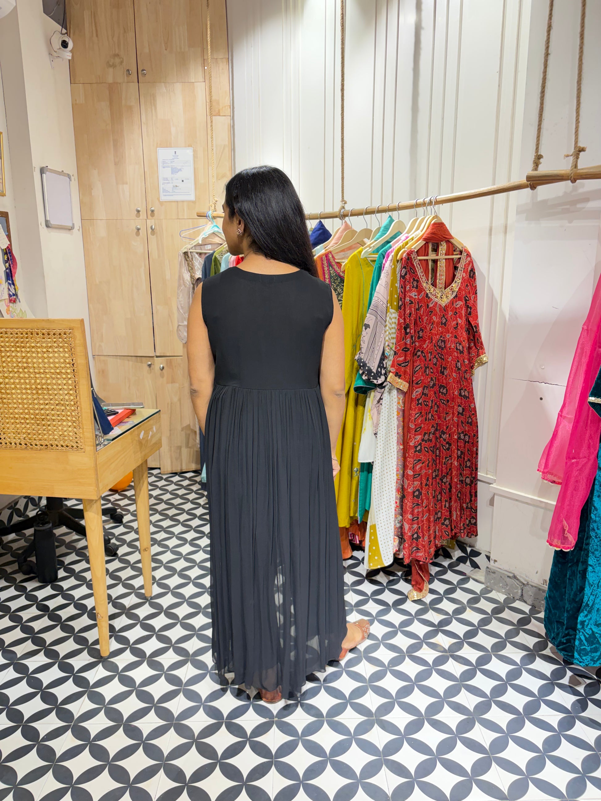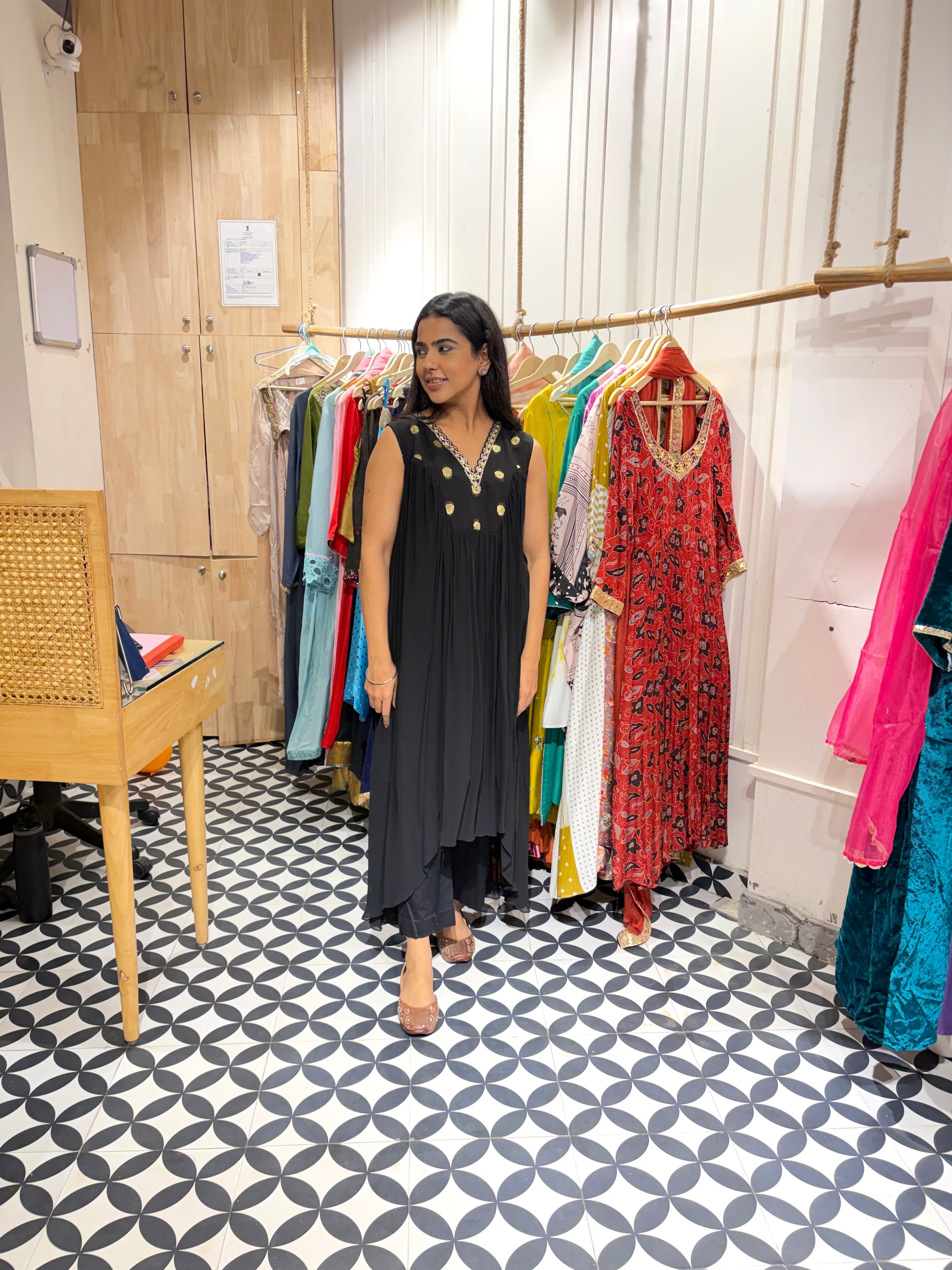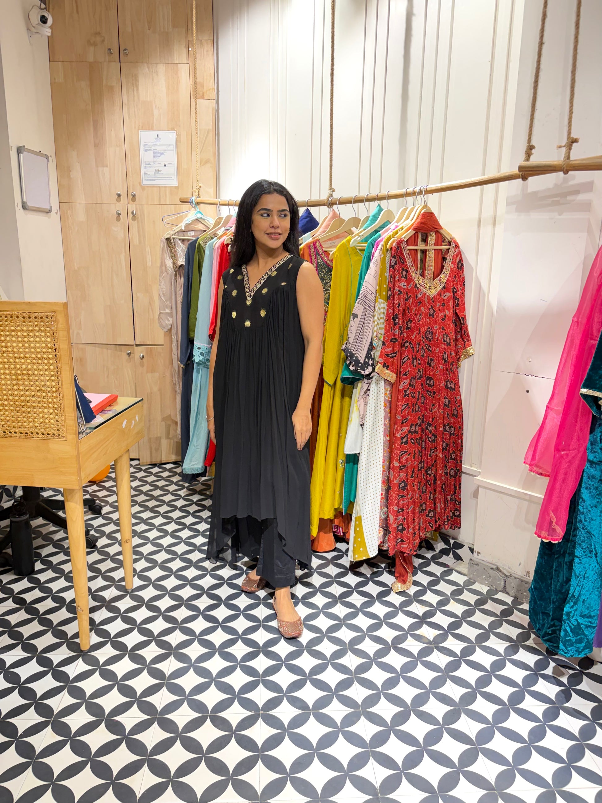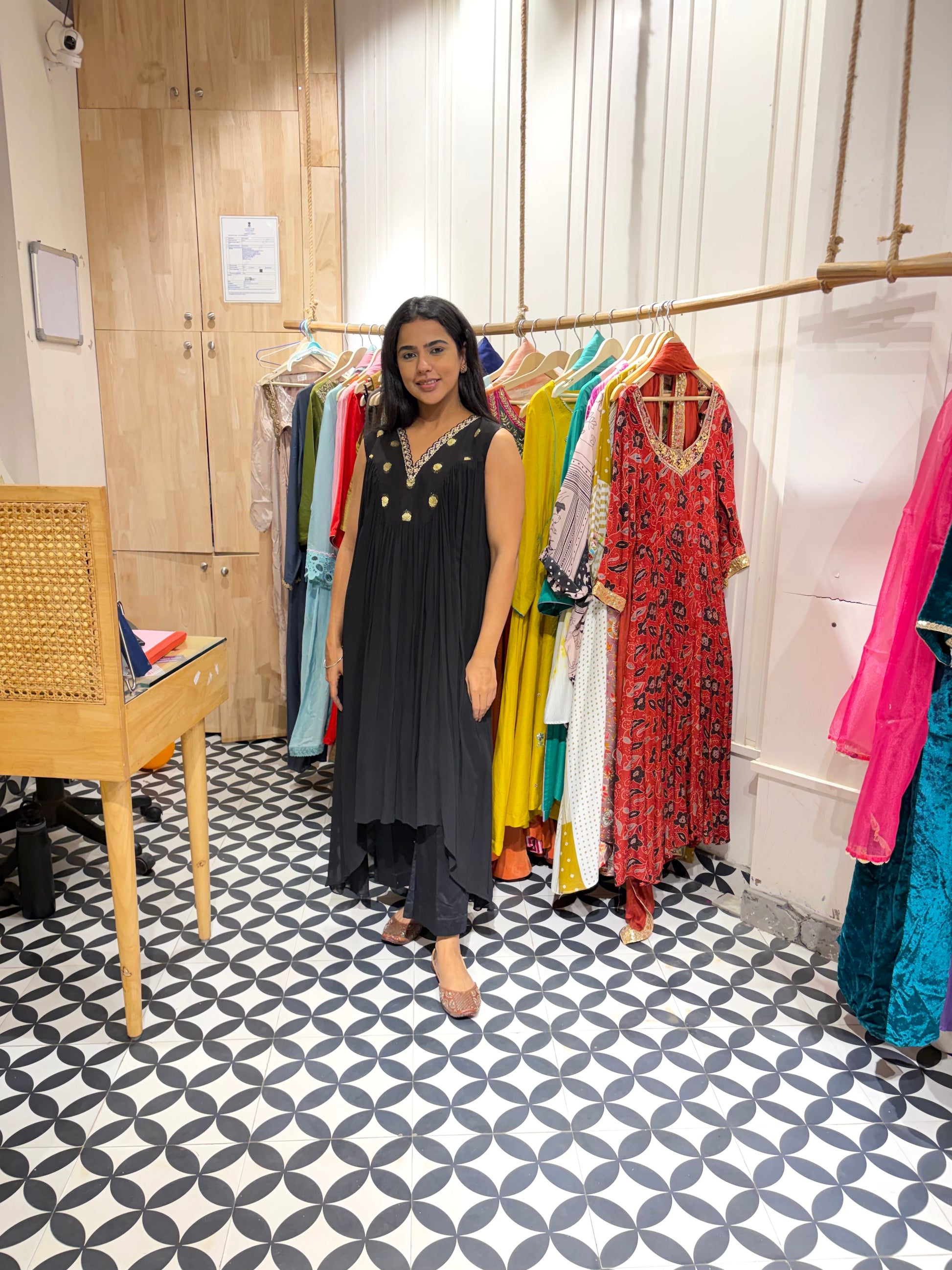 This black georgette suit set brings a perfect balance of simplicity and sophistication. The lightweight georgette top features generous gathers for a soft, flowing look, while the zari-worked yoke adds a hint of festive shine. Finished with elegant lace detailing and paired with a comfortable glace-cotton bottom, this outfit is ideal for those who prefer clean, subtle styling.