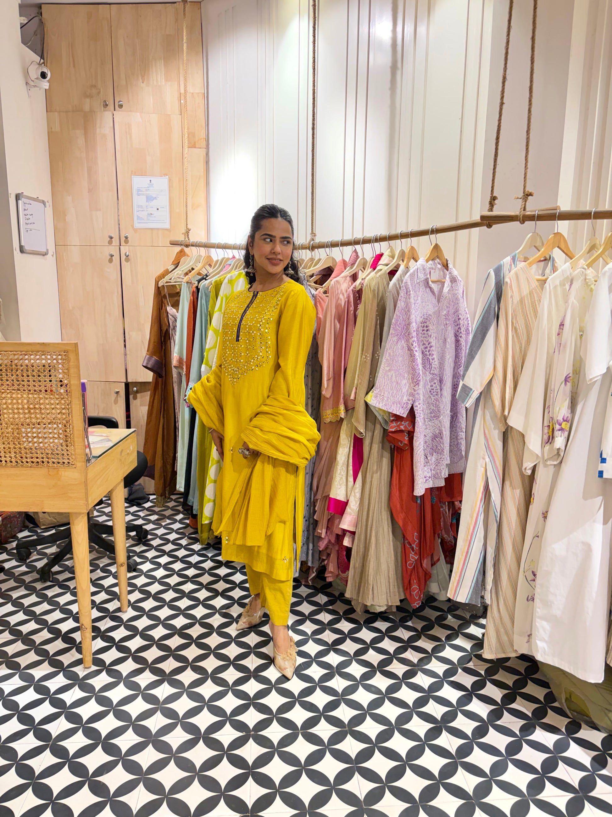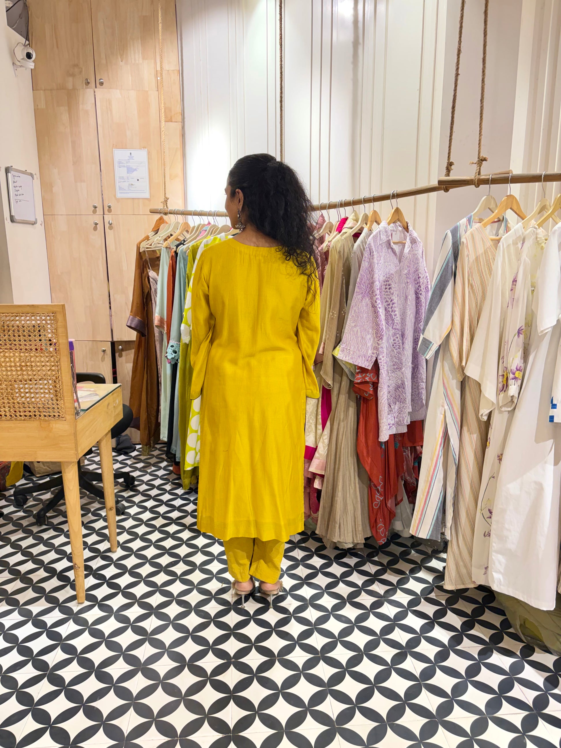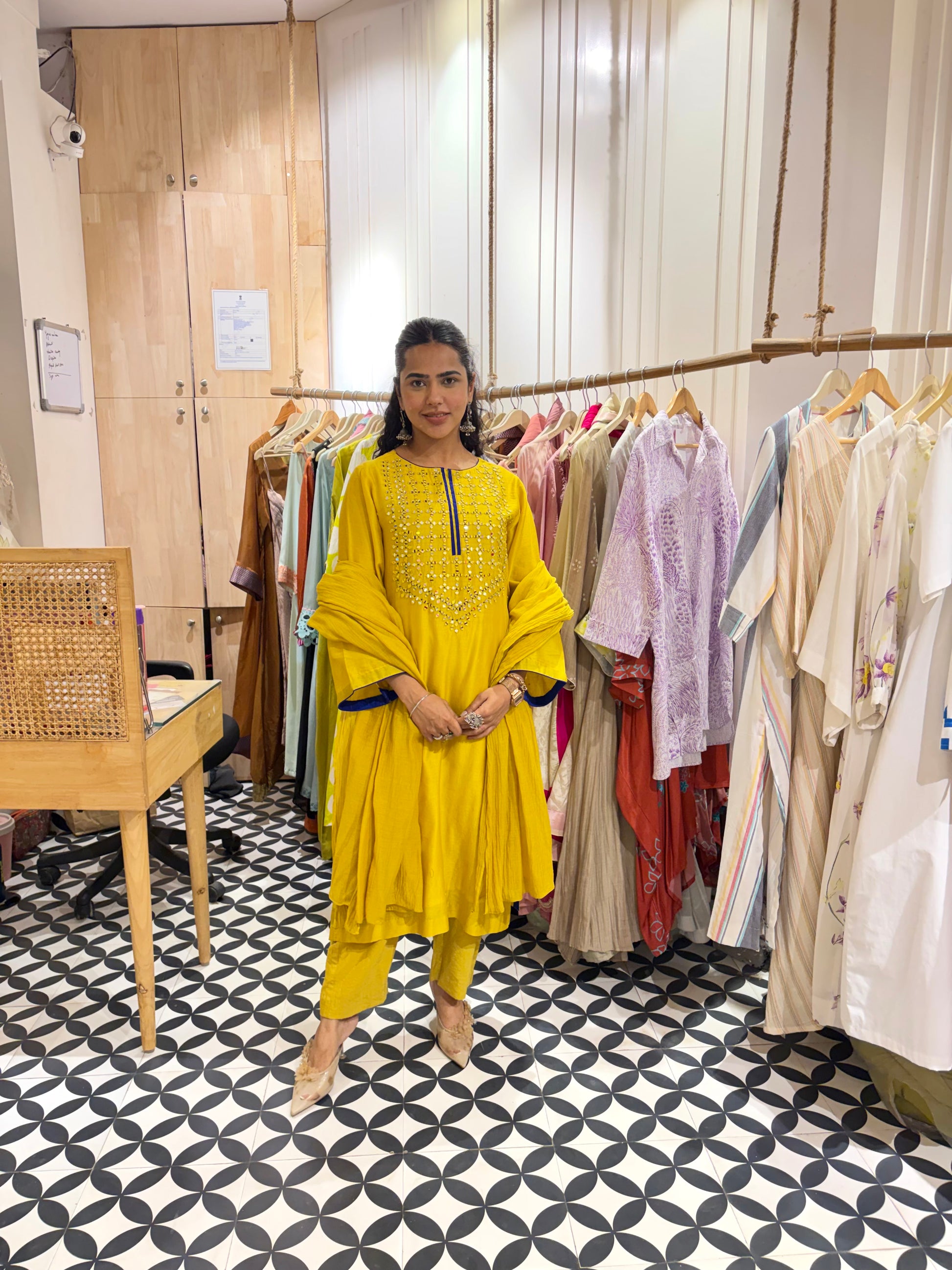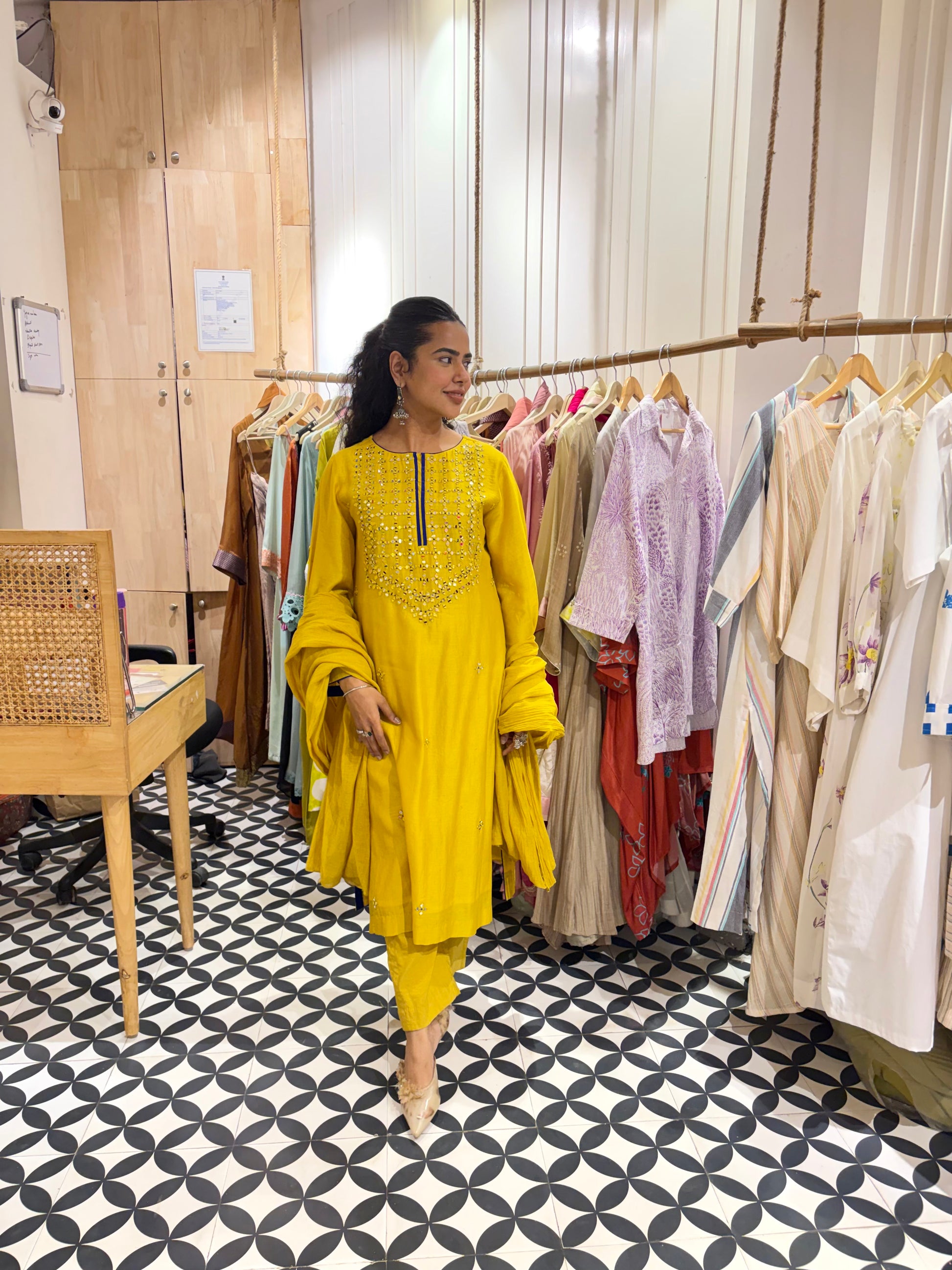 A refined take on festive dressing, this yellow Chanderi silk ensemble is a celebration of quiet elegance and thoughtful detailing. Crafted in pure Chanderi silk, the fabric is known for its lightweight feel, soft sheen, and breathable texture — making it ideal for long hours of wear while still looking effortlessly polished.
