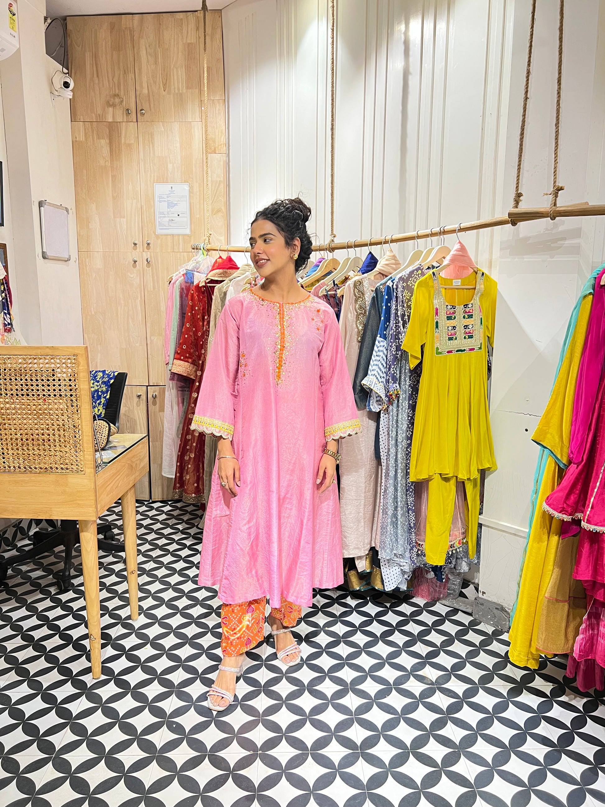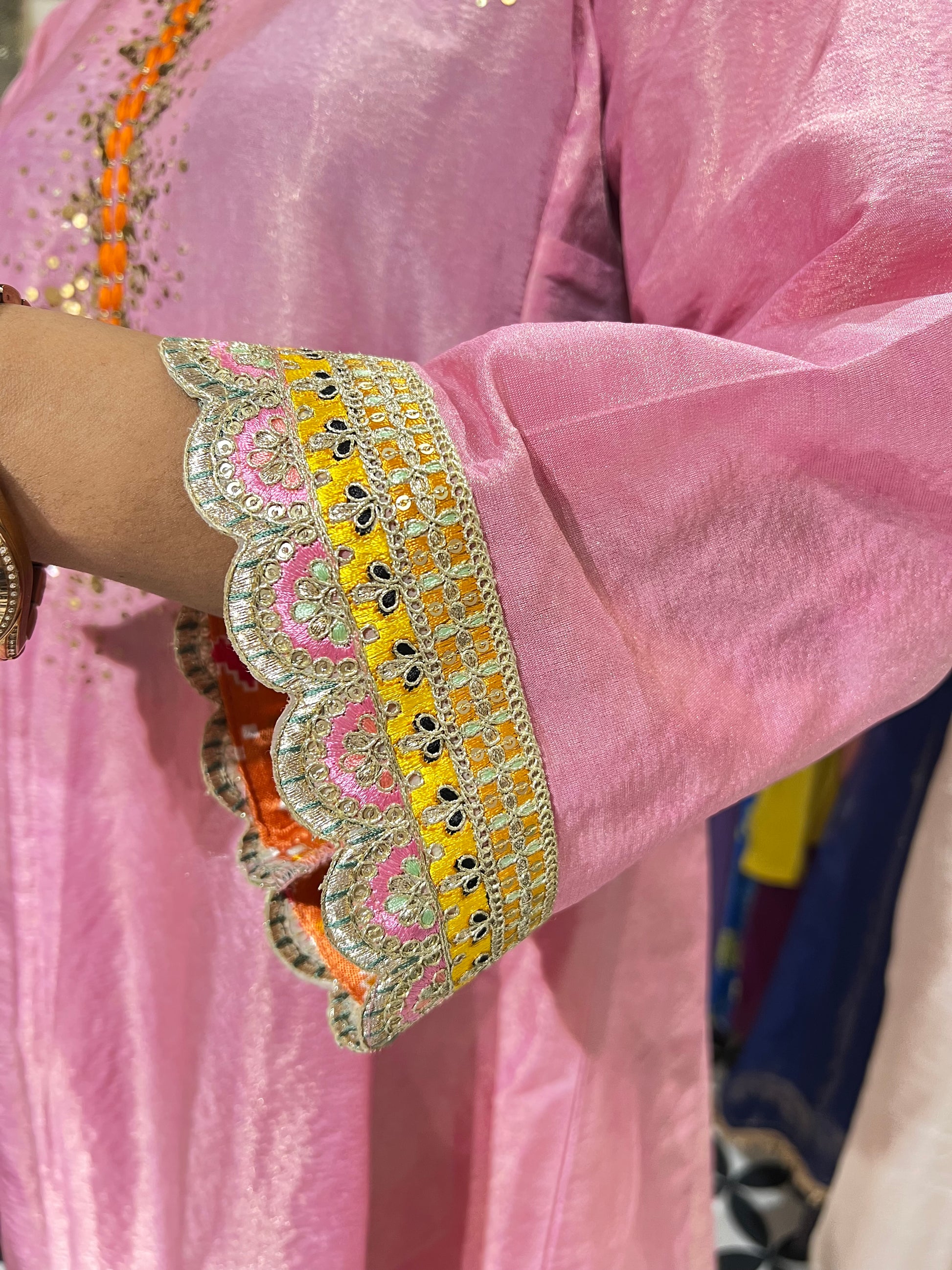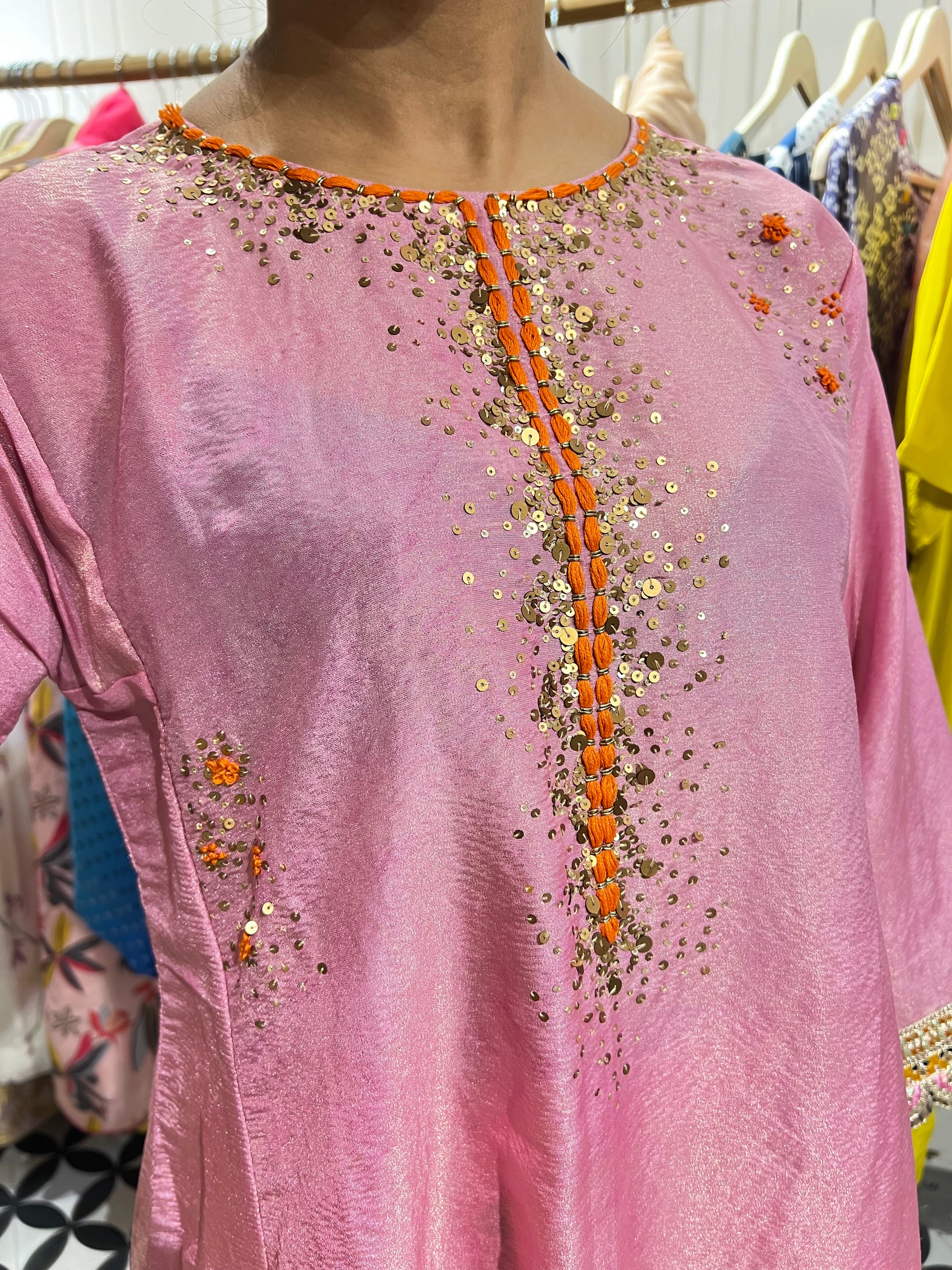 This exquisite tissue suit in pink and orange is a celebration of elegance and color. 💗🧡 Subtle embroidery on the neckline keeps it classy, while the printed Gaji satin bottoms add a cheerful pop of contrast. Ideal for festivals and special occasions, it’s light, comfortable, and effortlessly stylish. Step out in this vibrant ensemble and shine bright wherever you go!