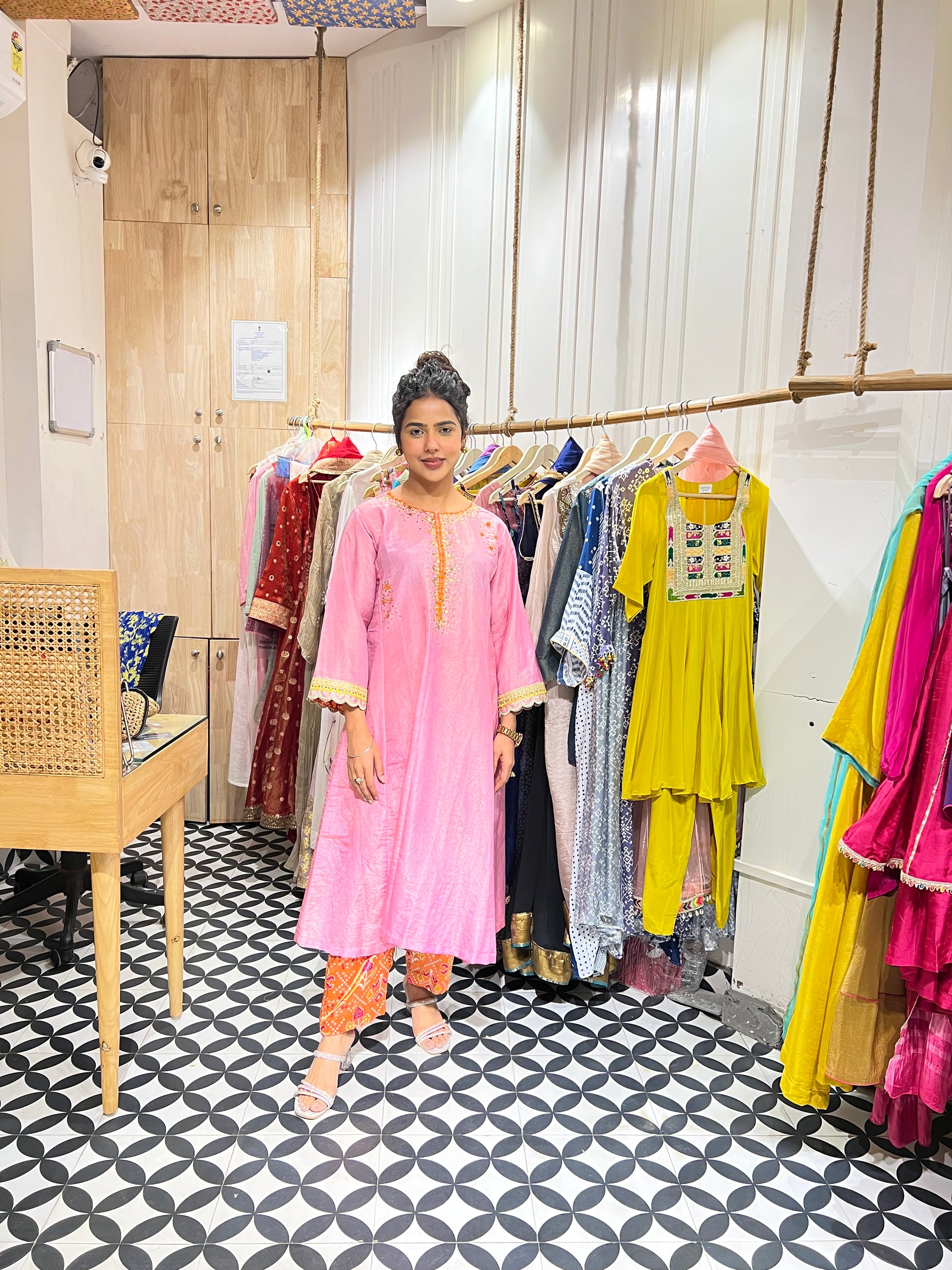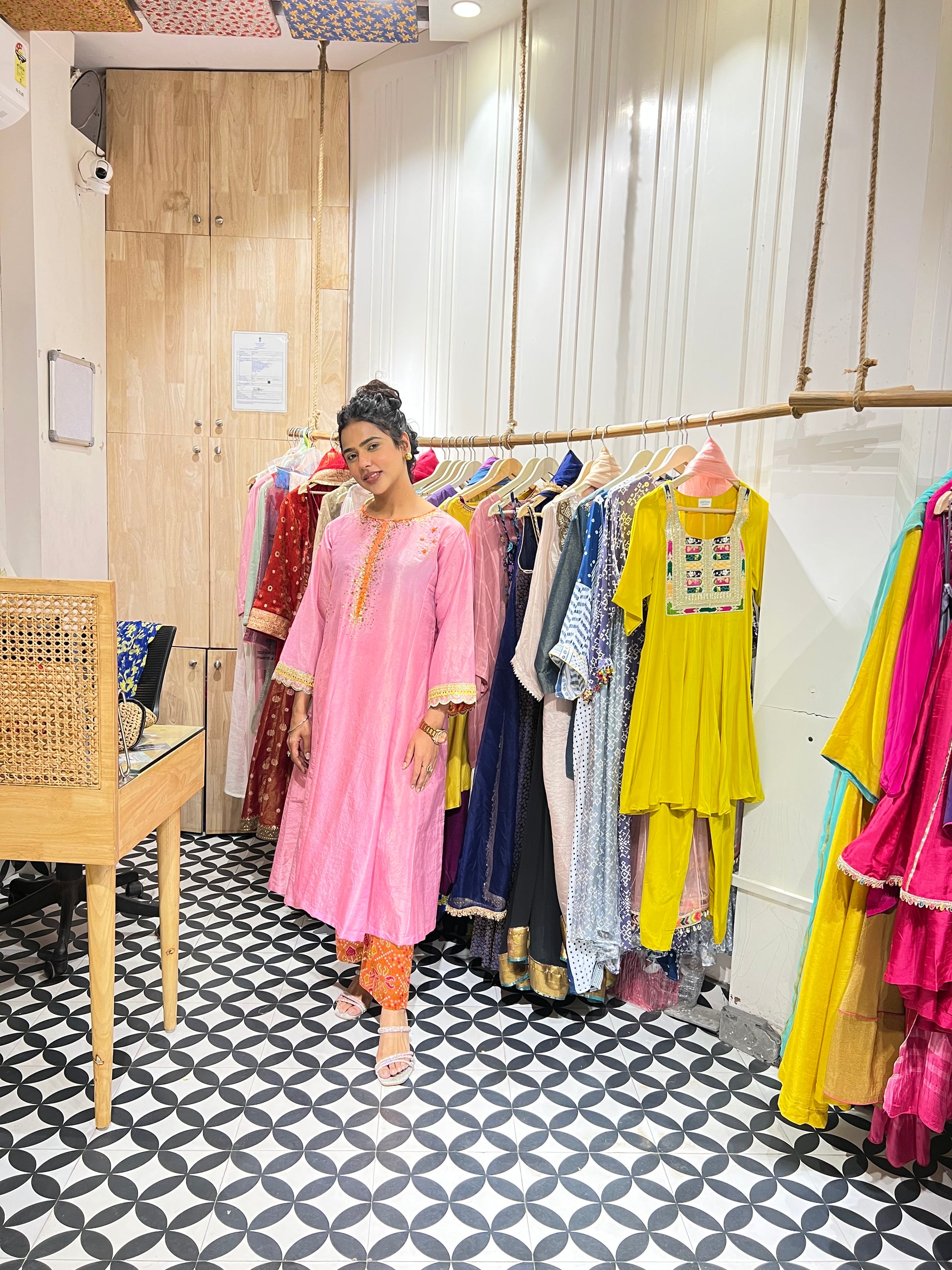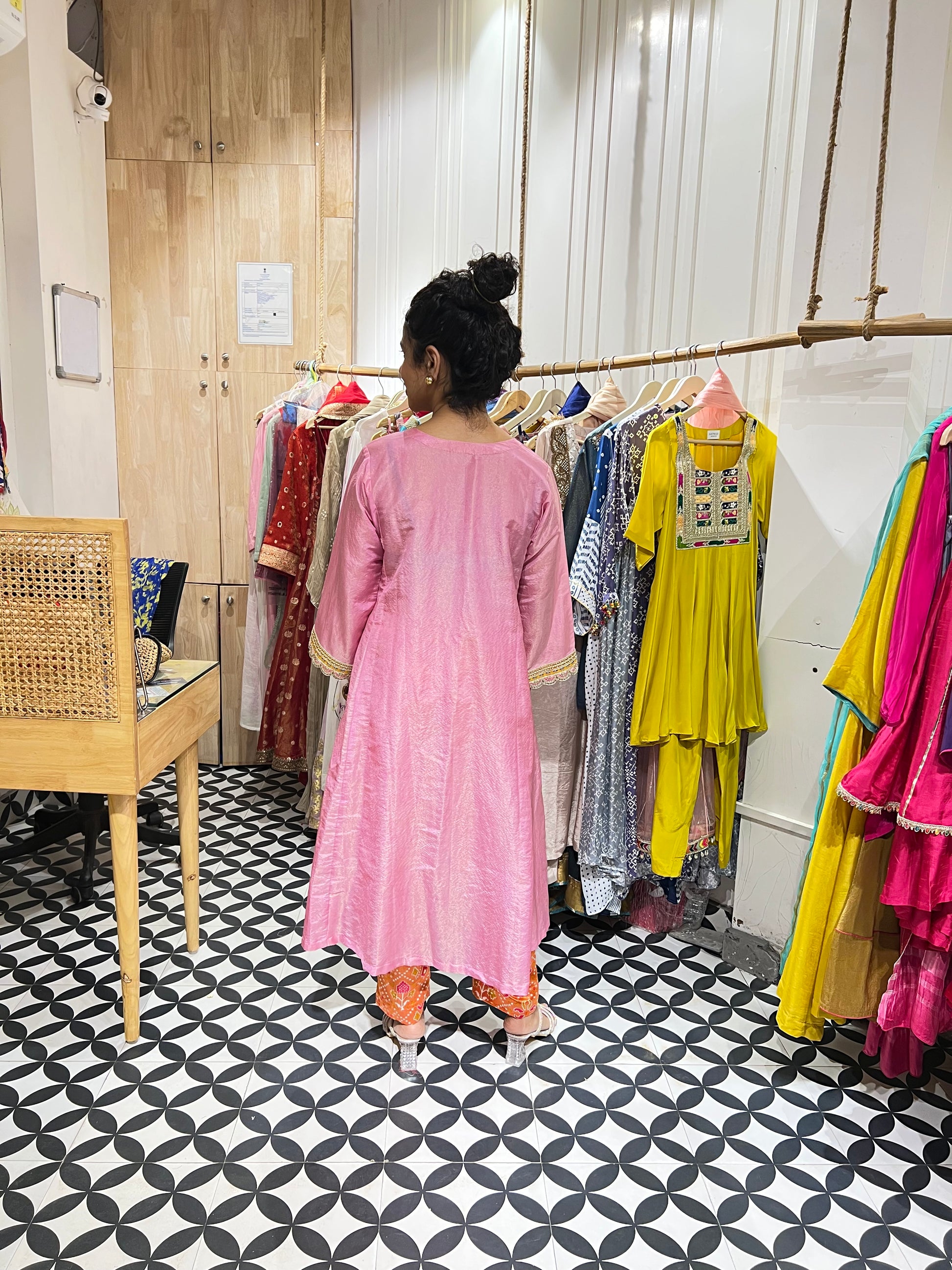 This exquisite tissue suit in pink and orange is a celebration of elegance and color. 💗🧡 Subtle embroidery on the neckline keeps it classy, while the printed Gaji satin bottoms add a cheerful pop of contrast. Ideal for festivals and special occasions, it’s light, comfortable, and effortlessly stylish. Step out in this vibrant ensemble and shine bright wherever you go!