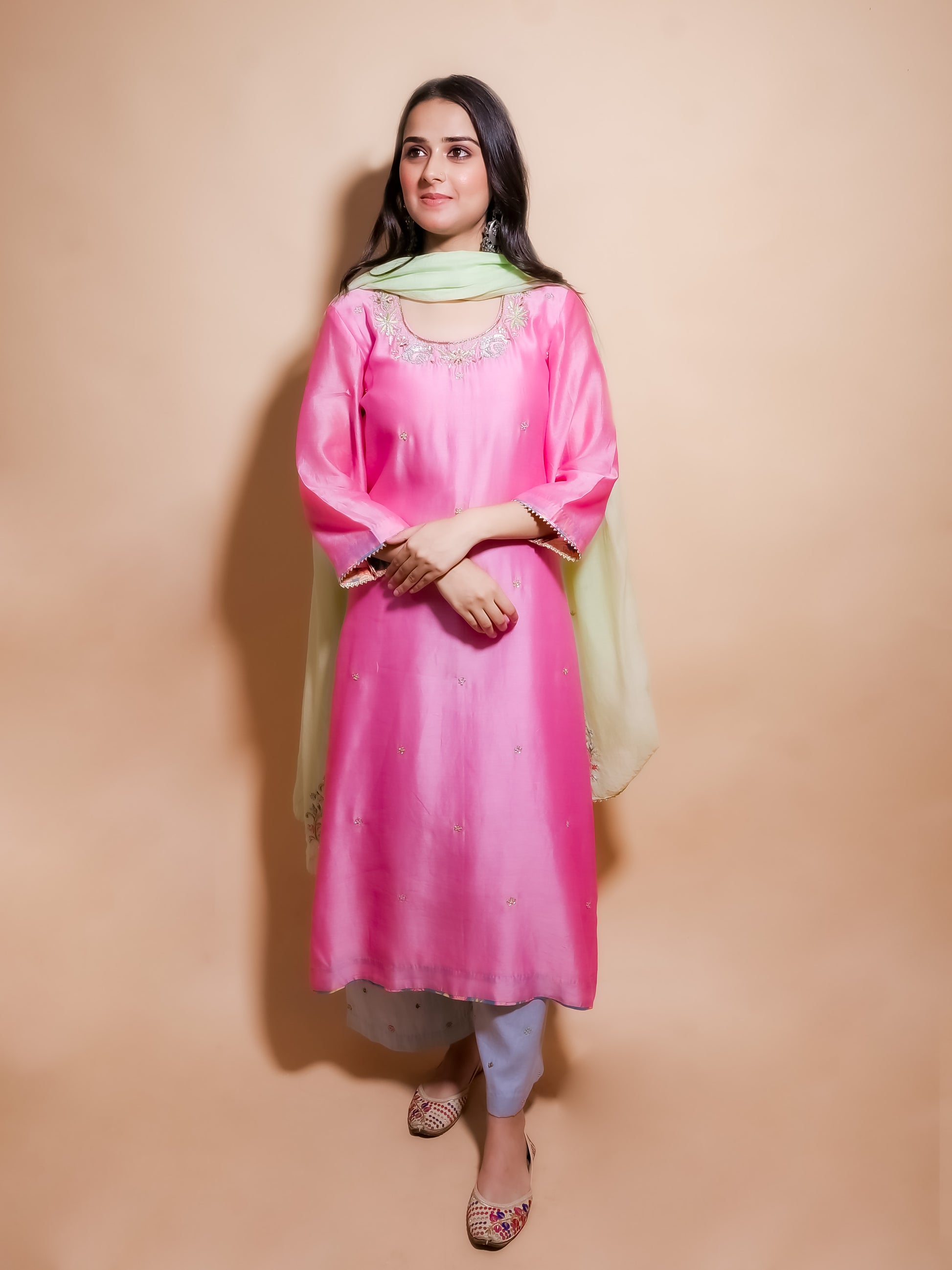 An A-line kurta in chanderi with hand embroidered florals on the neckline and bootis all over . It comes with a hand embroidered cotton pants in a contrast grey colour and a green Chanderi Dupatta with hand embroidered bootis all over . The kurta is finished with printed facing and is lined with mul. The dupatta is finished with a gota kinari.