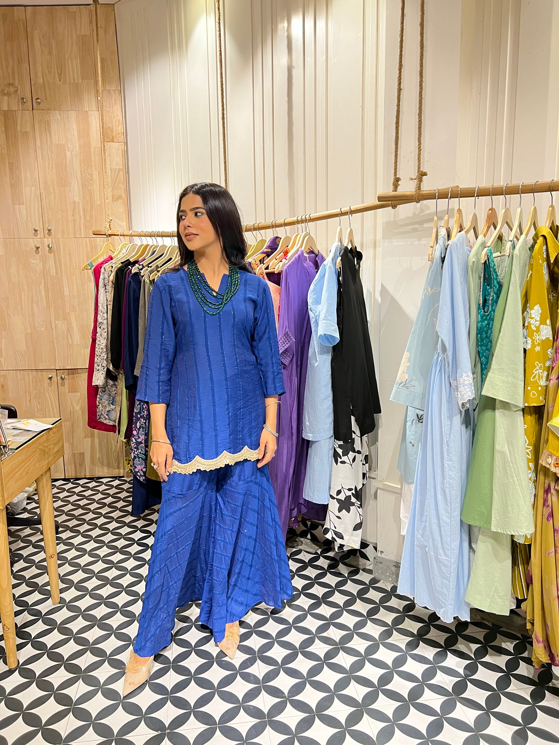 The kurta is short in length and finished with lace detailing on the hem, and the set is completed with a matching sharara for a breezy, elegant silhouette. A perfect pick for festive brunches, mehendi functions, or ethnic evenings.