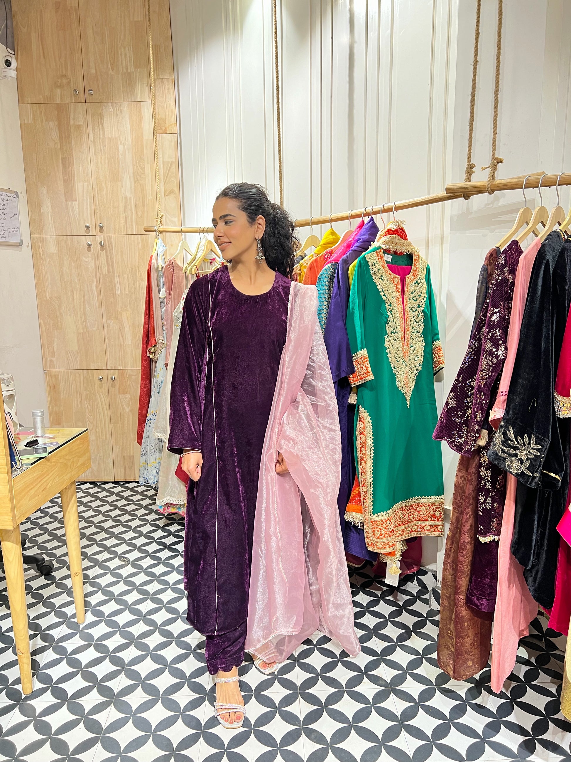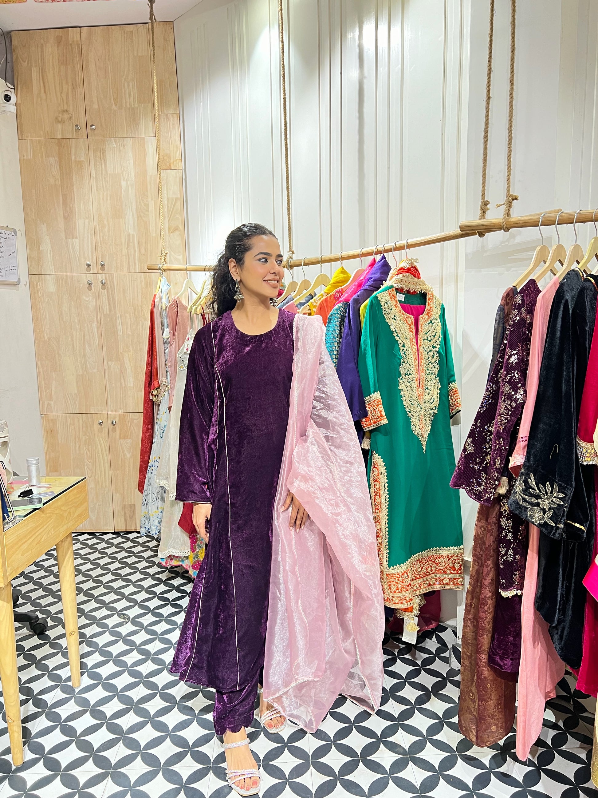This velvet set features a matching top and bottom in the same rich hue, highlighted with subtle light-colored piping for a refined touch. Paired with an airy organza dupatta, it beautifully balances opulence and elegance. The soft texture of velvet adds warmth and luxury, while the sheer dupatta brings lightness to the look. Perfect for festive evenings and special occasions. A timeless blend of sophistication and comfort.