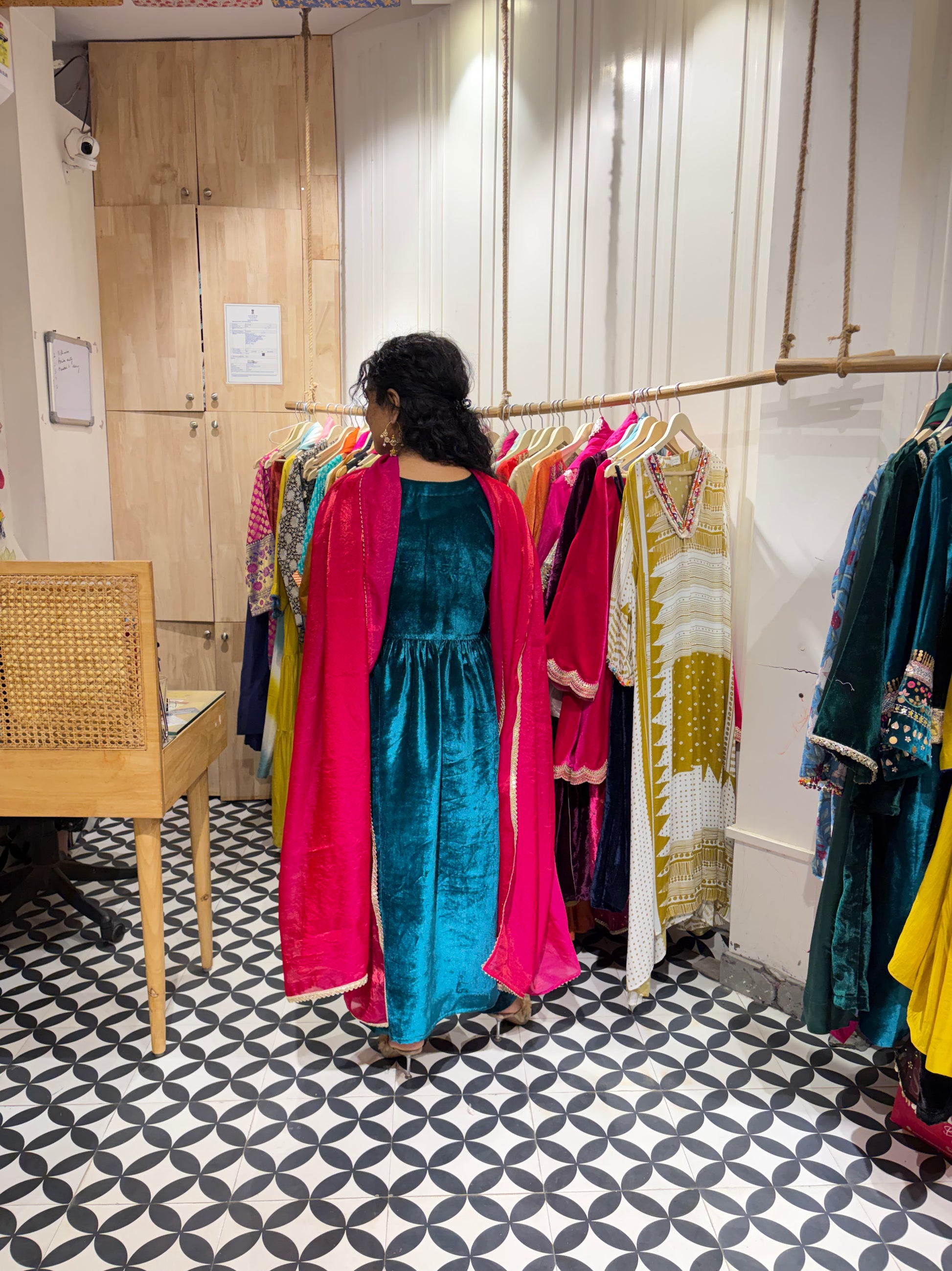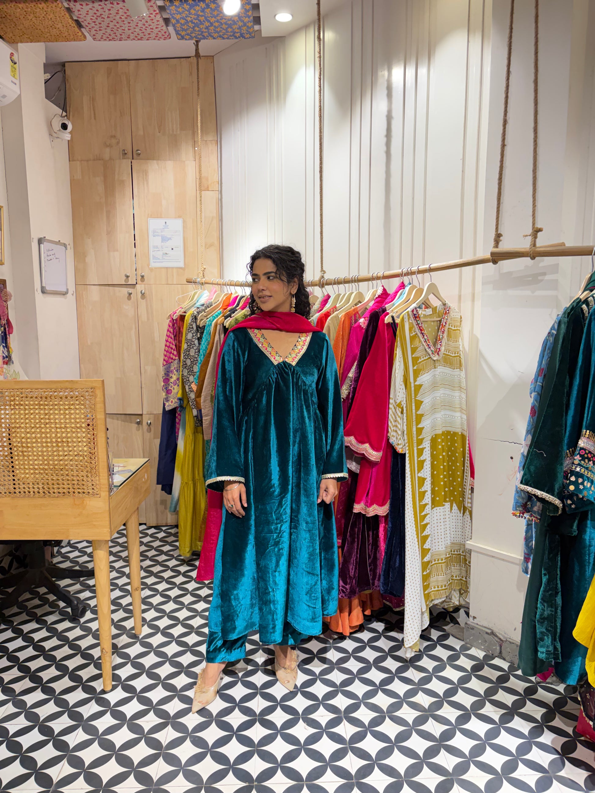 This elegant alia cut suit set features a rich turquoise velvet top and bottom, detailed with delicate lace on the neckline and subtle trims on the sleeves. It is paired with a premium hot pink glass organza dupatta that adds a soft shine and is lightweight, easy to manage, and flowy. Designed for winter weddings, festive gatherings, and evening celebrations, this piece offers a perfect balance of comfort, elegance, and value. A versatile velvet outfit you can style effortlessly across occasions.
