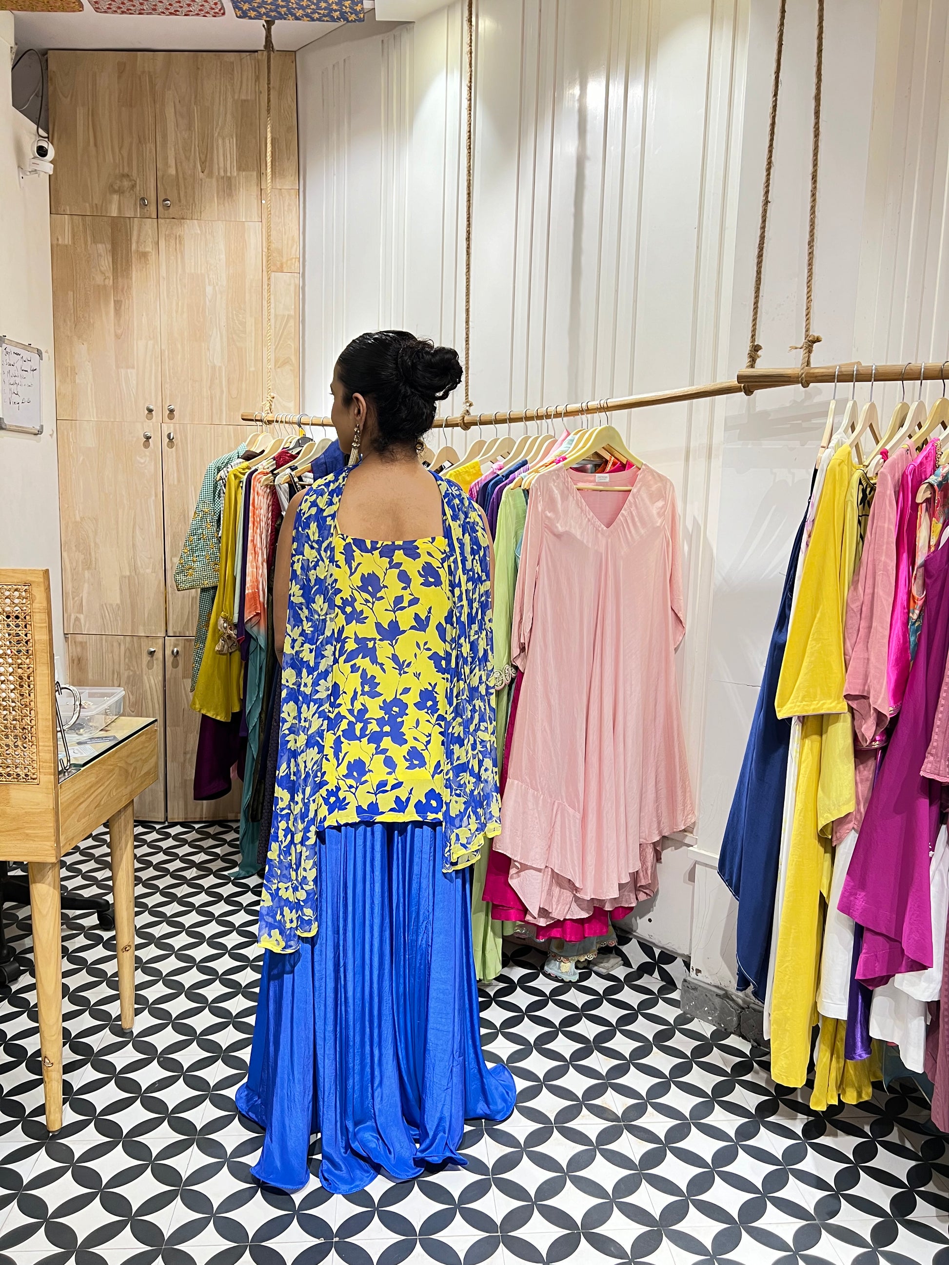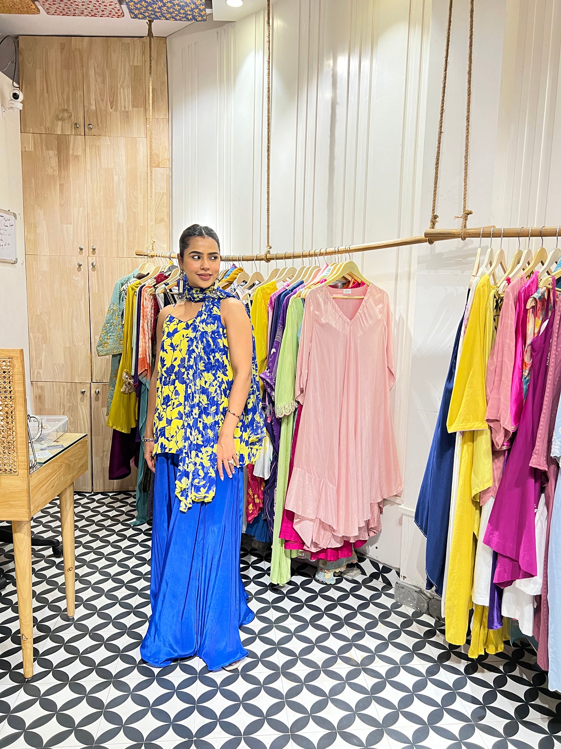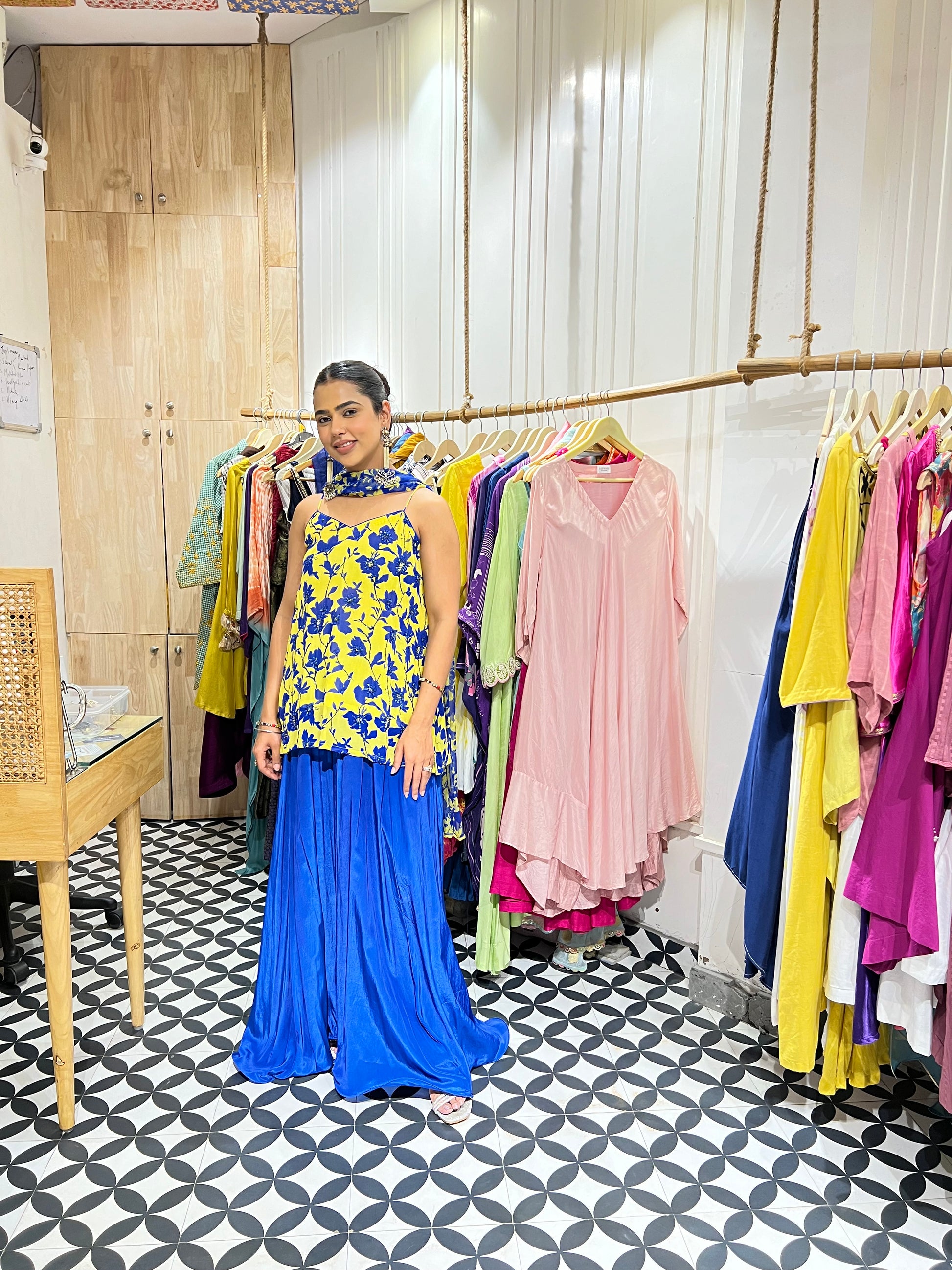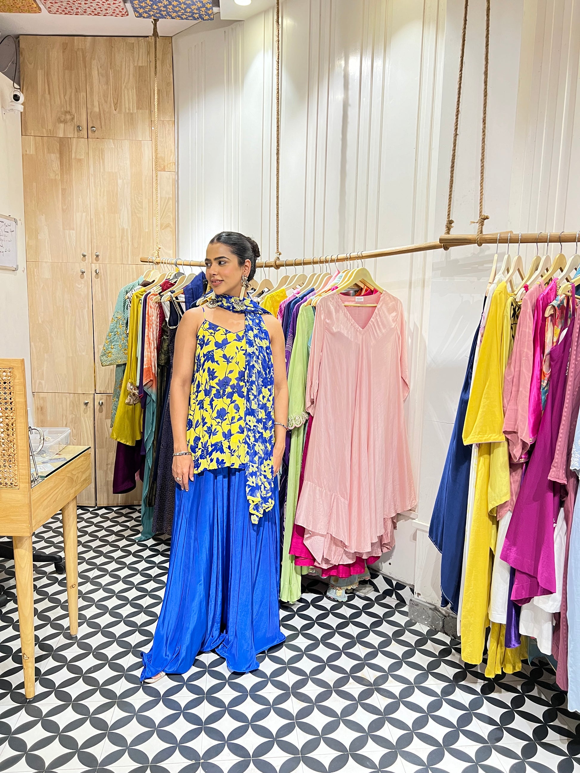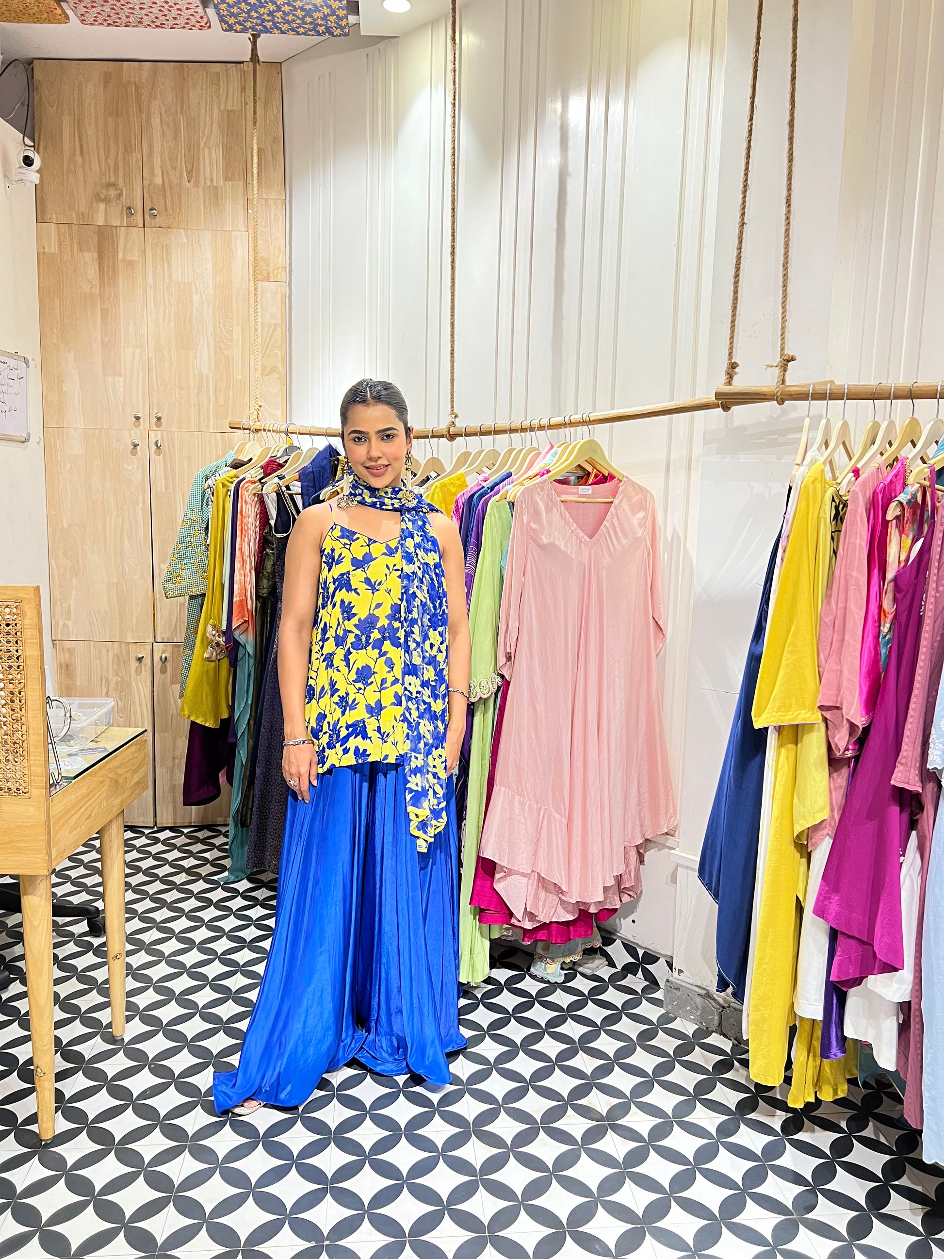 This suit set brings together artistry and comfort - a georgette kurta detailed with fine hand embroidery, a chiffon dupatta in striking reversed hues, and a breezy crepe sharara that flows with ease. Finished in our signature SATWAH print 💛.it’s a piece that feels refreshing, modern, and rooted in craft at the same time.