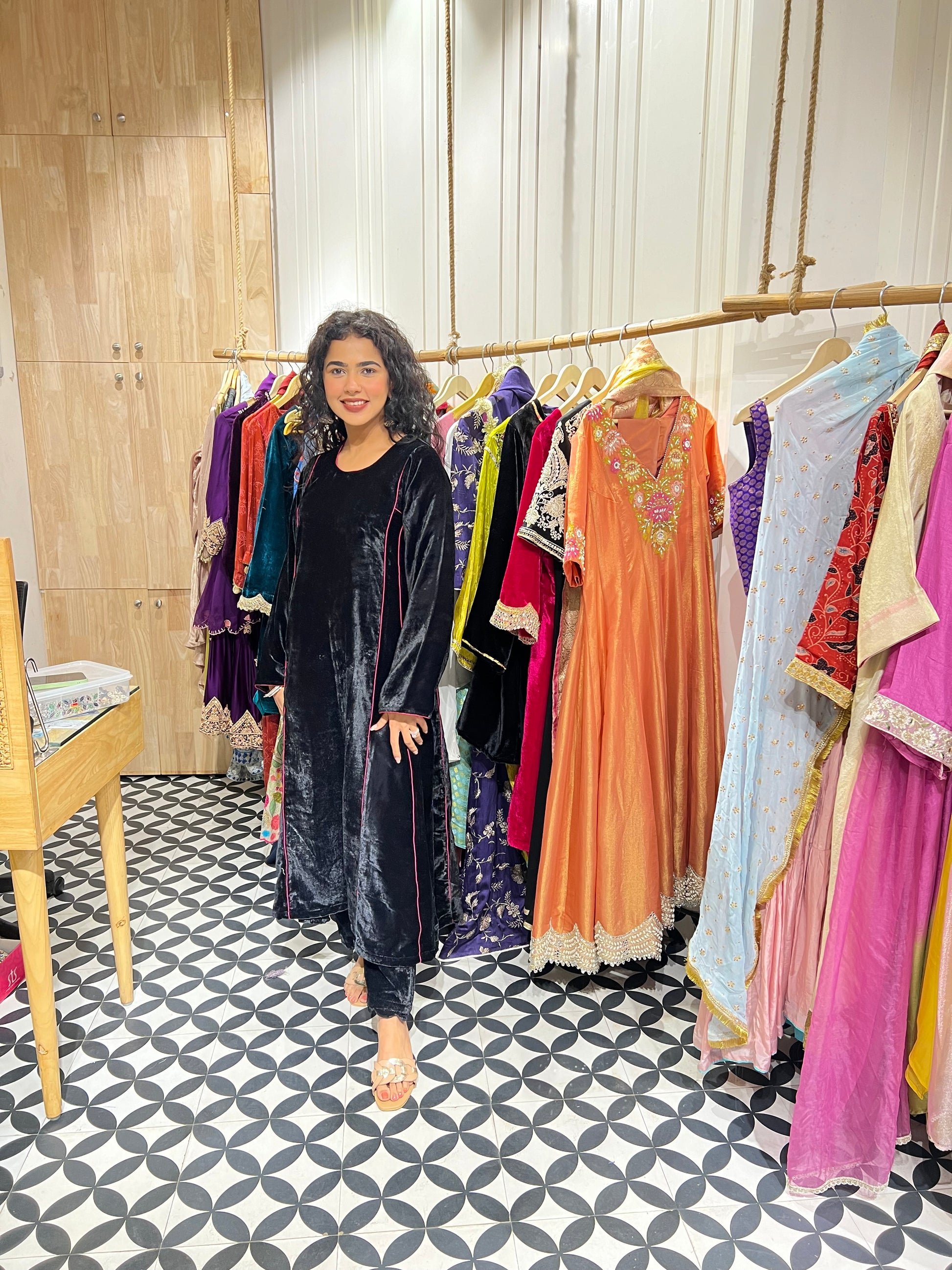 This velvet coord set features a matching top and bottom in the same rich hue, highlighted with hot pink piping for a refined touch. The soft texture of velvet adds warmth and luxury, making it perfect for festive evenings and special occasions. Designed to balance comfort and elegance, it exudes effortless sophistication. A timeless addition to your wardrobe that speaks understated glamour.