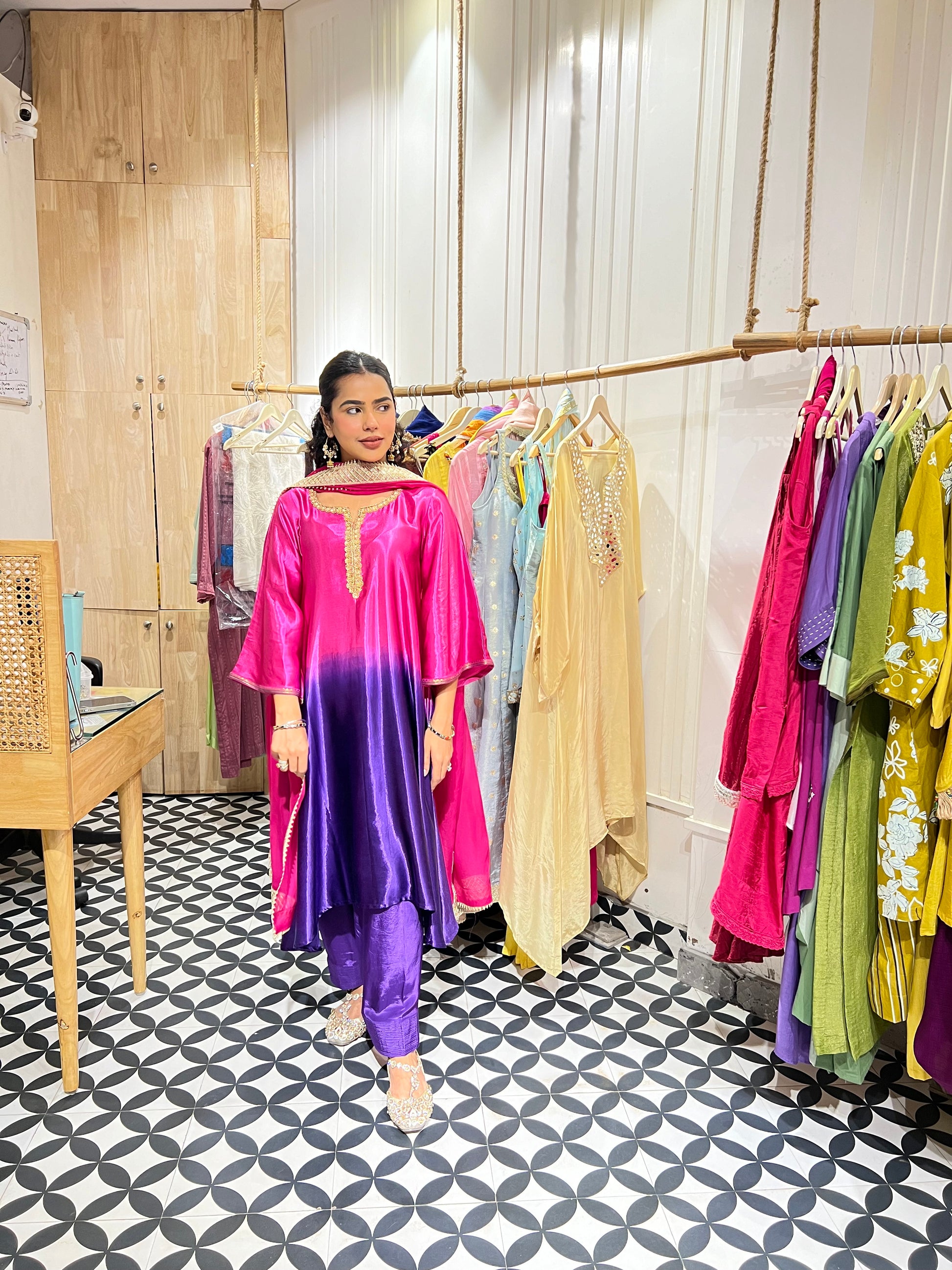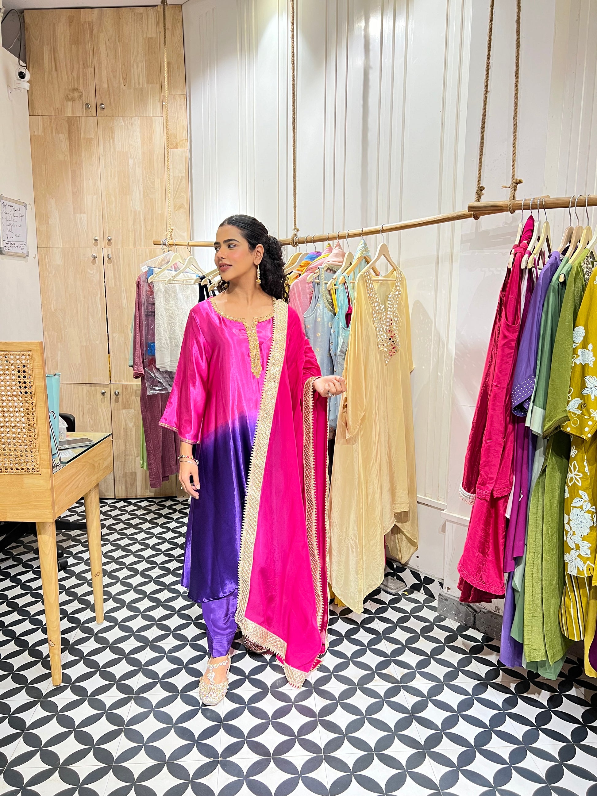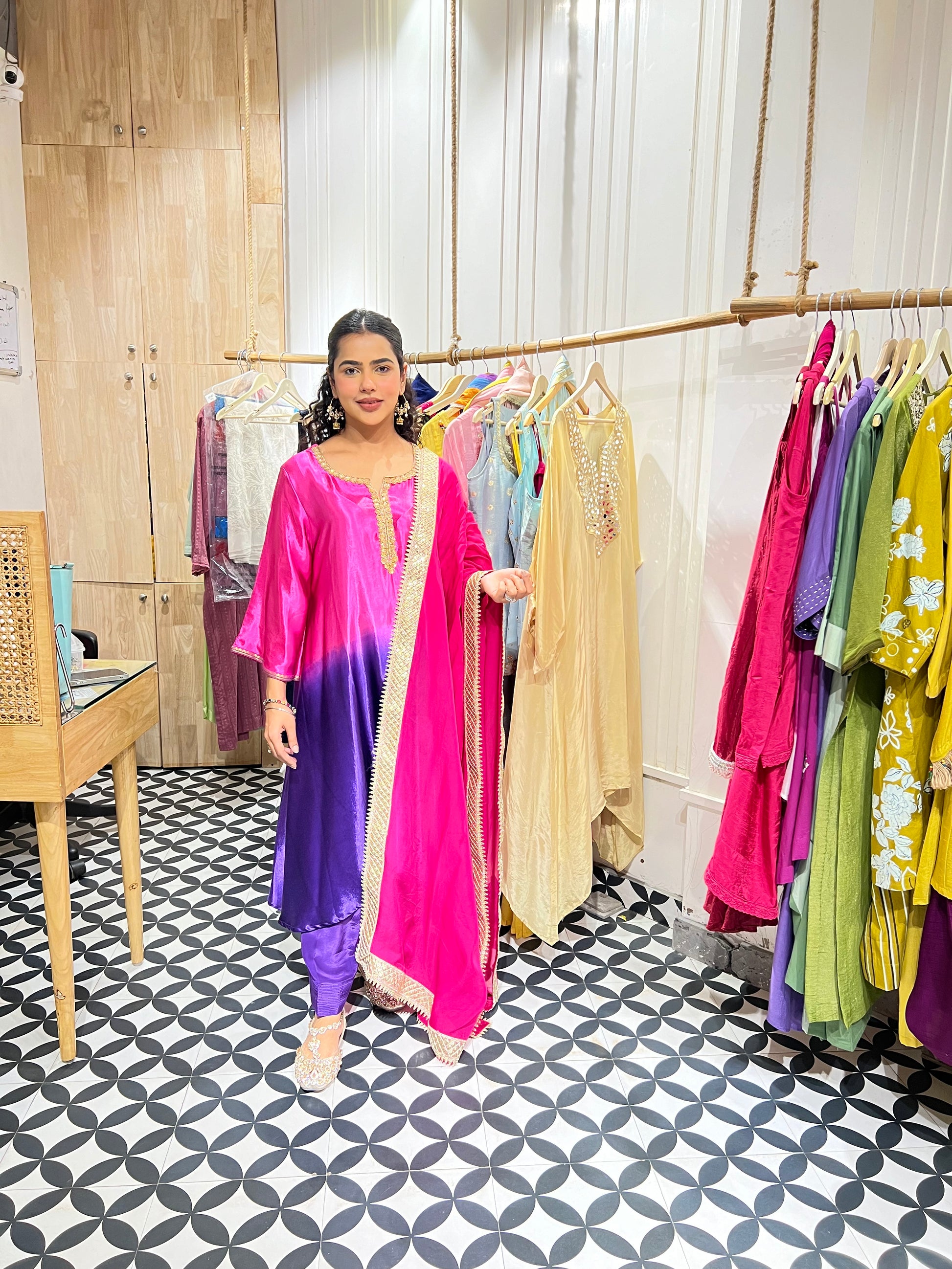 Pink meets purple in this dreamy ombre gajji satin suit set. Designed with an A-line salwar for easy elegance and styled with a sheer organza dupatta edged in lace, this outfit brings together sophistication and a fresh, youthful vibe.