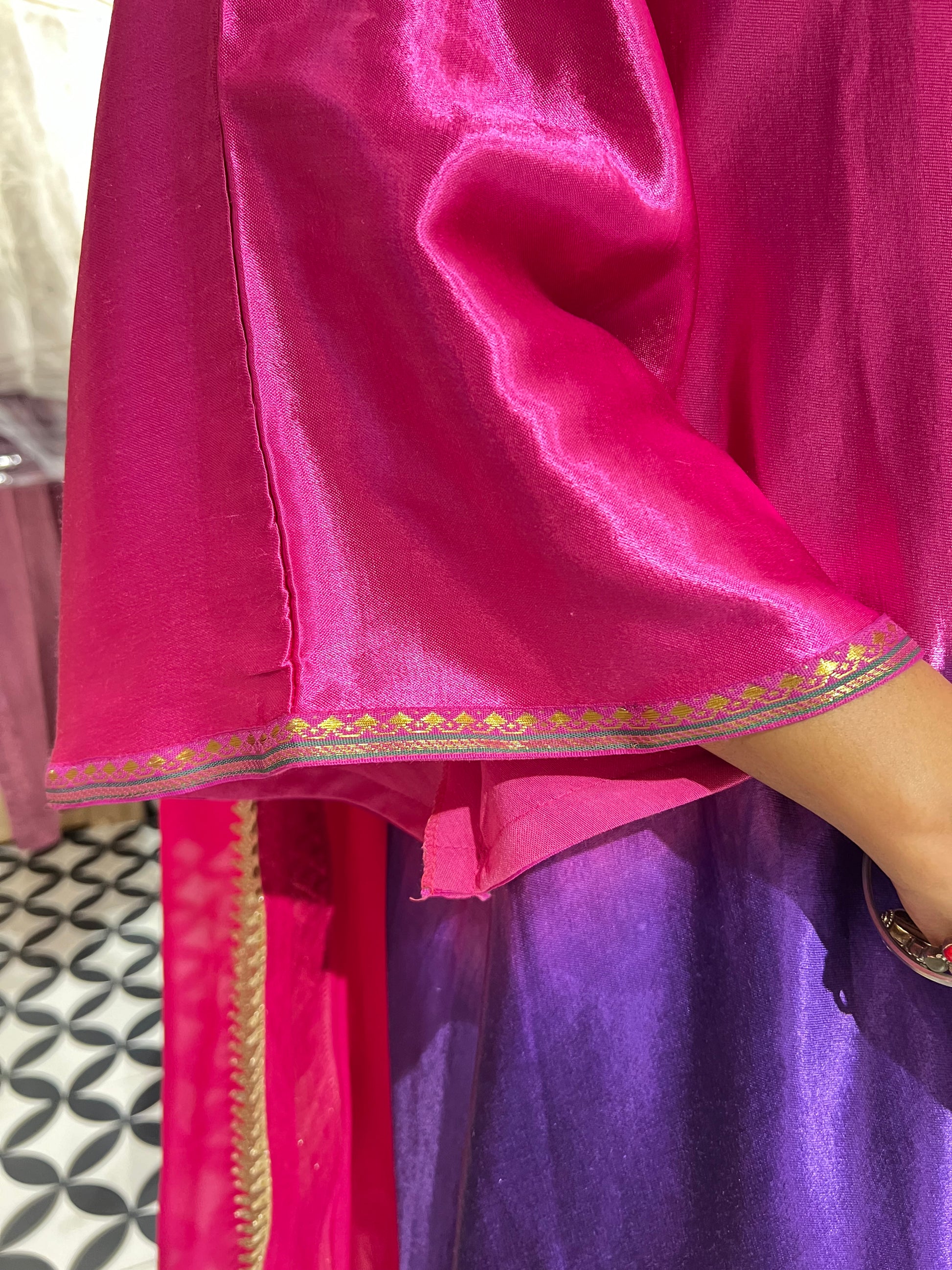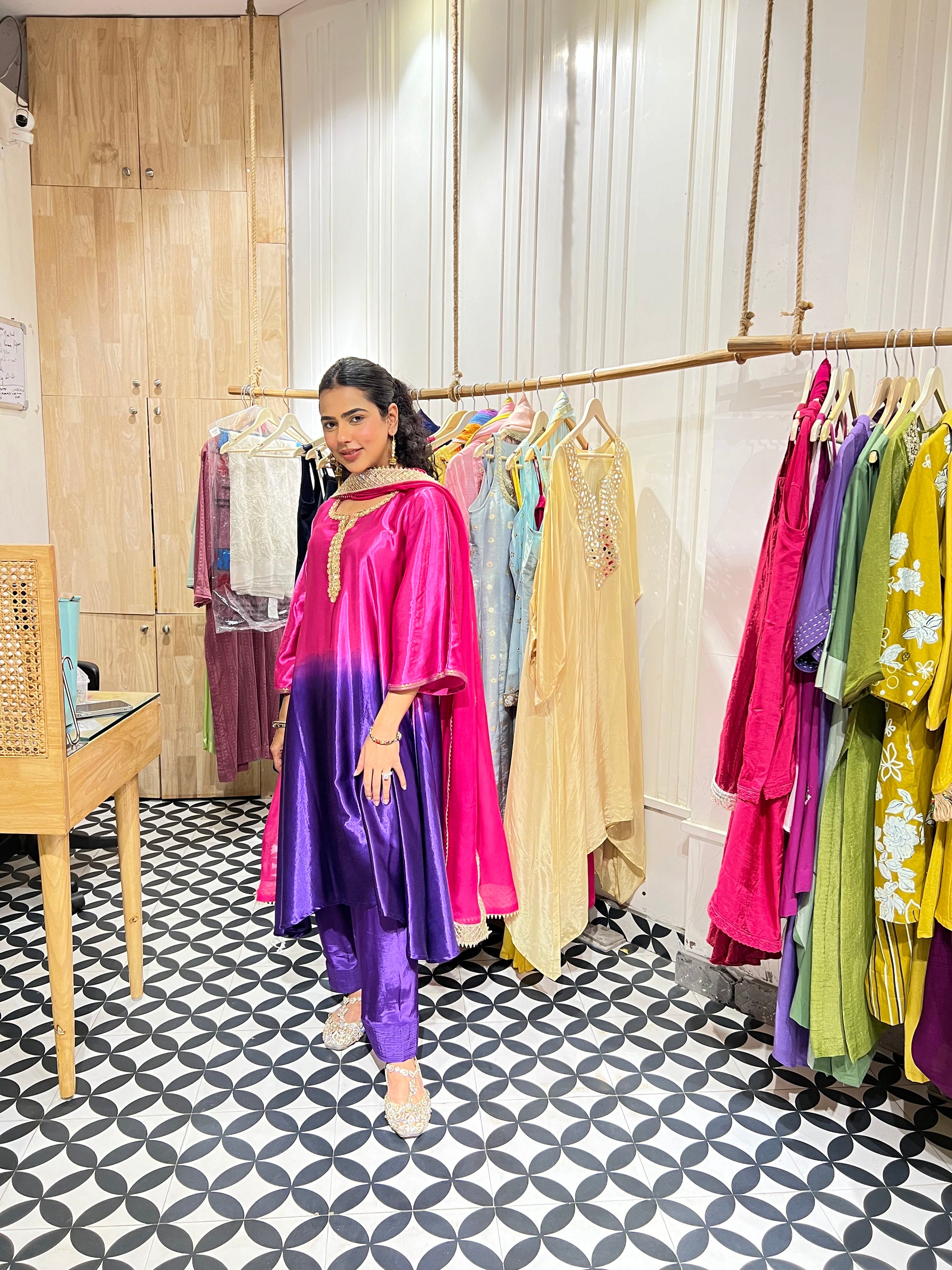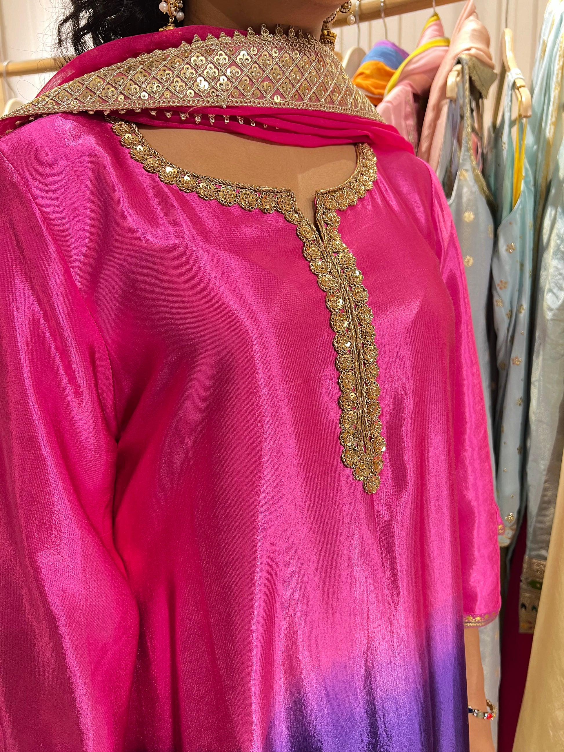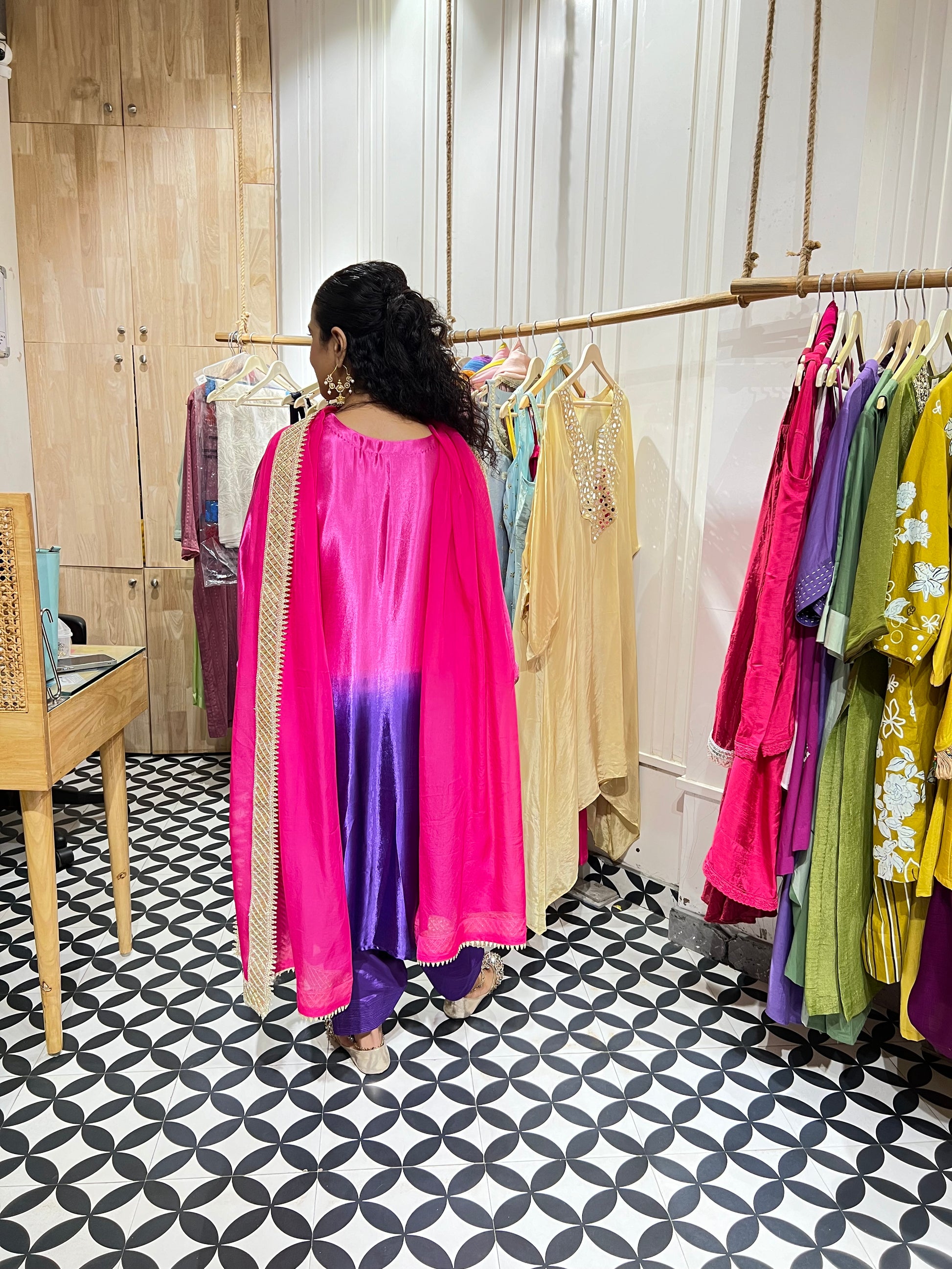 Pink meets purple in this dreamy ombre gajji satin suit set. Designed with an A-line salwar for easy elegance and styled with a sheer organza dupatta edged in lace, this outfit brings together sophistication and a fresh, youthful vibe.