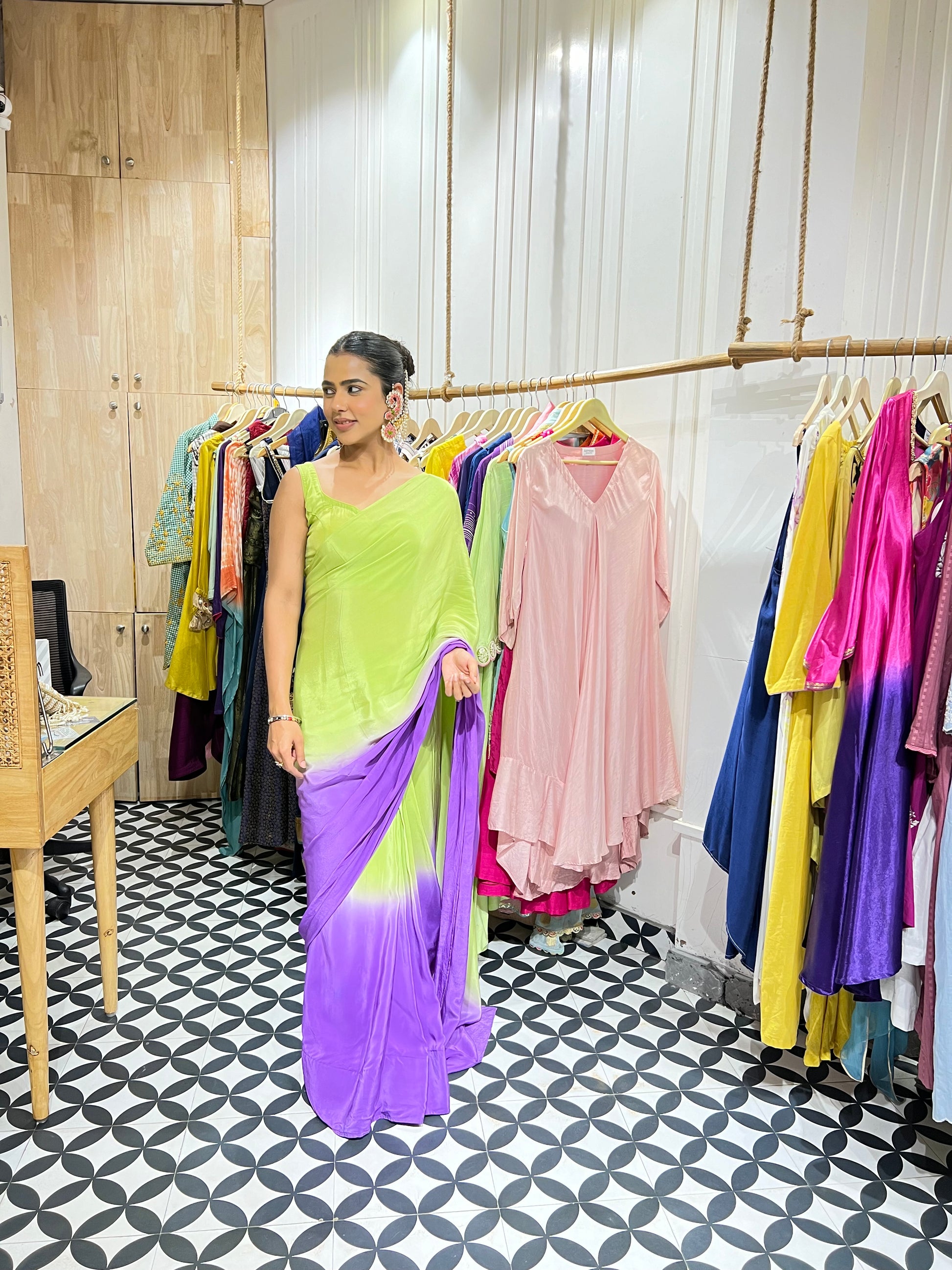 Celebrate the season in style with our dual-shade pink and red pre draped saree, crafted in crepe for a graceful fall. Designed as a statement yet versatile festive piece, it beautifully balances vibrance and elegance. The saree comes with a stitched blouse that is fully lined and padded, ensuring both comfort and a flawless fit. A complete set that makes festive dressing effortless, classy, and celebration-ready.