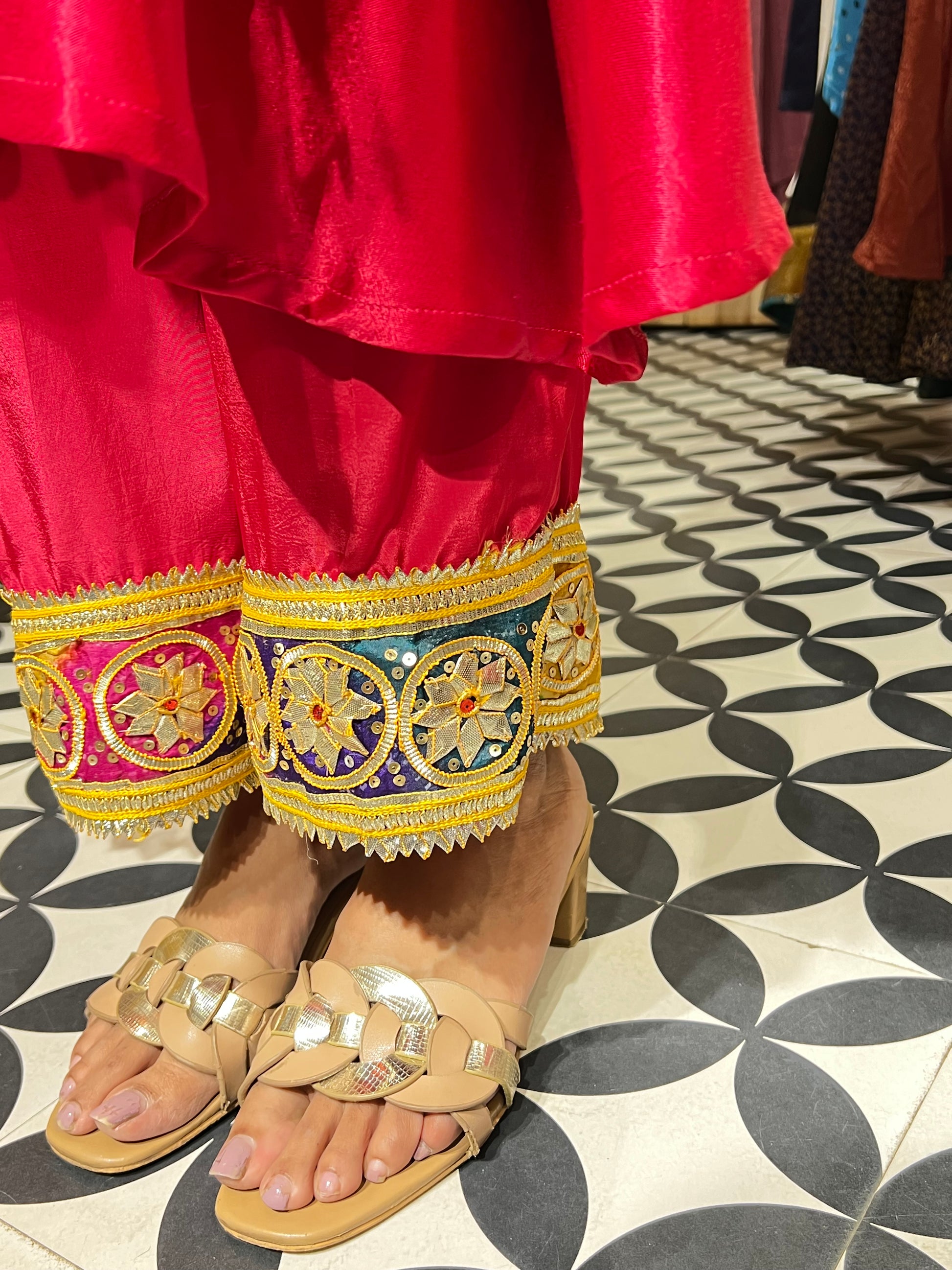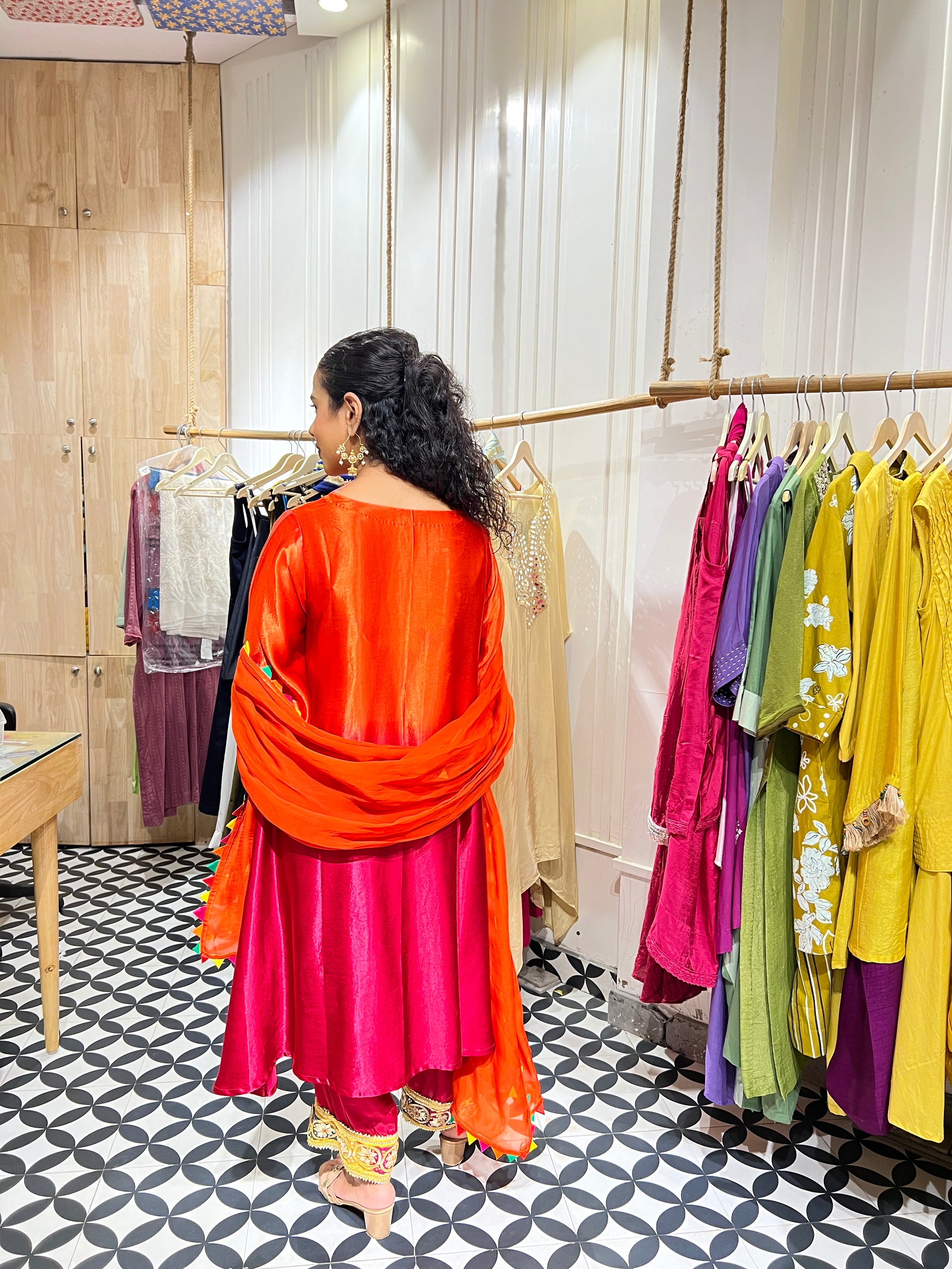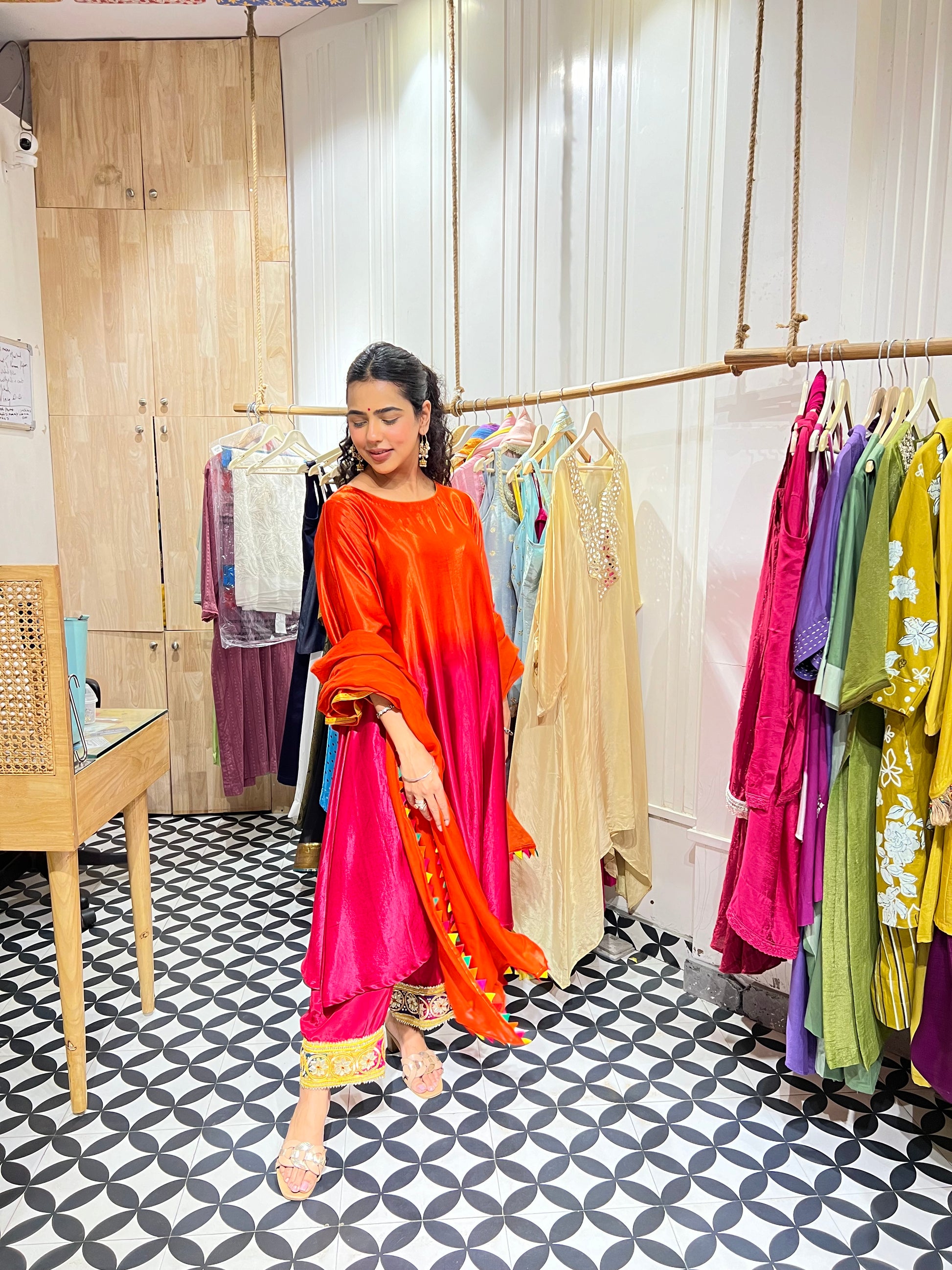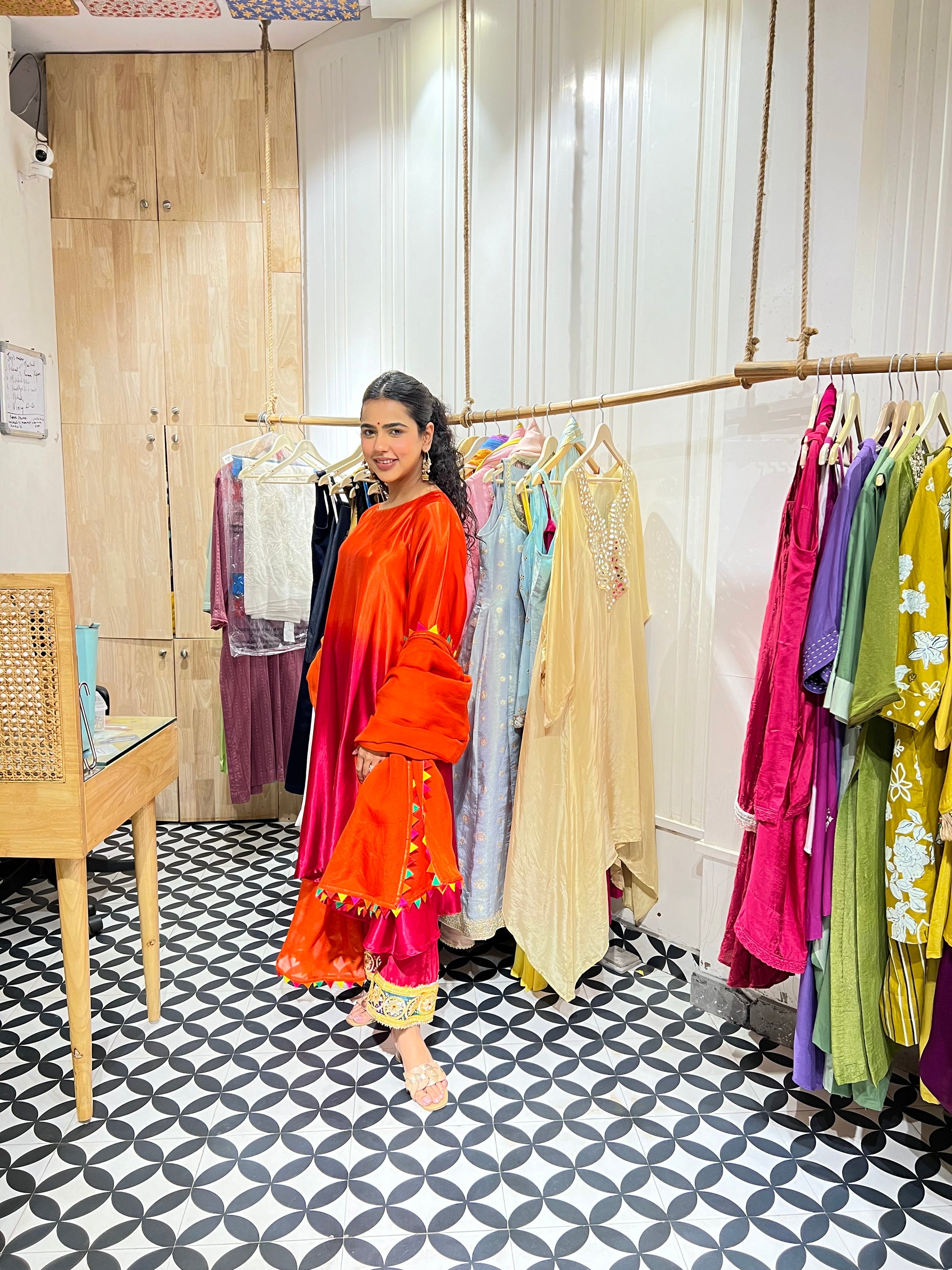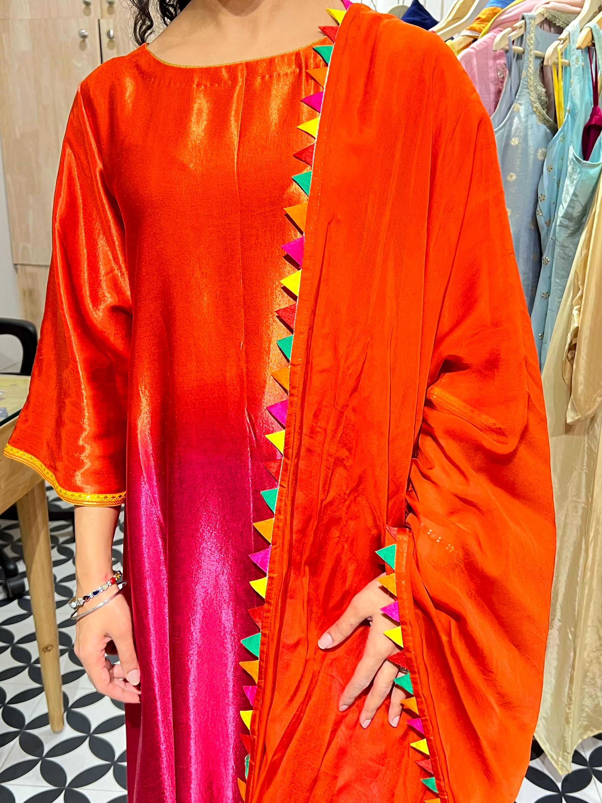 This rust orange and red suit set is crafted in luxurious gajji satin, giving it a soft, smooth feel with just the right touch of shine. The A-line cut ensures a flattering fit for every body type, while the viscose organza dupatta with multicolored lace borders adds a playful yet elegant touch. The bottoms feature delicate gota lace detailing, enhancing the overall festive charm. Lightweight, flowy, and timeless, this set is perfect for elevating your style with effortless grace.