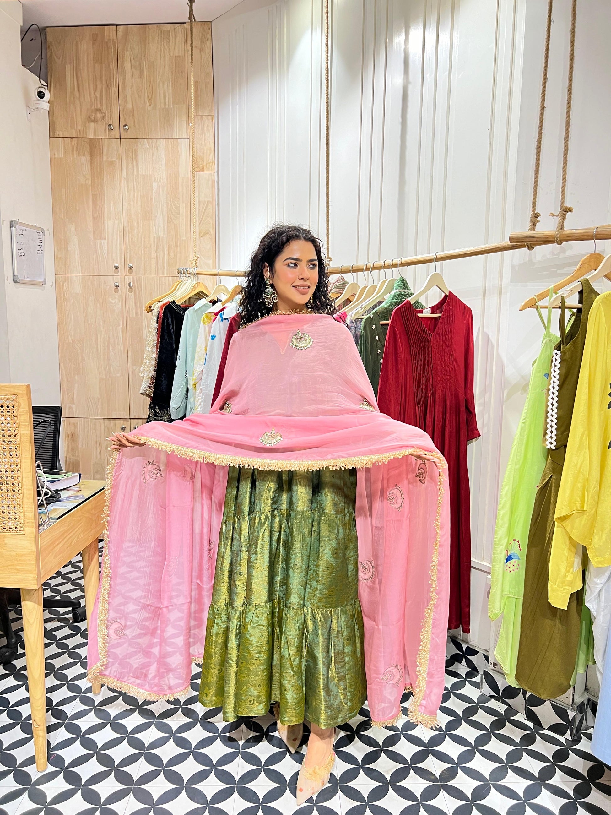 A statement in elegance - this rich green crepe multi-gathered kurta is paired with a soft baby pink organza dupatta, delicately hand-embroidered with chand motifs for a touch of timeless charm. The unique colour contrast makes it both graceful and striking. Completing the set, structured dupion silk pants add a polished finish, making this ensemble perfect for festive celebrations or special occasions.