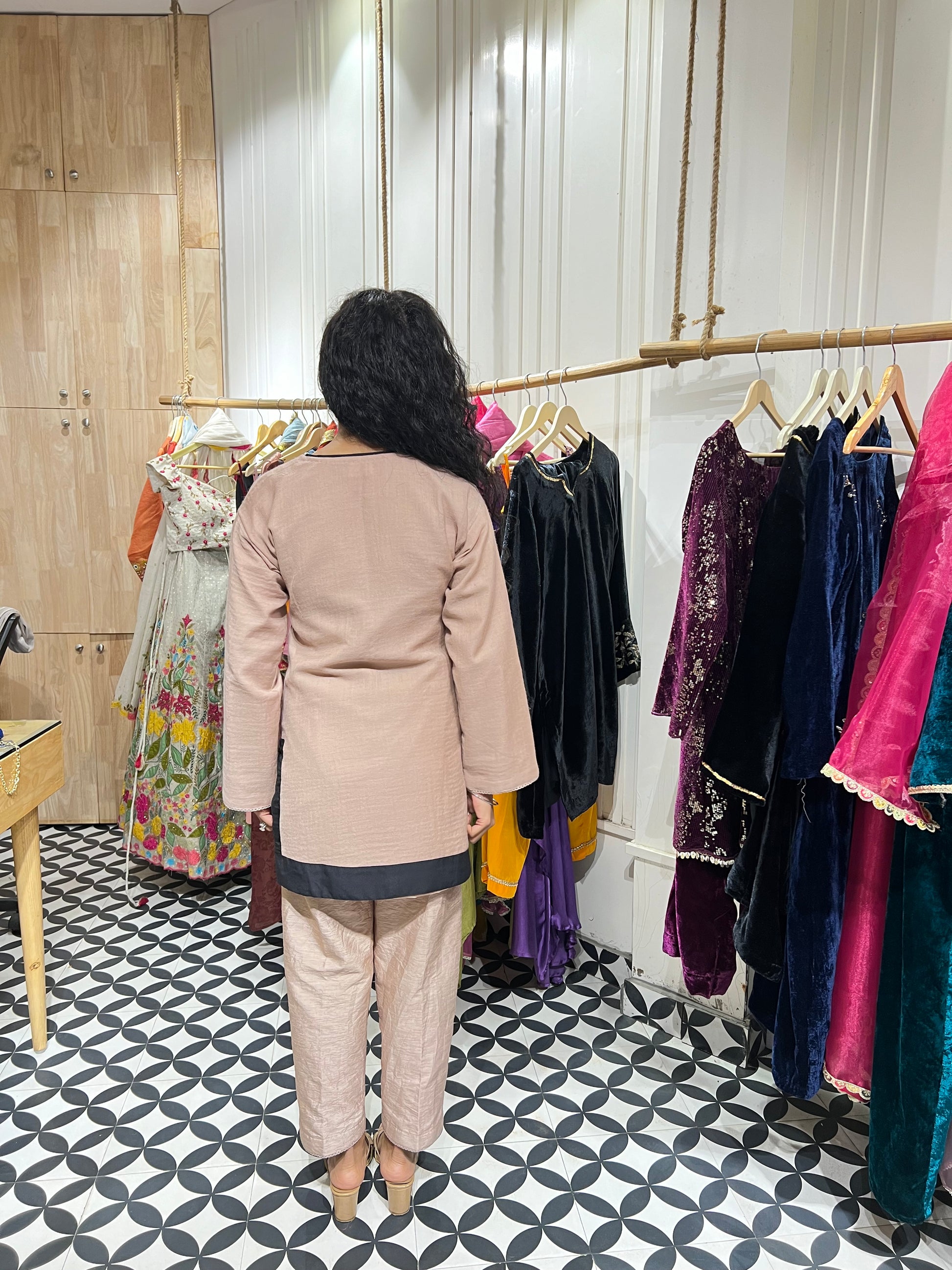 Experience the perfect blend of style and comfort with our Pashmina Coord Set. The top, crafted from lined pashmina in a neutral hue, offers a warm and cozy feel, making it ideal for chilly winter days. Paired with raw silk bottoms, this set is both elegant and stylish, perfect for office wear or any formal occasion. Embrace winter in sophistication and ease with this versatile outfit.