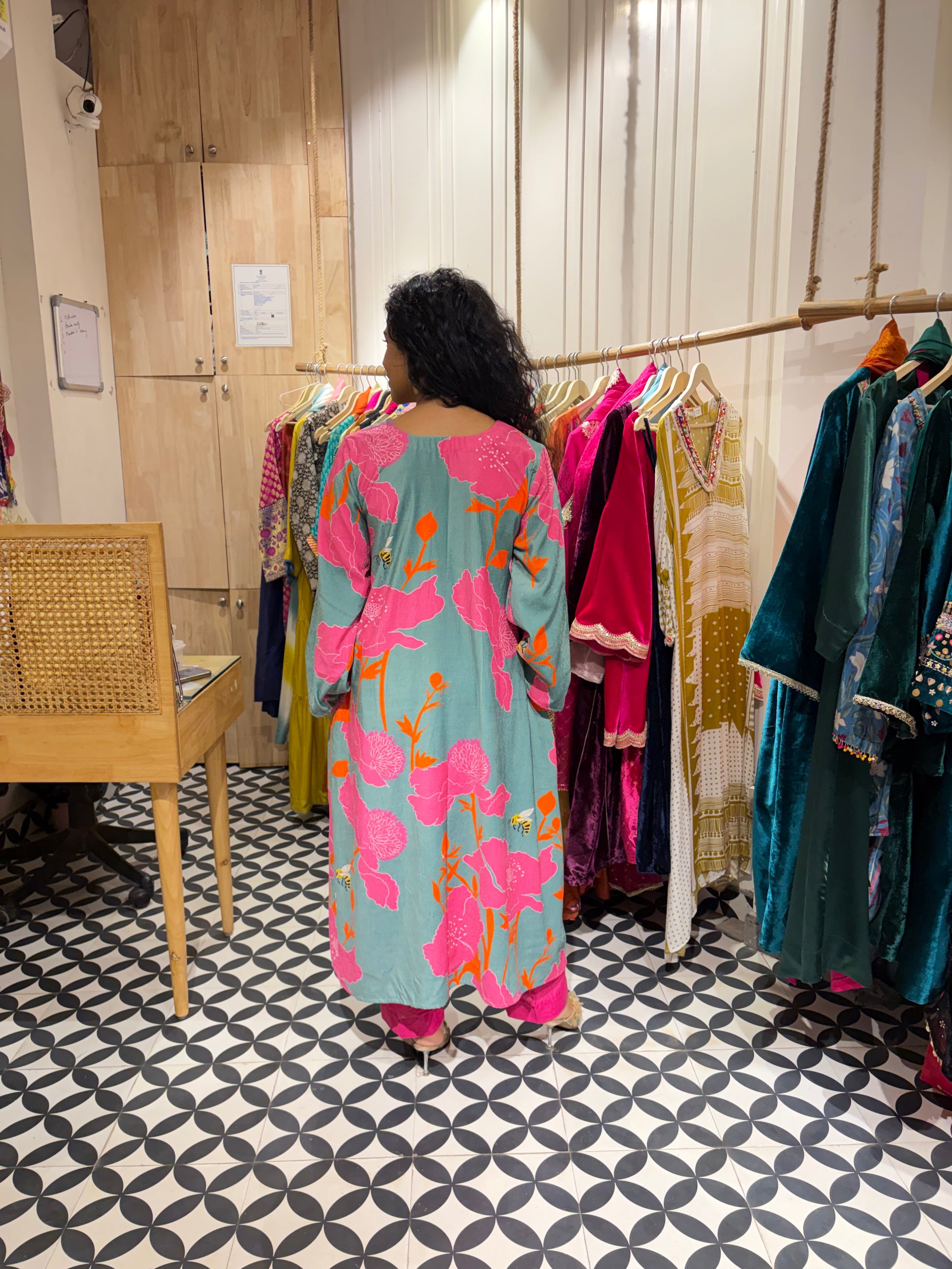 Break away from plain winter wear with this statement coord set, featuring an exclusive in-house floral and honeybee print on luxurious velvet. Thoughtfully designed to add a playful yet refined touch to your winter wardrobe, this piece balances quirk with elegance.