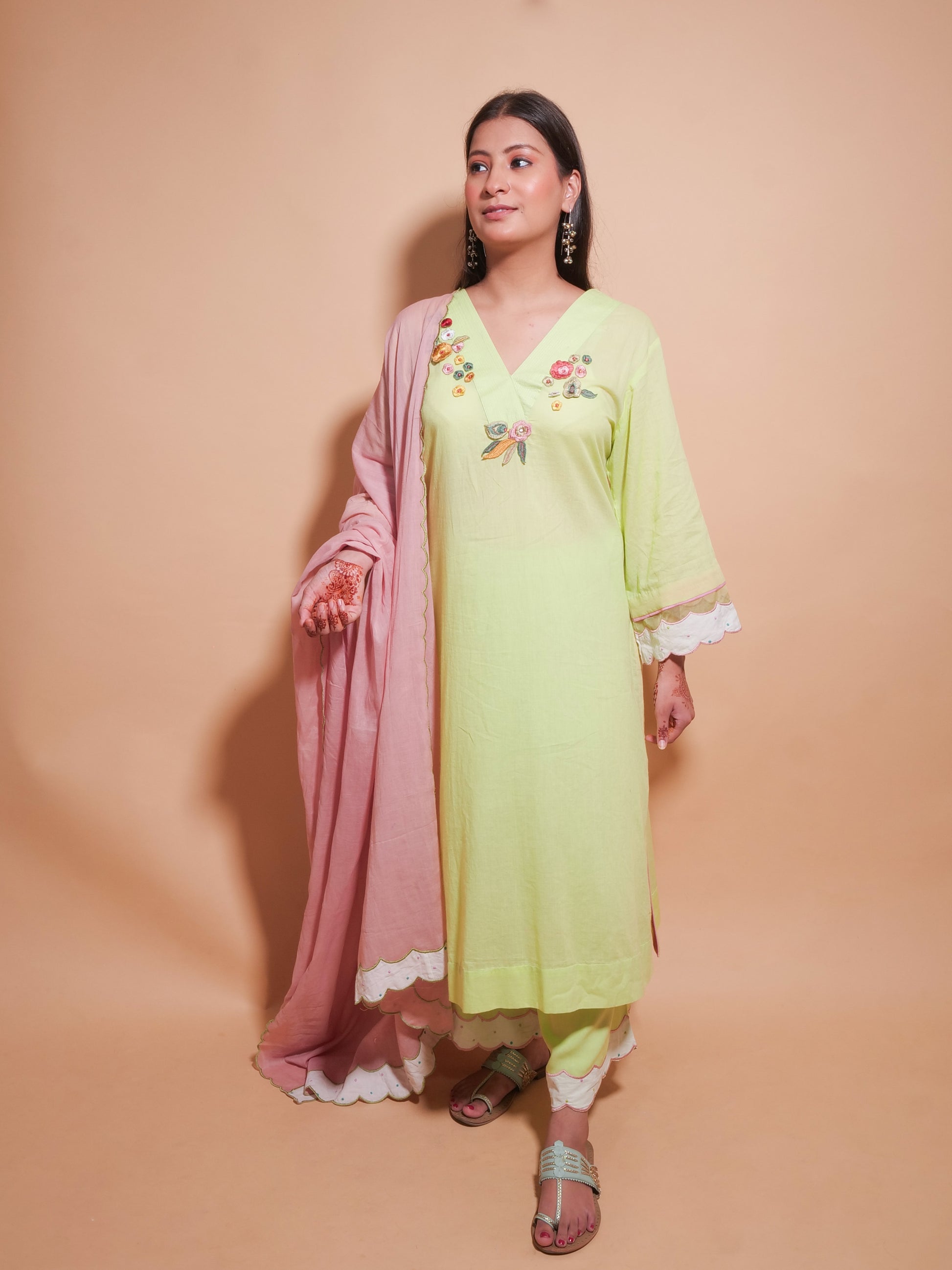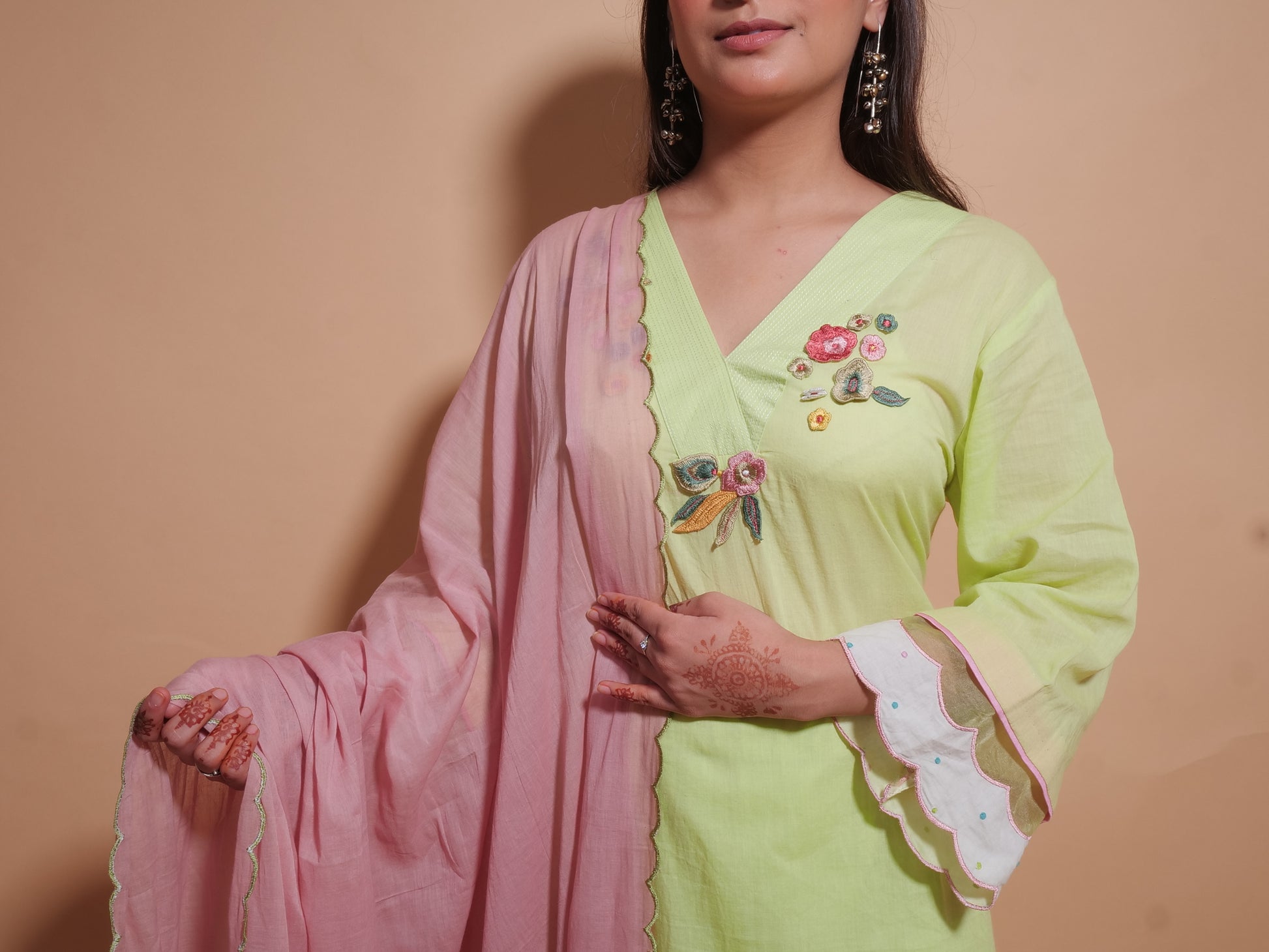 An A-line kurta in voile with 3D embroidered florals on the neckline . The pants and the dupatta have appliqué work on them. The sleeves of the kurta have embroidered organza attached to it.