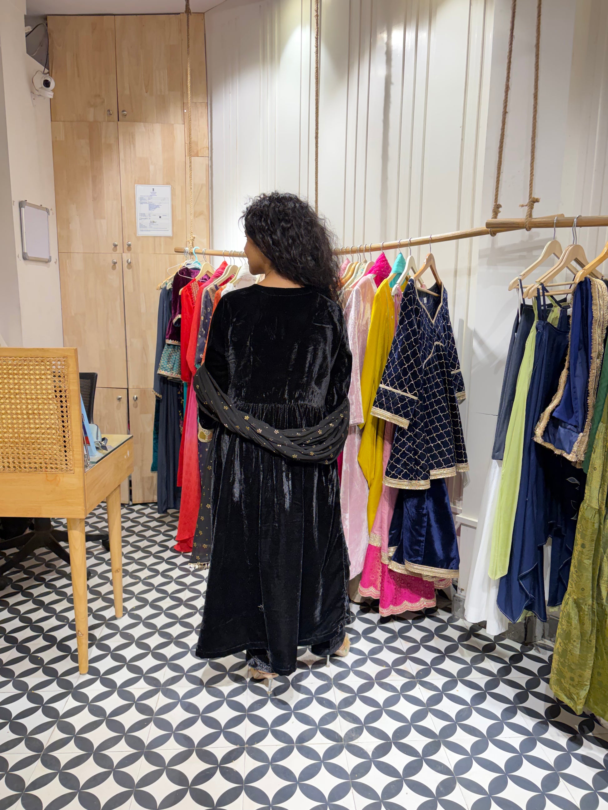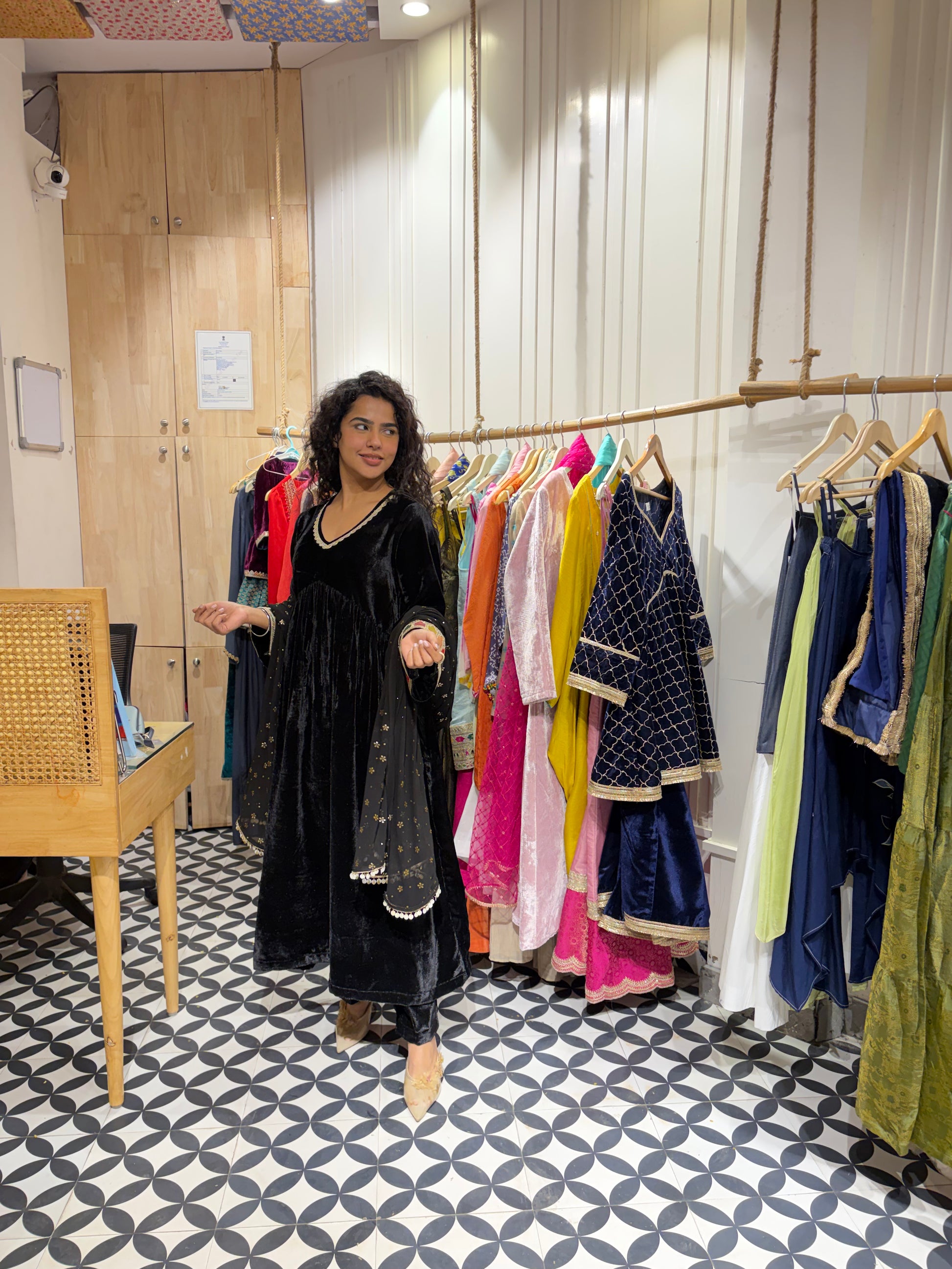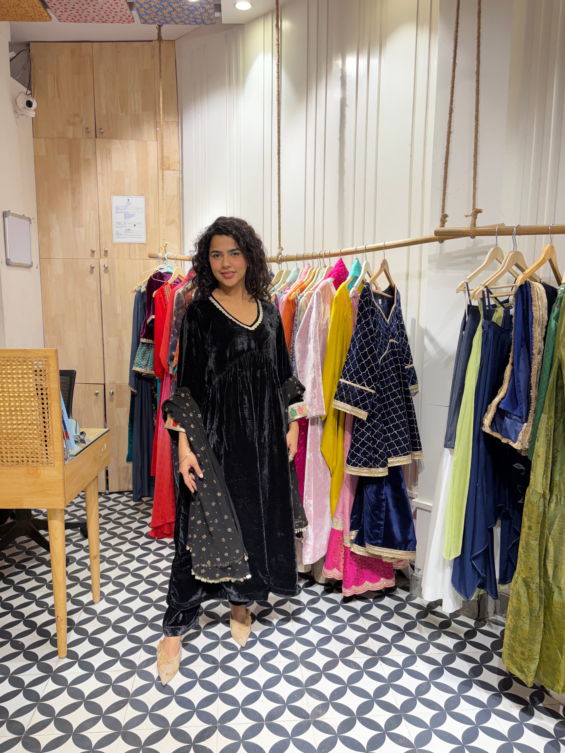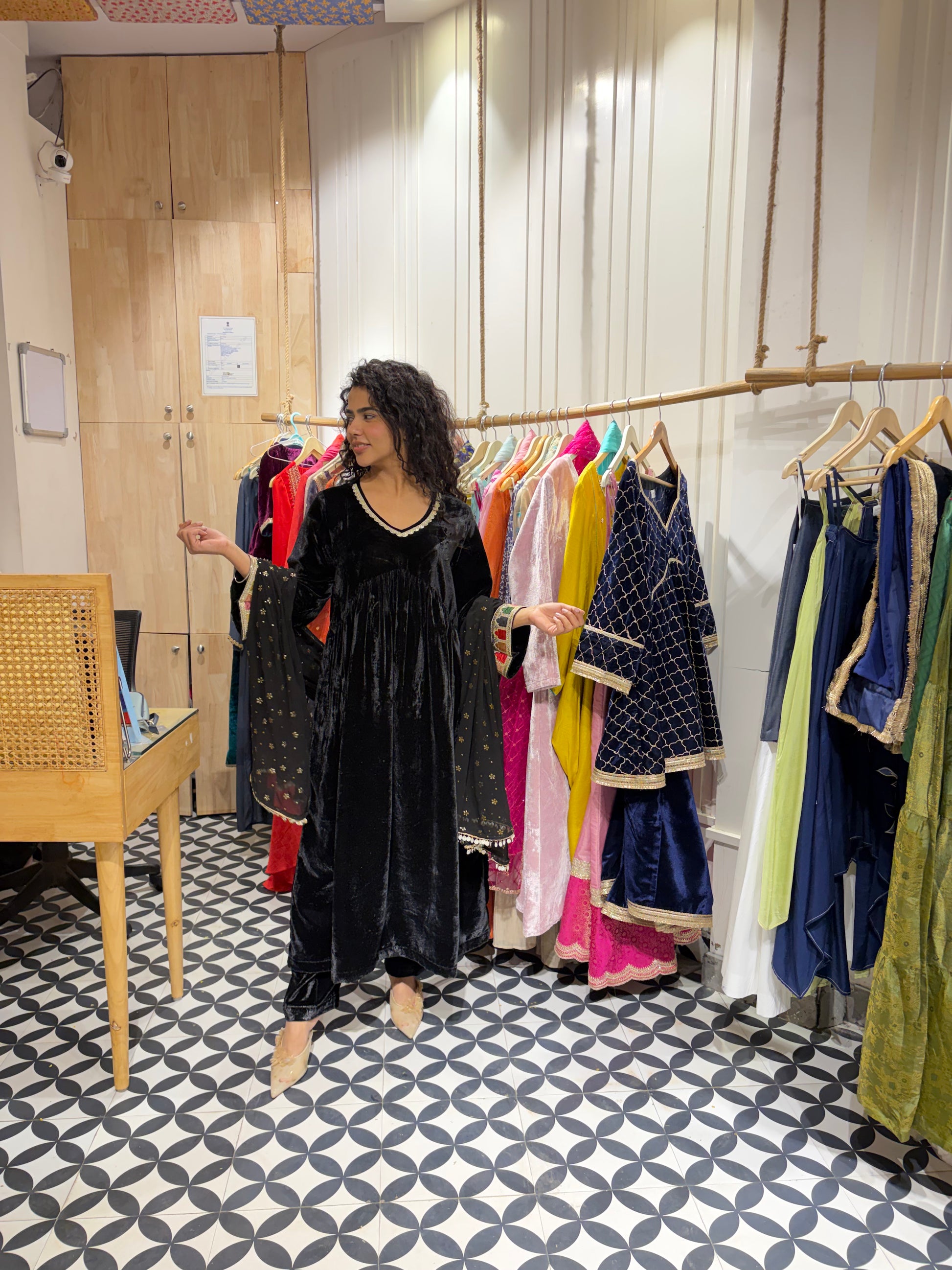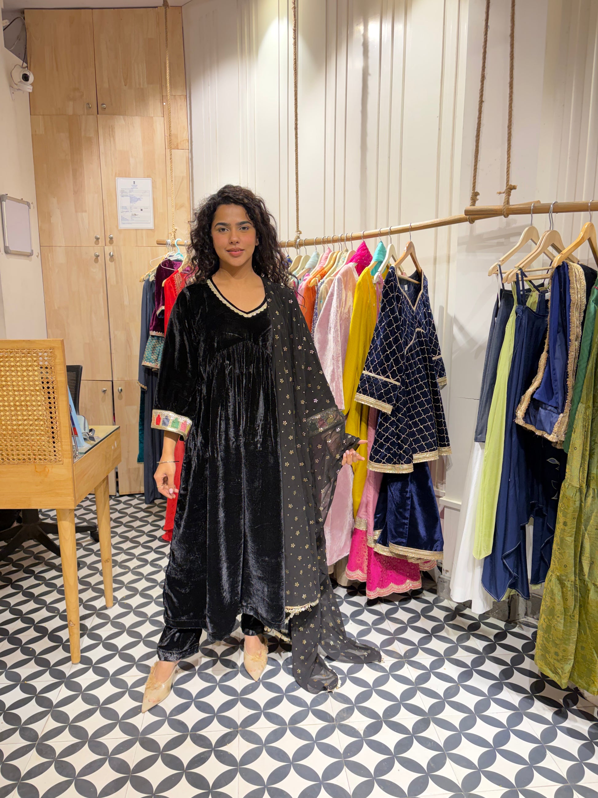 Presenting our Rich Velvet Alia-Cut Suit Set in the most royal black 🖤Paired with a Georgette dupatta featuring an all-over foil print and trim finishing on all four sides ✨Elegant lace detailing on the neckline and sleeves adds a touch of timeless charm 🤍A true statement piece - affordable luxury and a must-have classic for every wardrobe.