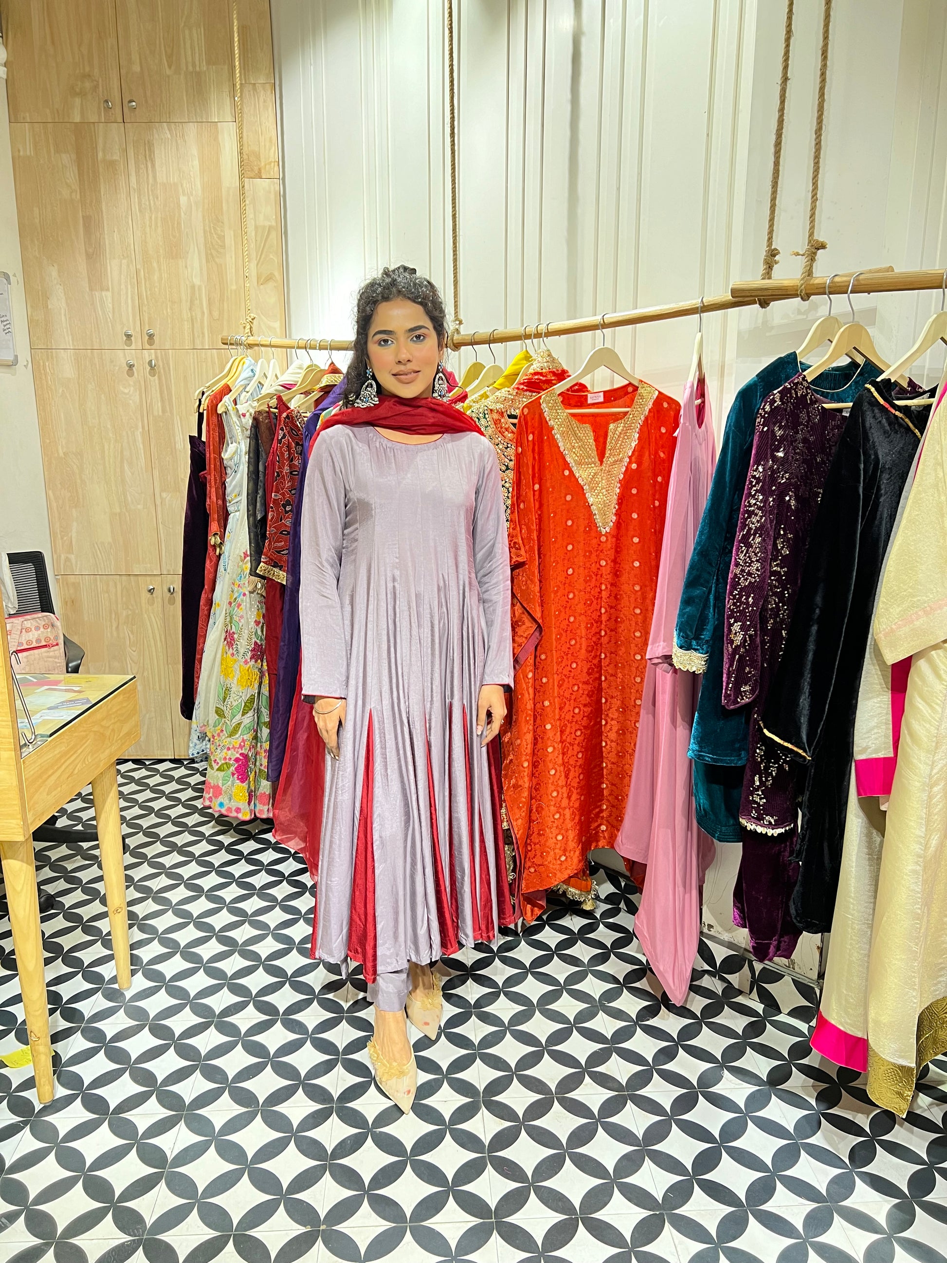 Our Dola silk suit set is designed to make an impression! Featuring graceful kalis on the kurta, paired with matching pants and a sheer organza dupatta, this grey and red masterpiece is a blend of tradition and luxury ❤️⚡