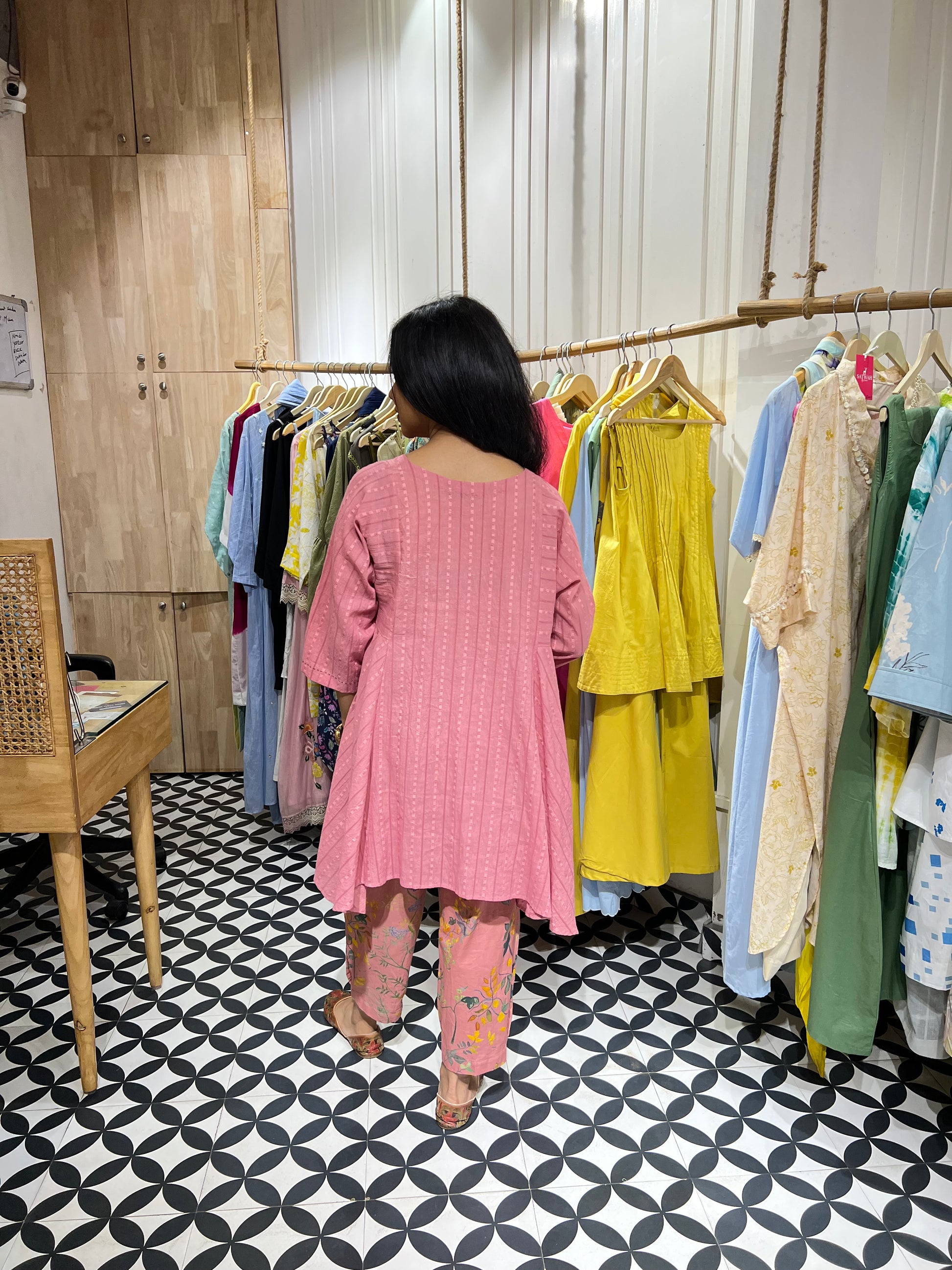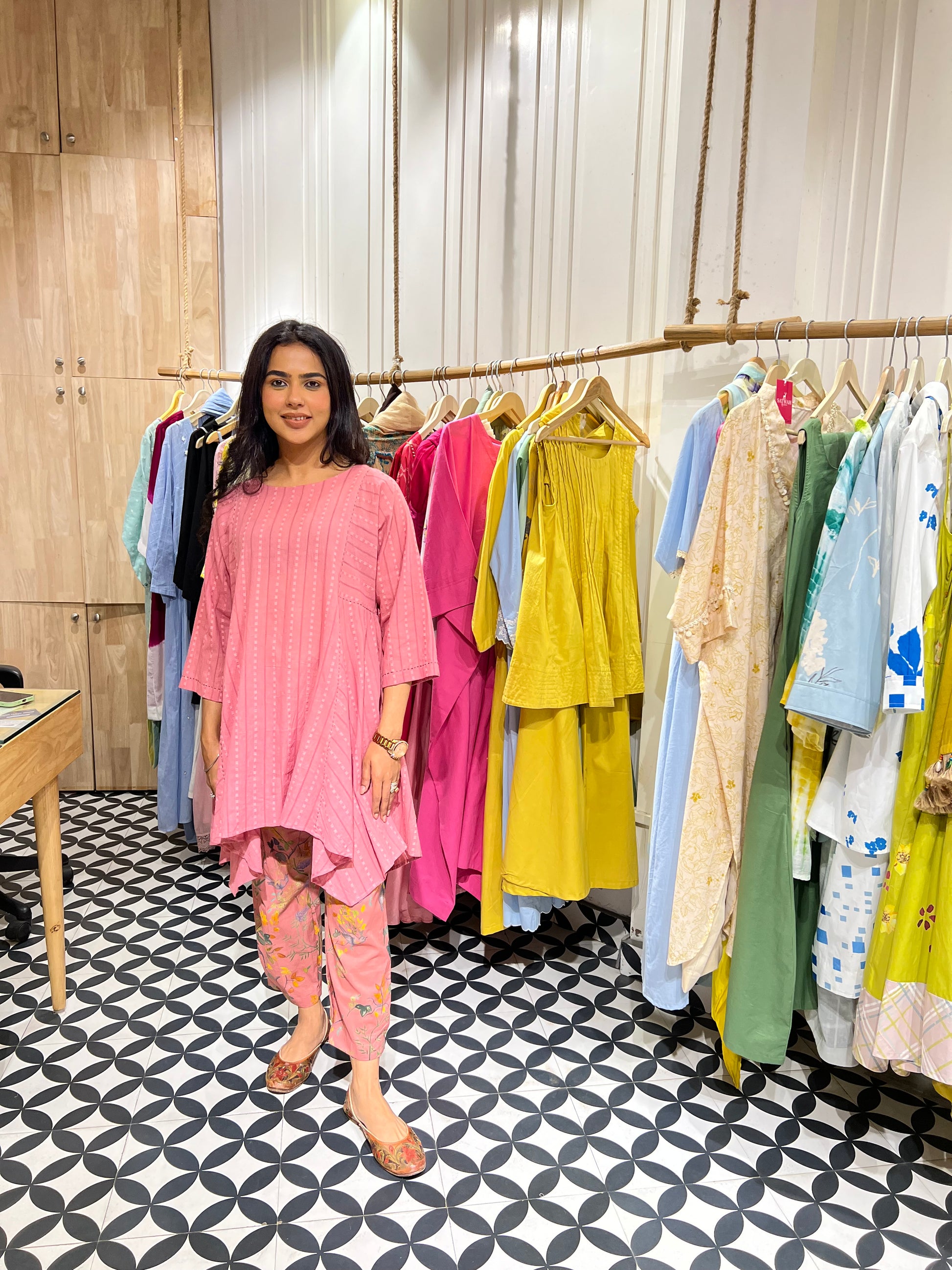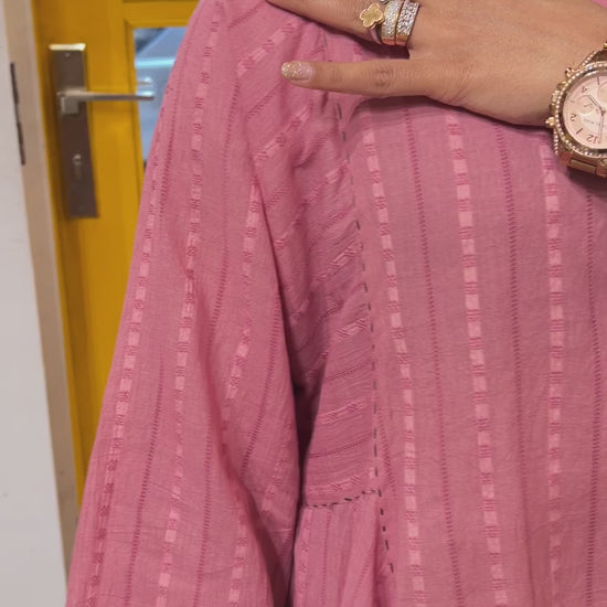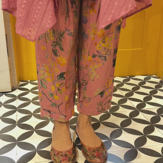 A silhouette that flows, a shade that soothes this elegant ensemble is crafted in breathable self-cotton, bringing together comfort and grace. Adorned with delicate handprinted motifs and finished with running stitch detailing, every piece tells a story of thoughtful craftsmanship. Whether it’s a casual day out or a relaxed celebration, this look blends trendy aesthetics with timeless charm just for you.