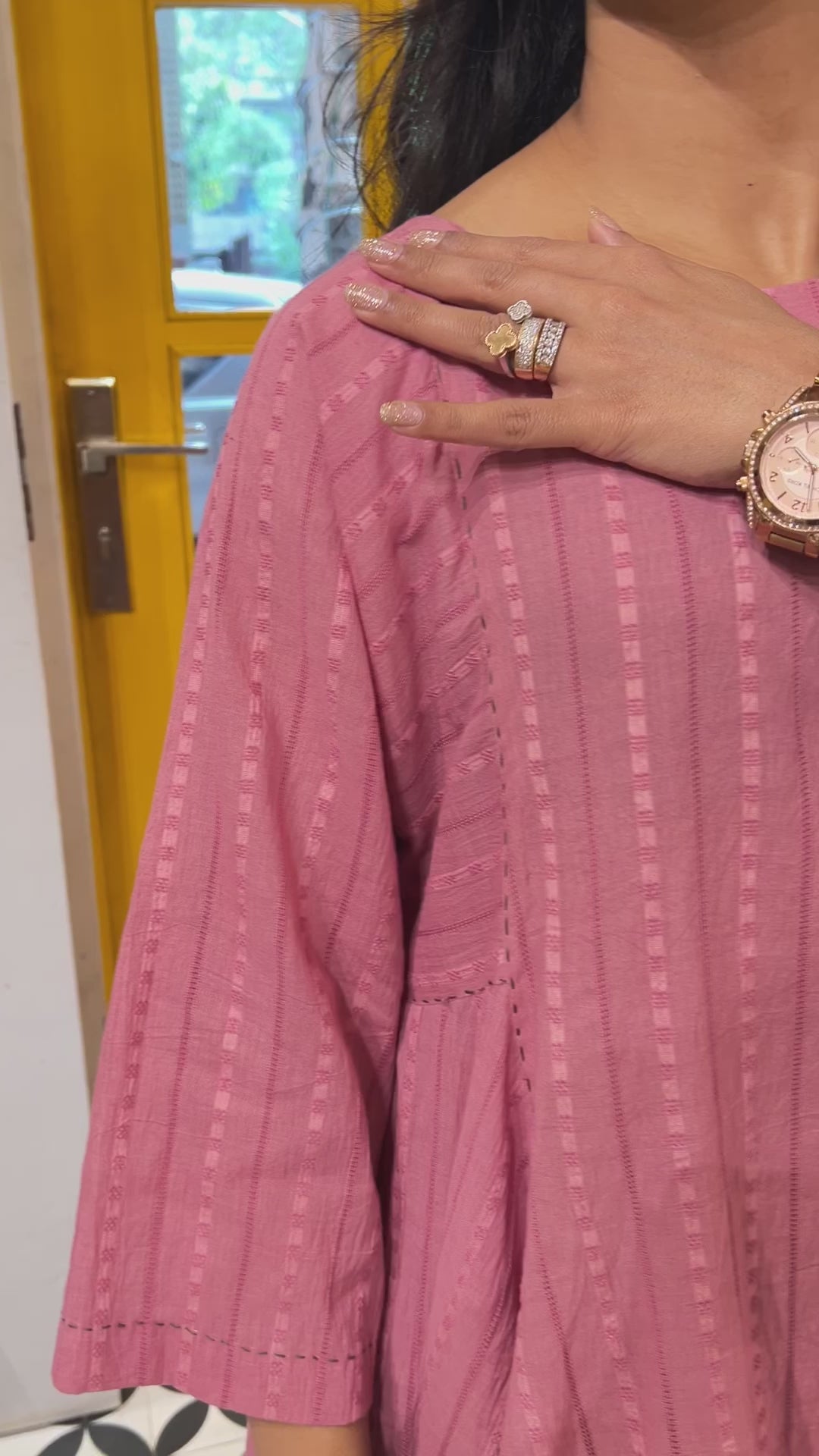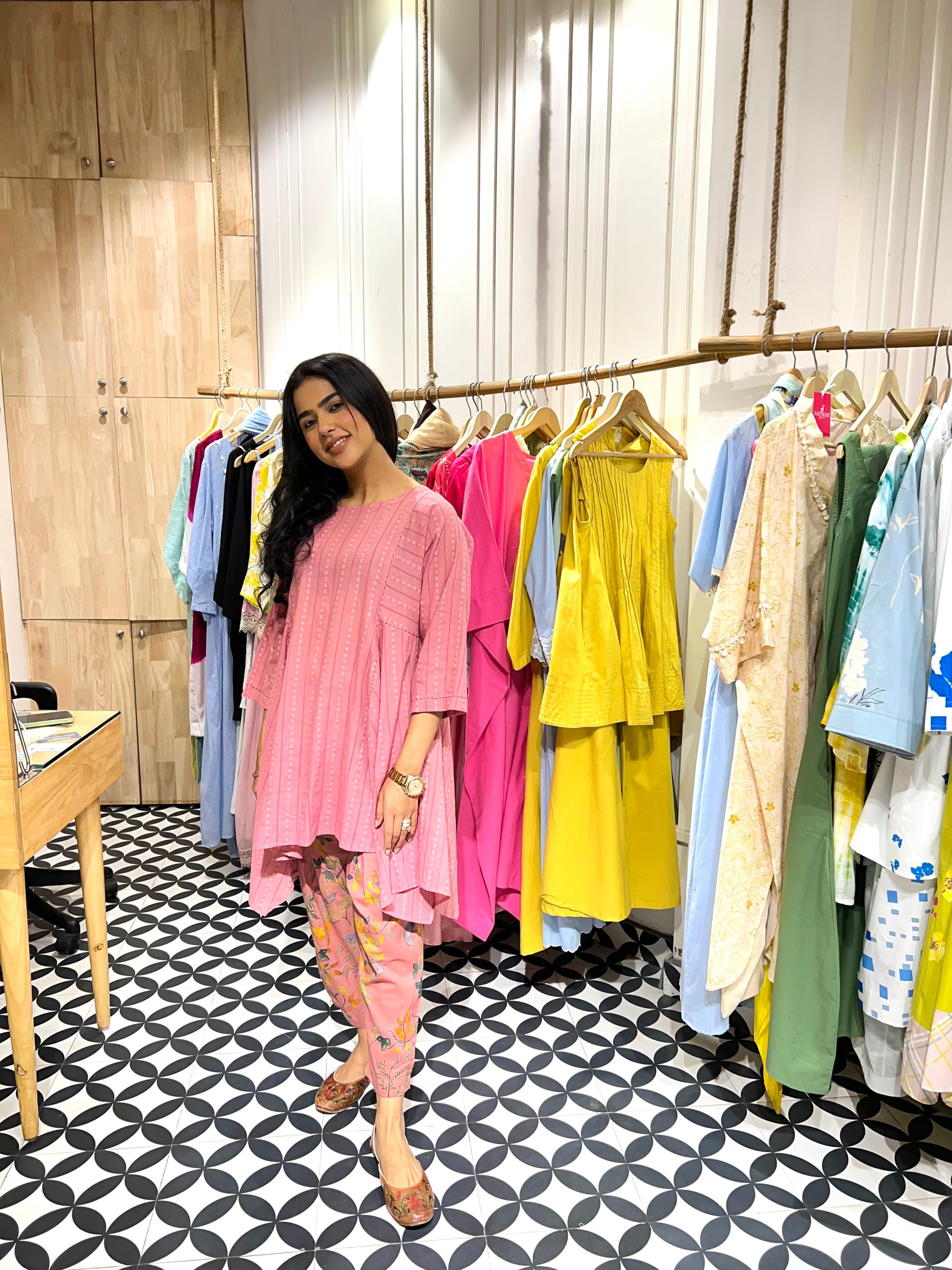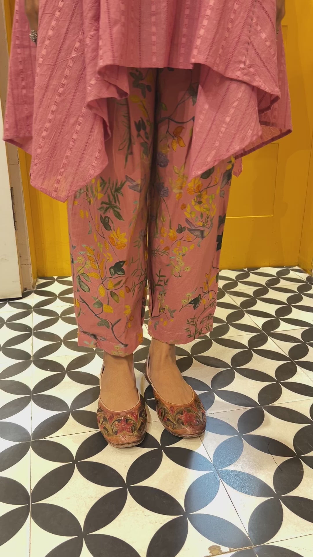 A silhouette that flows, a shade that soothes this elegant ensemble is crafted in breathable self-cotton, bringing together comfort and grace. Adorned with delicate handprinted motifs and finished with running stitch detailing, every piece tells a story of thoughtful craftsmanship. Whether it’s a casual day out or a relaxed celebration, this look blends trendy aesthetics with timeless charm just for you.