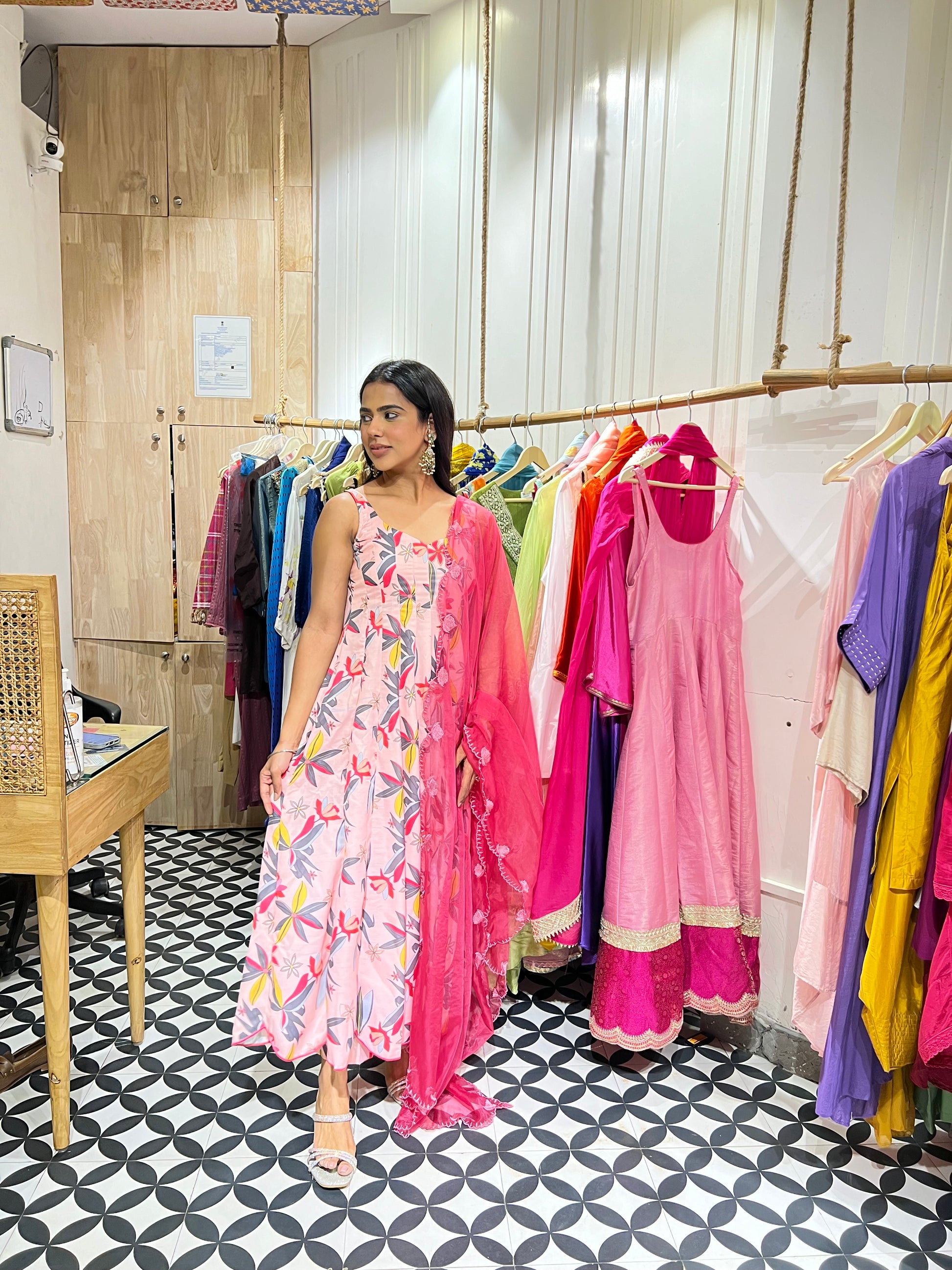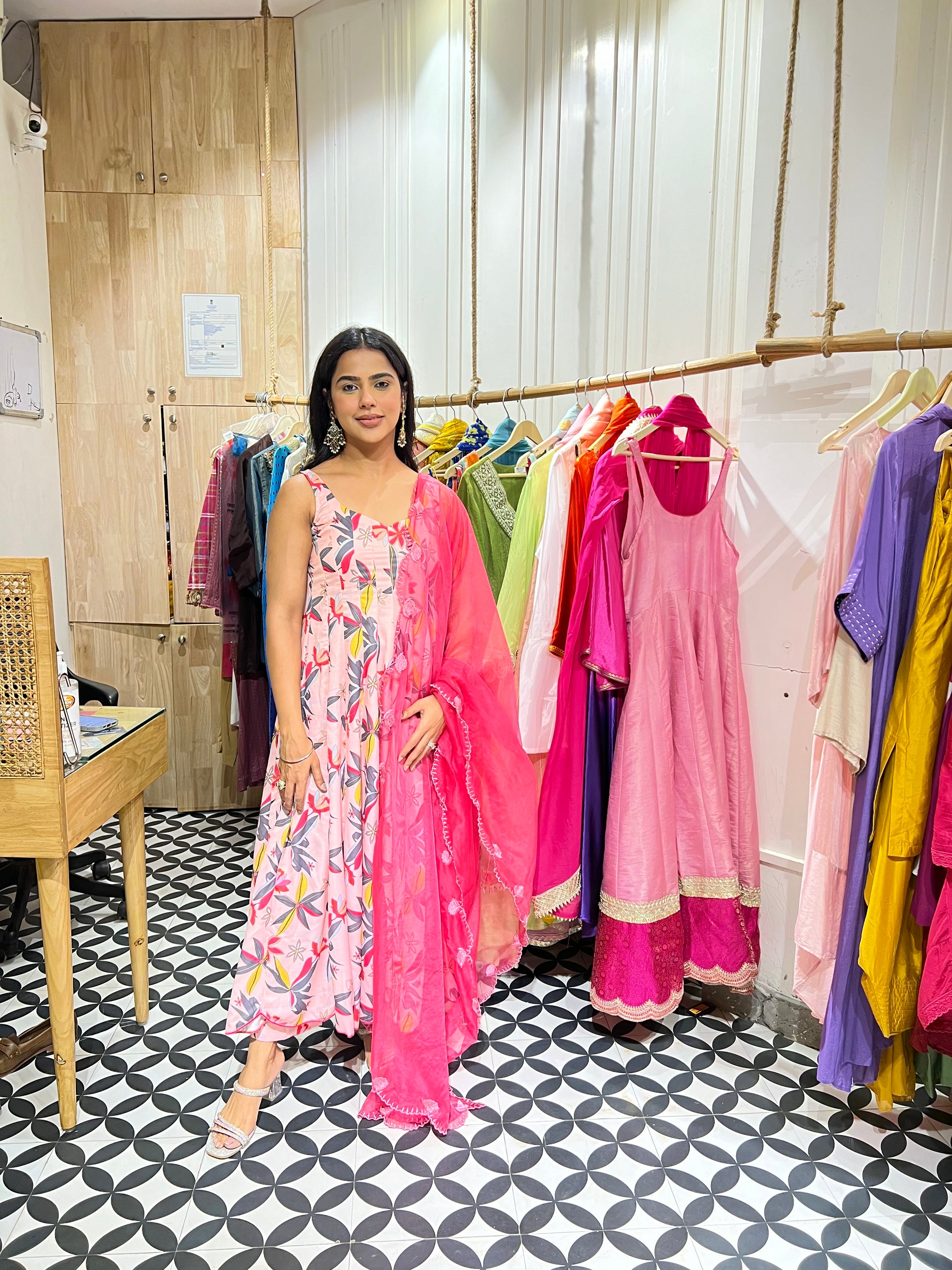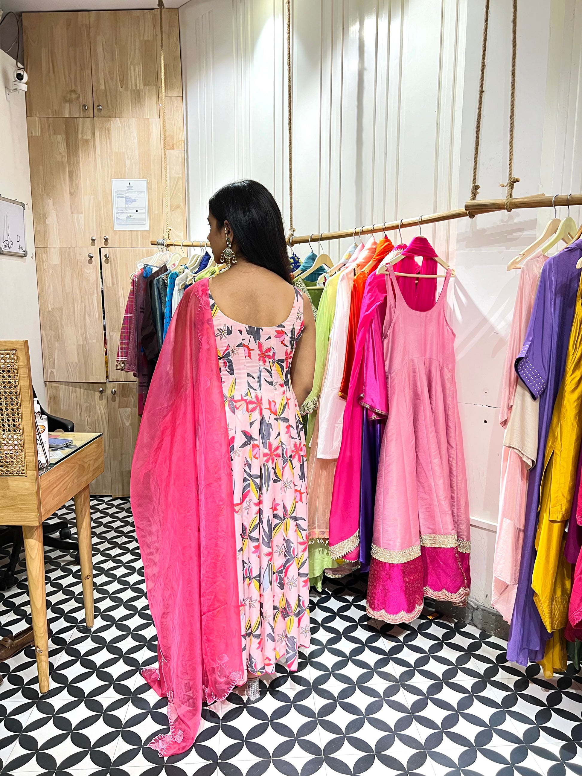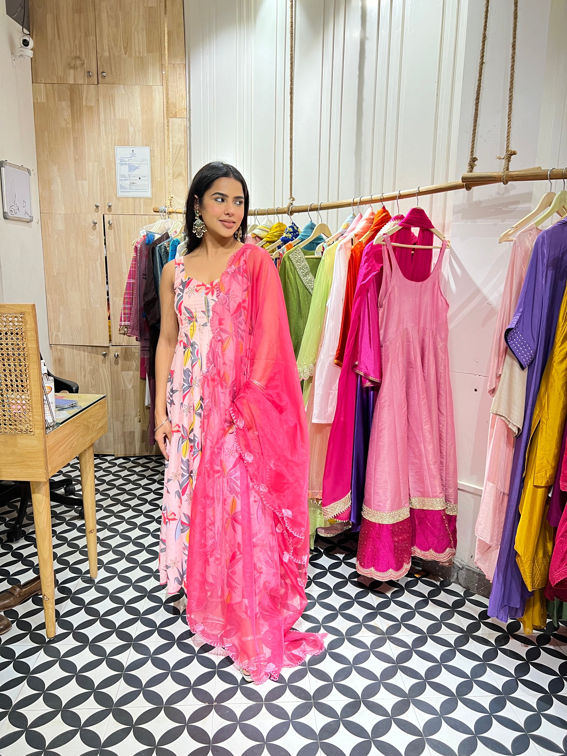 Our Floral Kalidar Suit Set is crafted in luxurious modal satin, giving it a graceful fall and timeless appeal. The highlight of the ensemble is the organza dupatta with delicate scalloping along the sides, echoing the bold, dramatic scallops on the kurta hemline. This set blends elegance with charm, making it the perfect choice for festive gatherings and special occasions. A true floral slay, season after season. 🌸✨