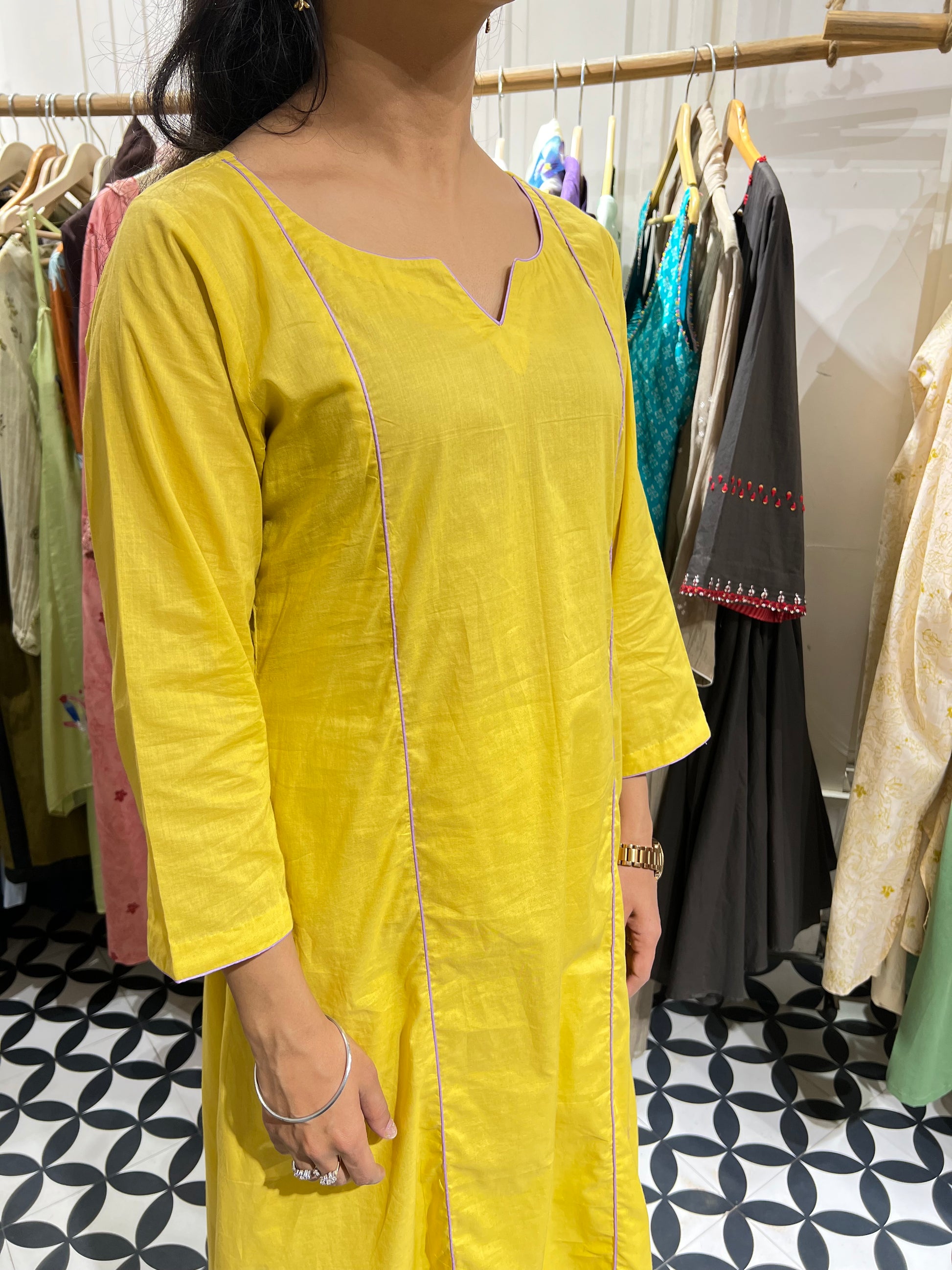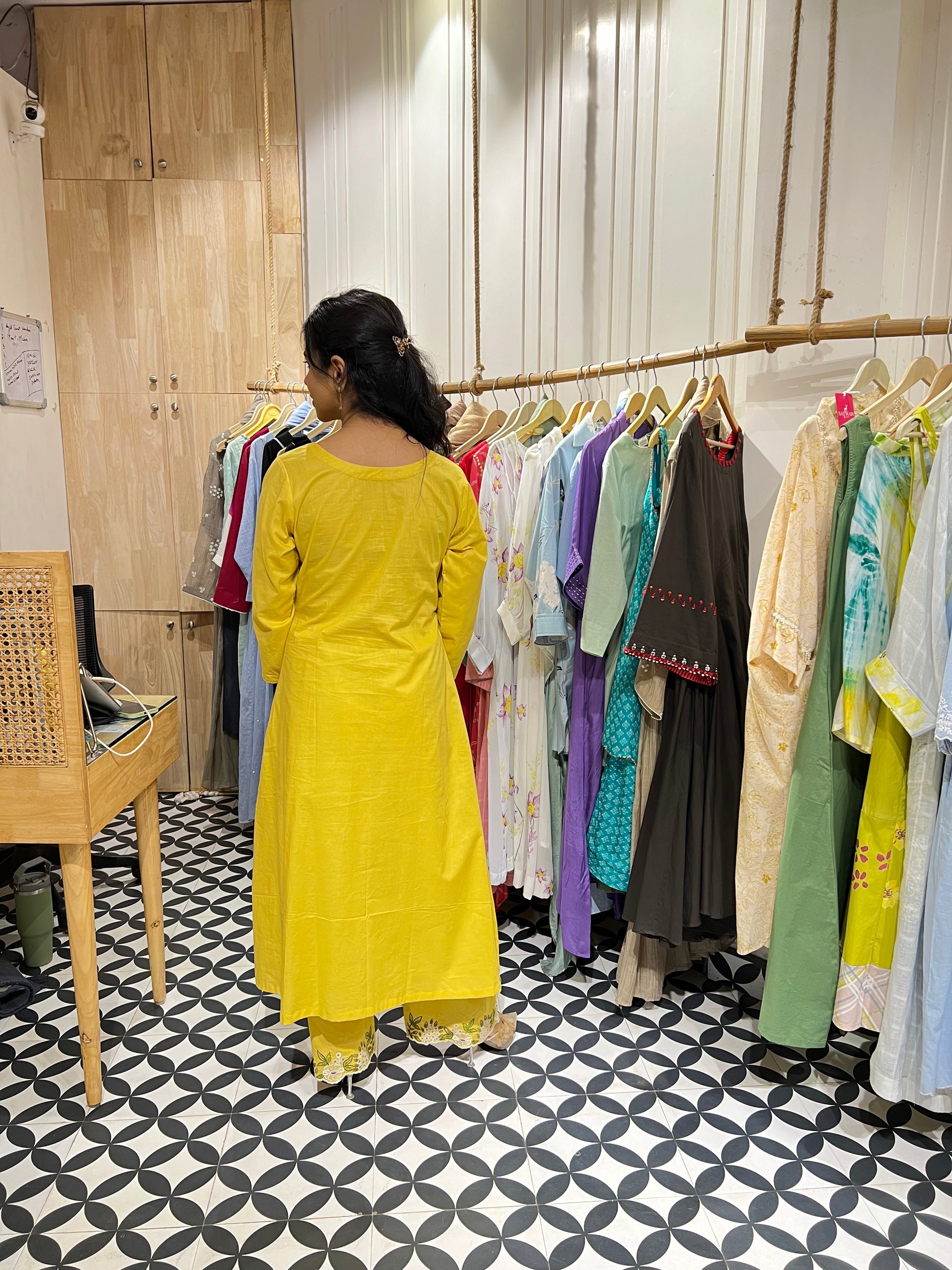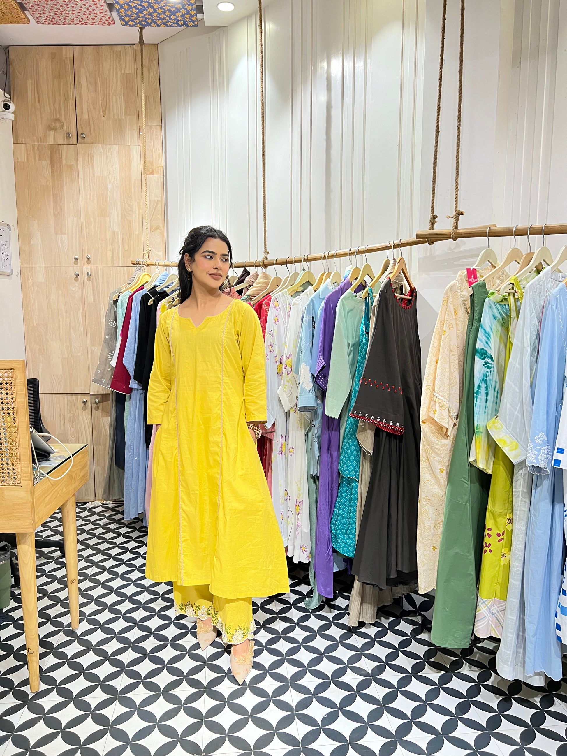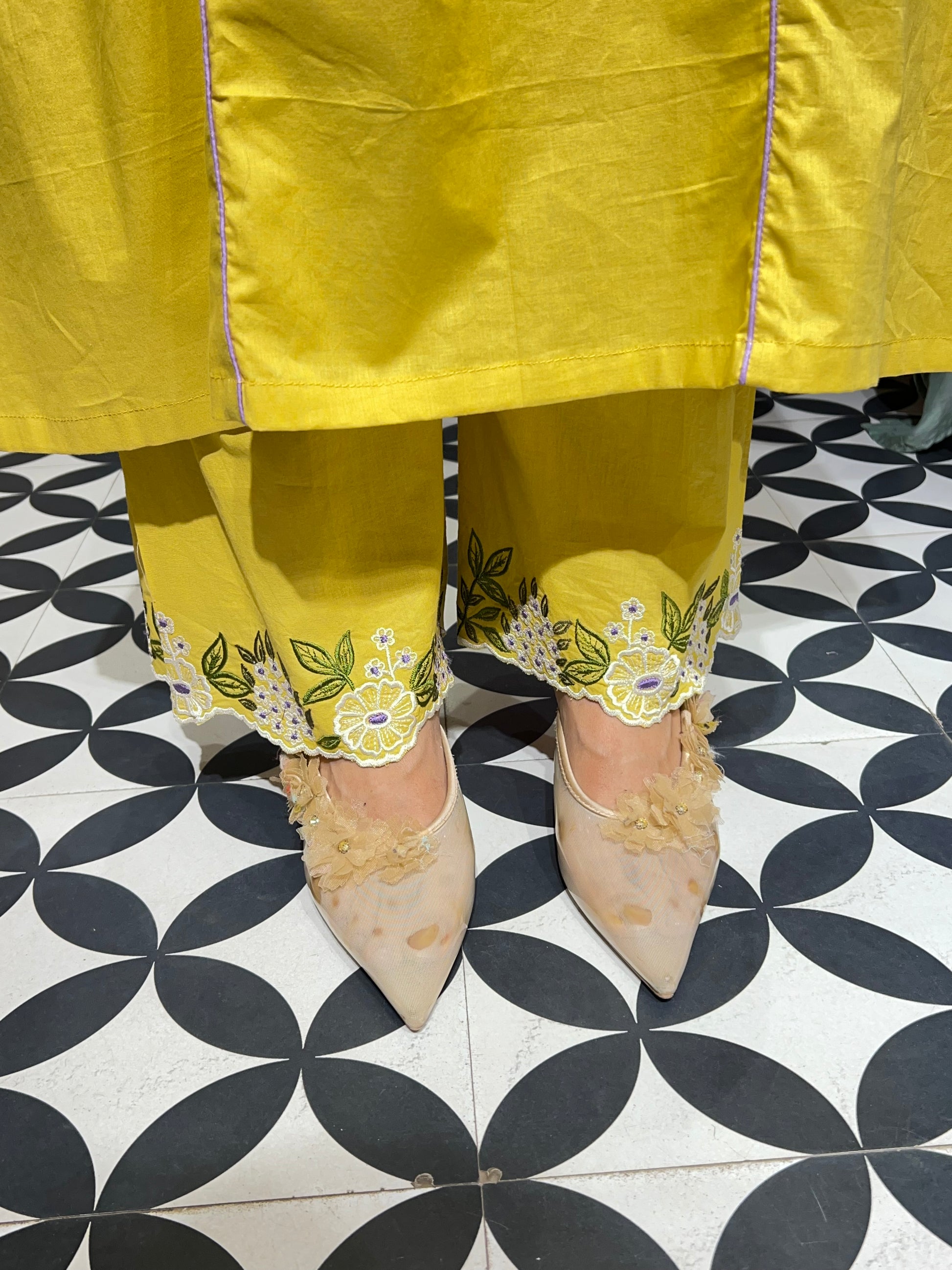 This yellow A-line kurta set is a perfect blend of elegance and ease. The classic silhouette flatters every body type and never goes out of style. A touch of purple piping adds just the right contrast to the bright yellow, while the pants feature intricate embroidery in green, purple, and cream, finished with delicate cutwork that adds charm and detail. Ideal for when you want to look effortlessly graceful.