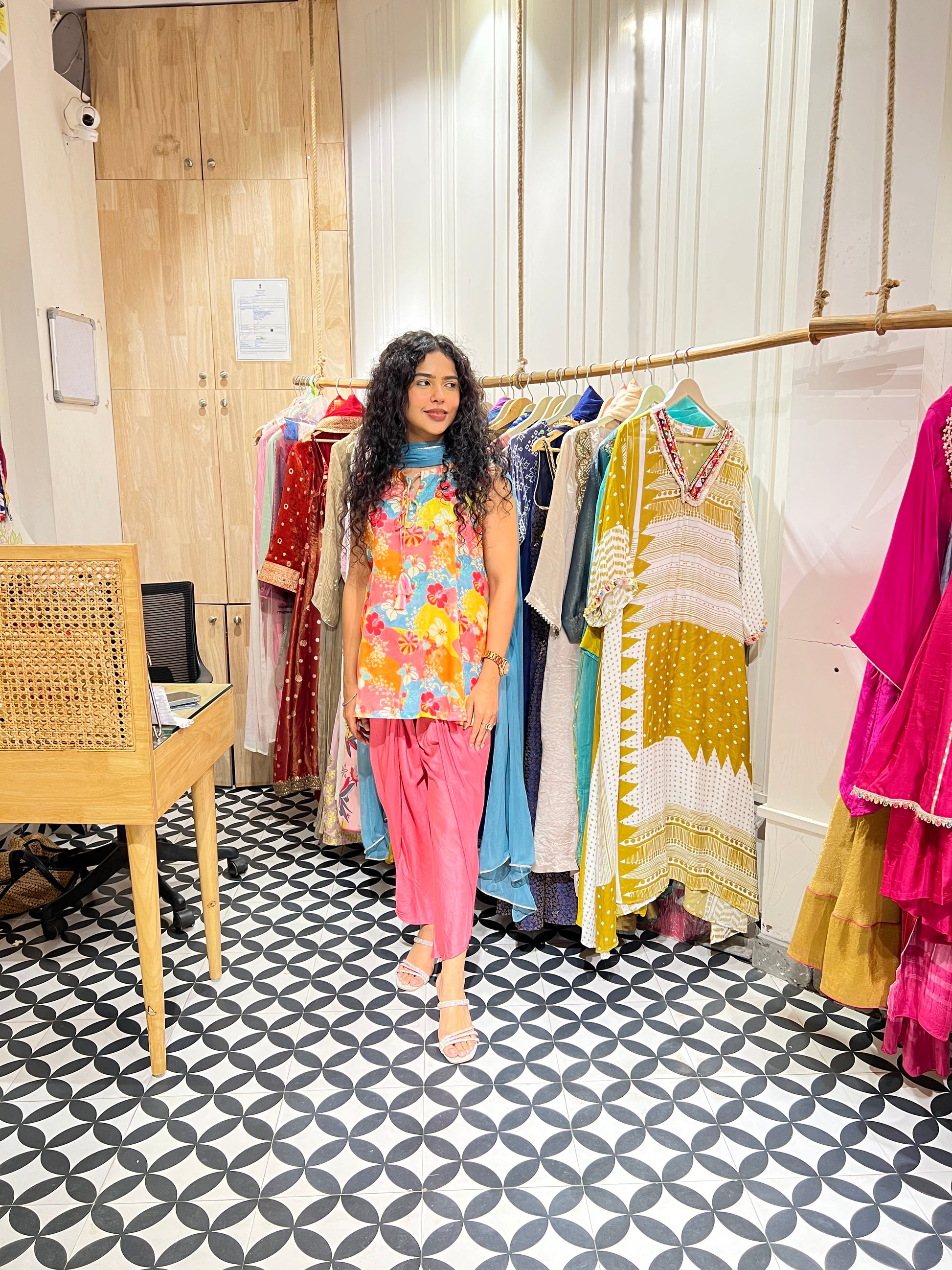 Bring a burst of color to your wardrobe with this multicolored printed floral top 🌸 Paired with elegant plain tulip pants for a chic and balanced look, this set blends comfort with style effortlessly. The soft blue chiffon dupatta adds a breezy, graceful touch 💙 Perfect for festive days, brunches, or casual gatherings - this outfit is where vibrant charm meets timeless elegance.