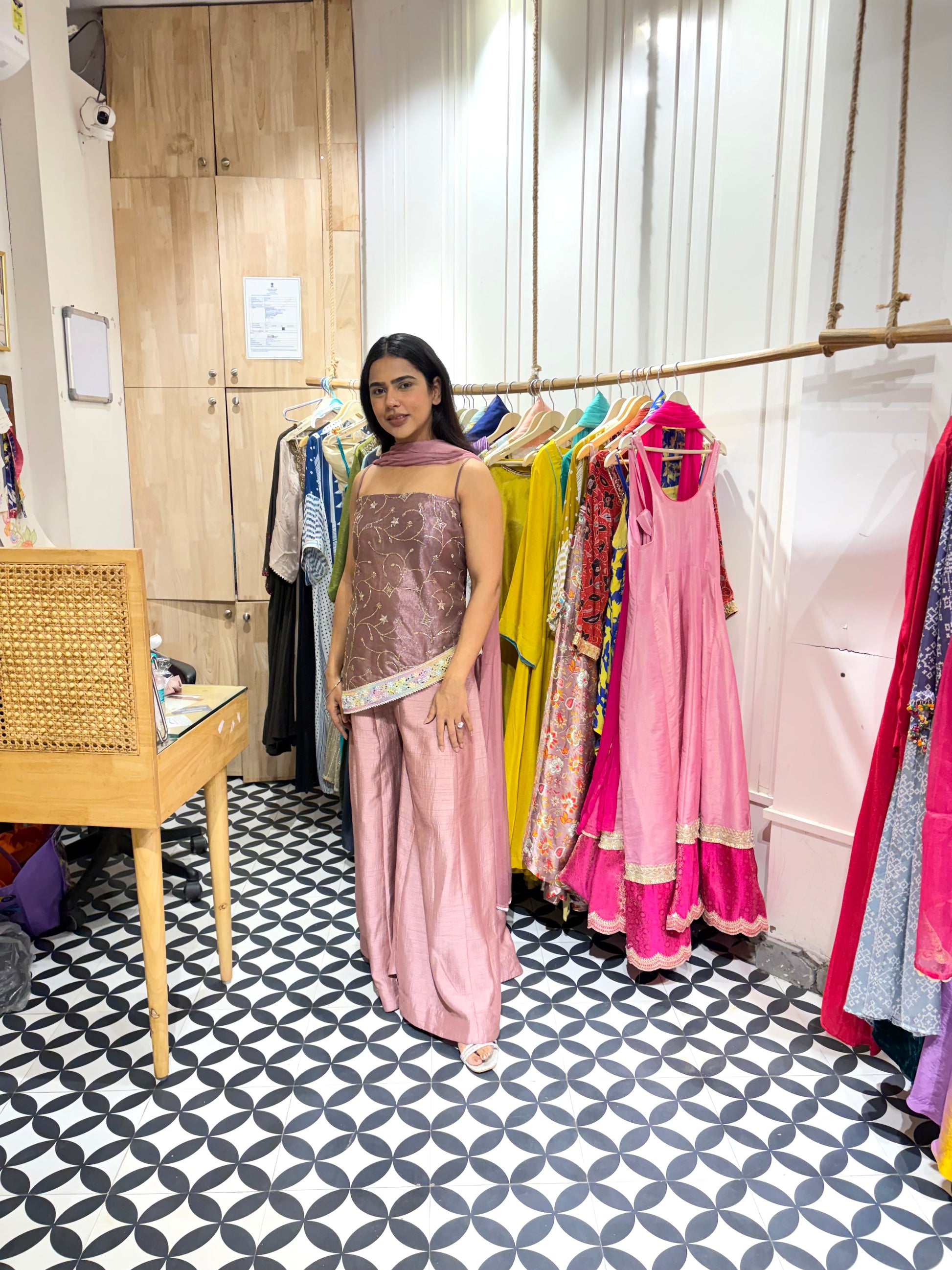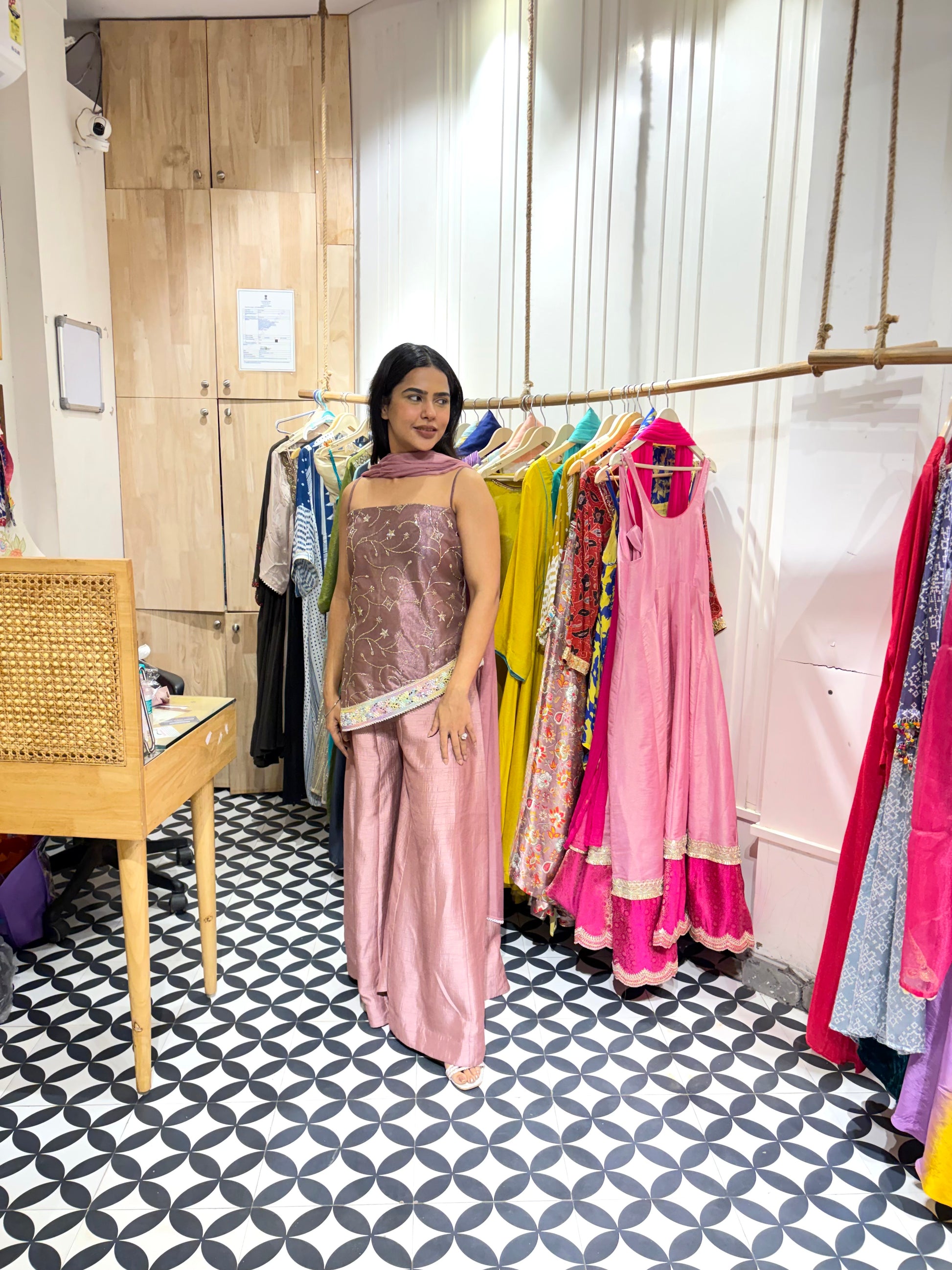 This pink embroidered sharara set is designed with detailed kardana and zari work, giving it a rich festive appeal. The matching sharara with lace detailing and the soft chiffon dupatta add elegance and comfort. Perfect for festivals and celebrations, this outfit blends modern style with girly charm. A versatile festive wear choice for anyone looking for a stylish, premium ethnic look.