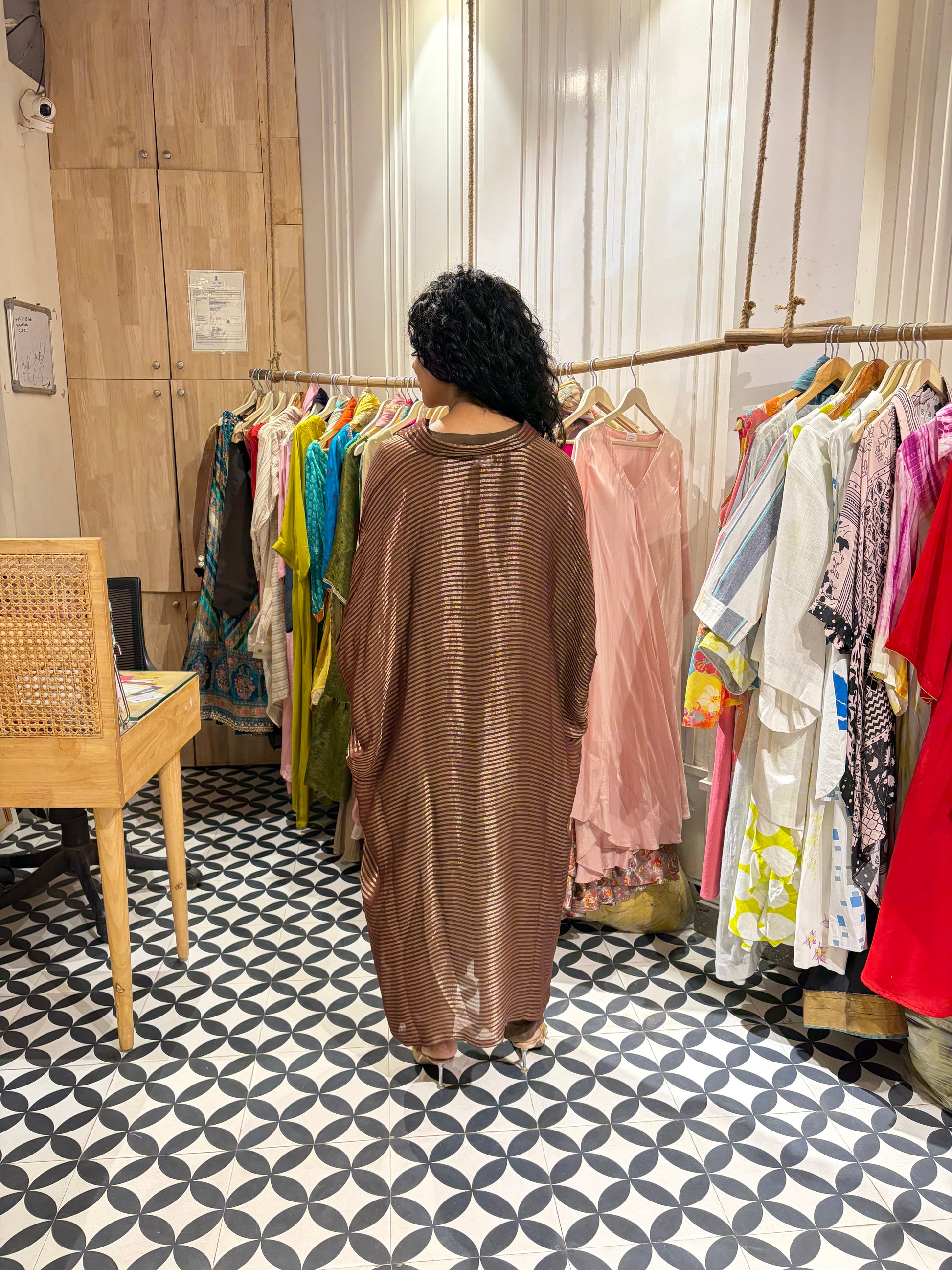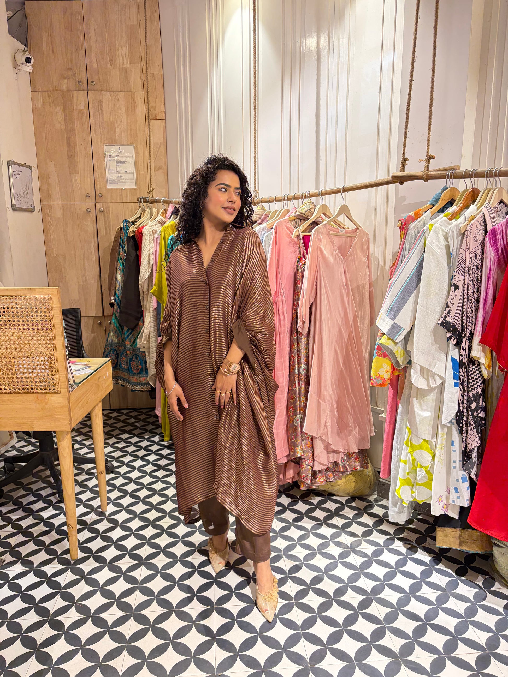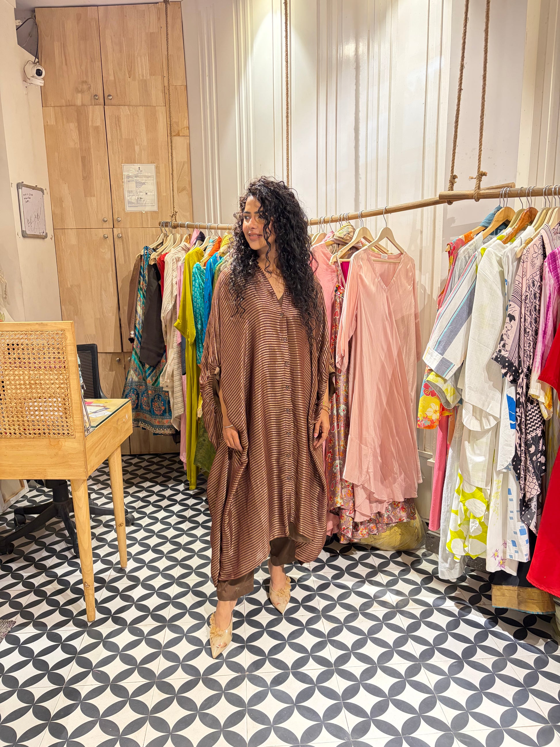 This chocolate brown kaftan set is designed for effortless sophistication and all-day comfort. Crafted in premium viscose organza, the kaftan drapes beautifully with a soft, graceful flow that flatters every silhouette. It comes as a coordinated 3-piece set with a crepe inner slip and matching crepe trousers for a seamless finish. The relaxed kaftan cut ensures ease of movement while maintaining a refined, polished look. A timeless piece that transitions effortlessly from day elegance to evening refinement