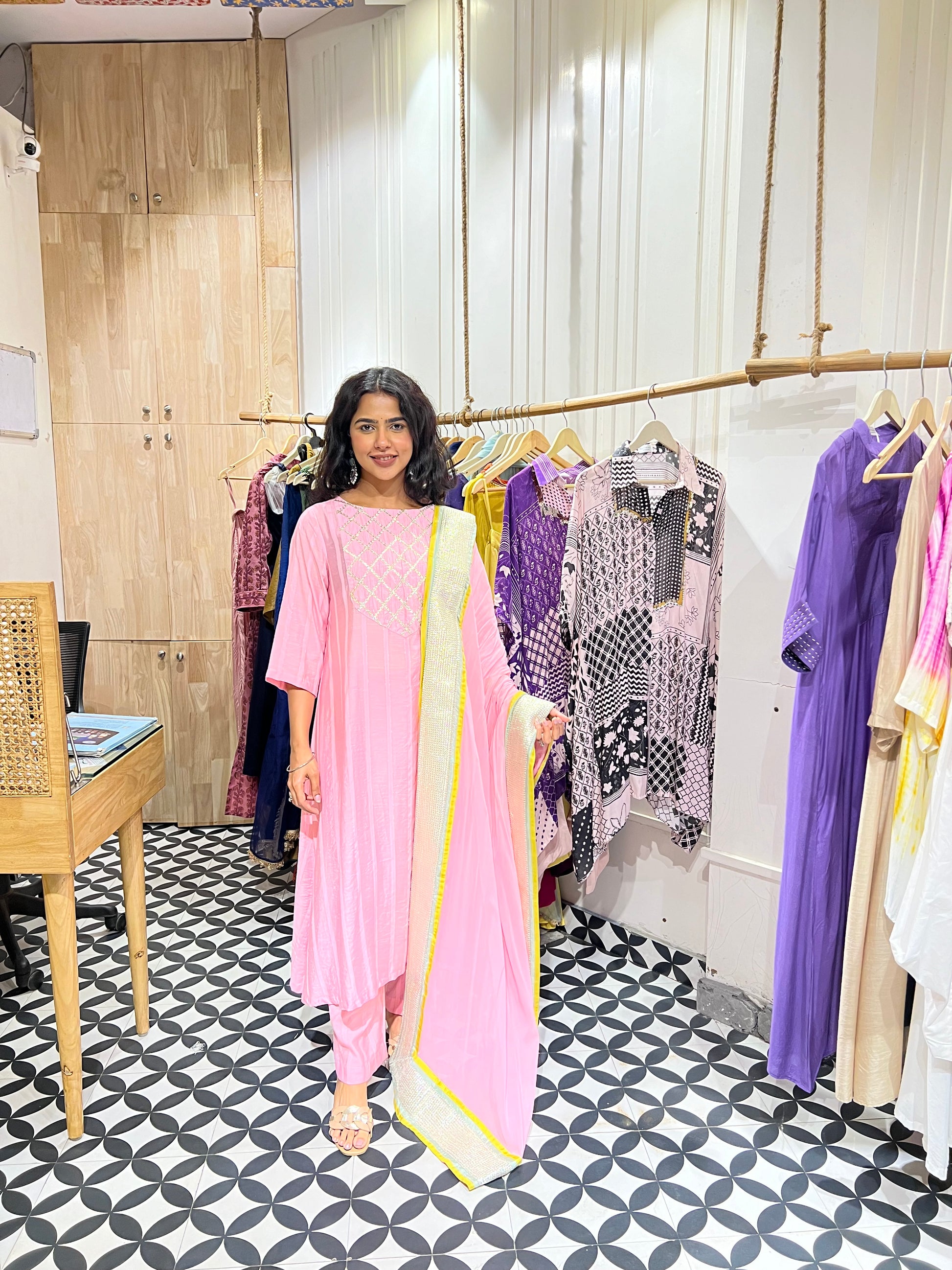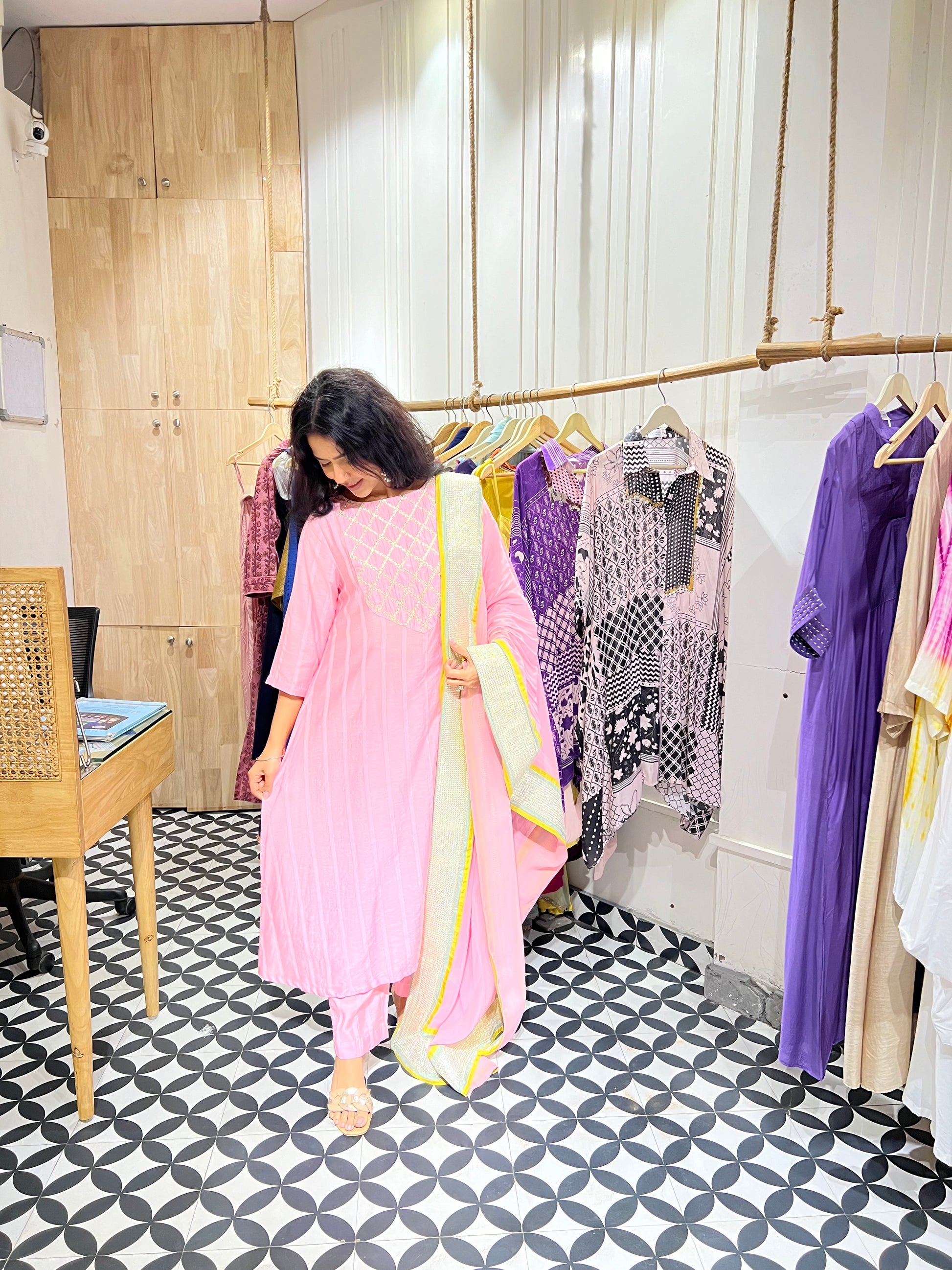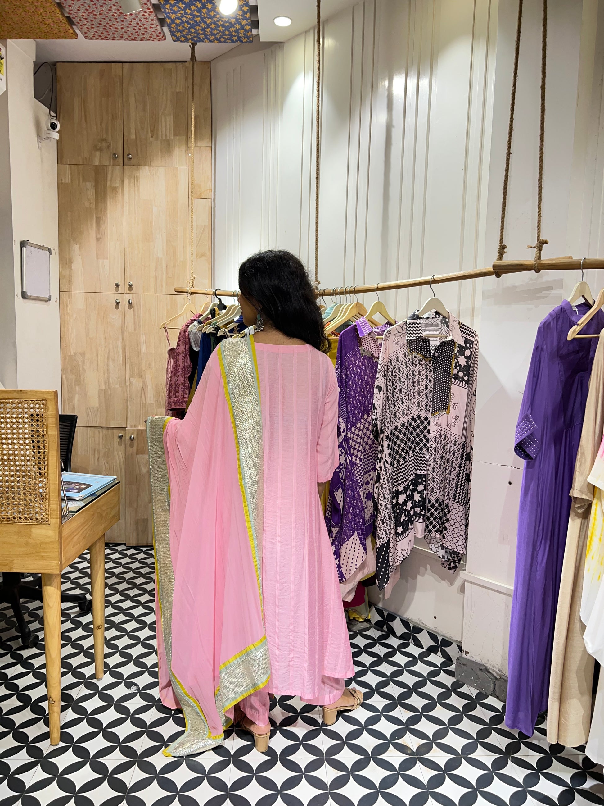 An A-line Chanderi beauty in the softest pink, designed to flatter with effortless grace. 🌸The georgette dupatta comes alive with teal-yellow borders, gota, and delicate detailing.Kinari work on the yoke adds just the right festive sparkle without being overdone.A simple yet elegant outfit, perfect for upcoming celebrations and special gatherings.
