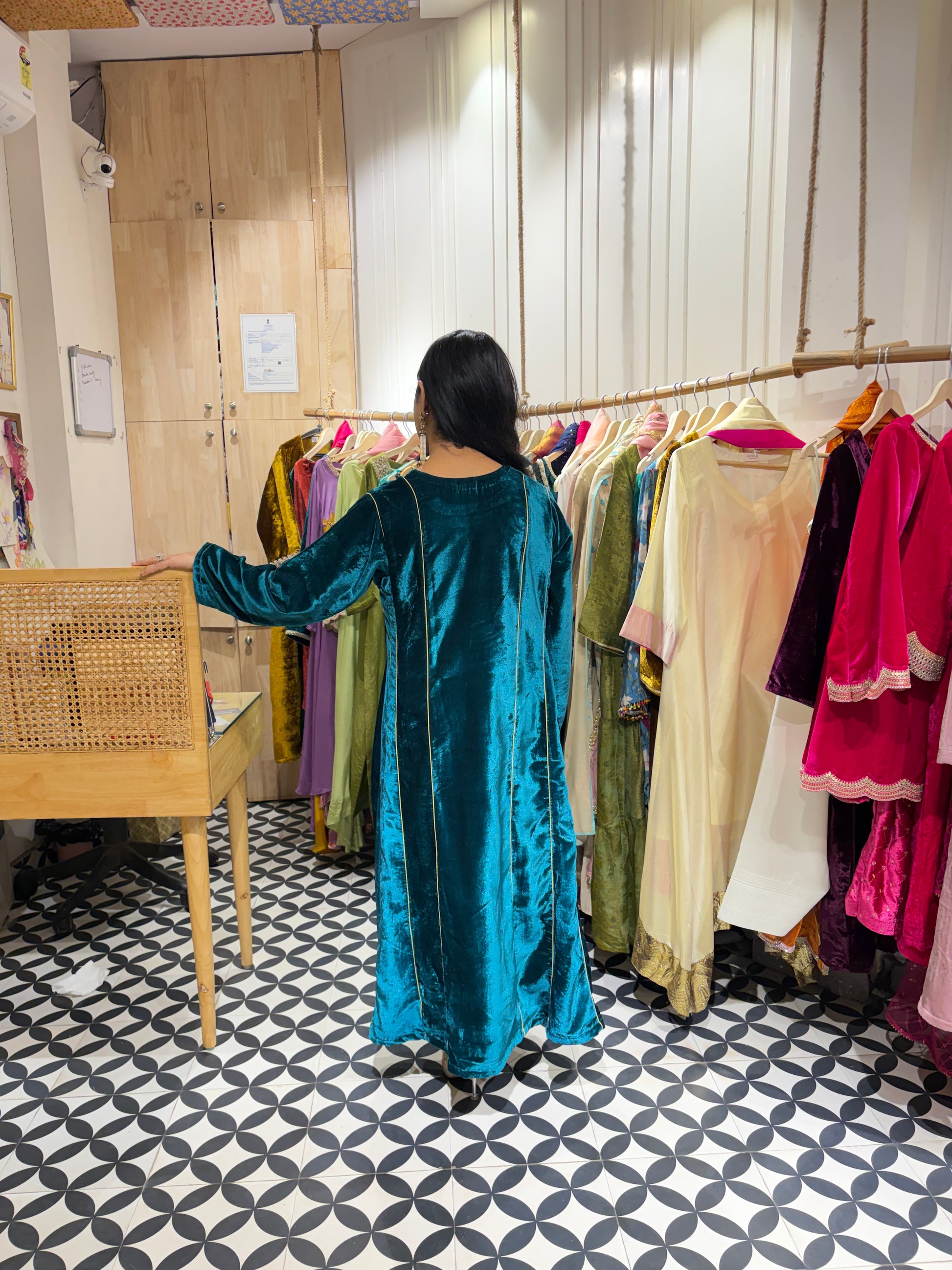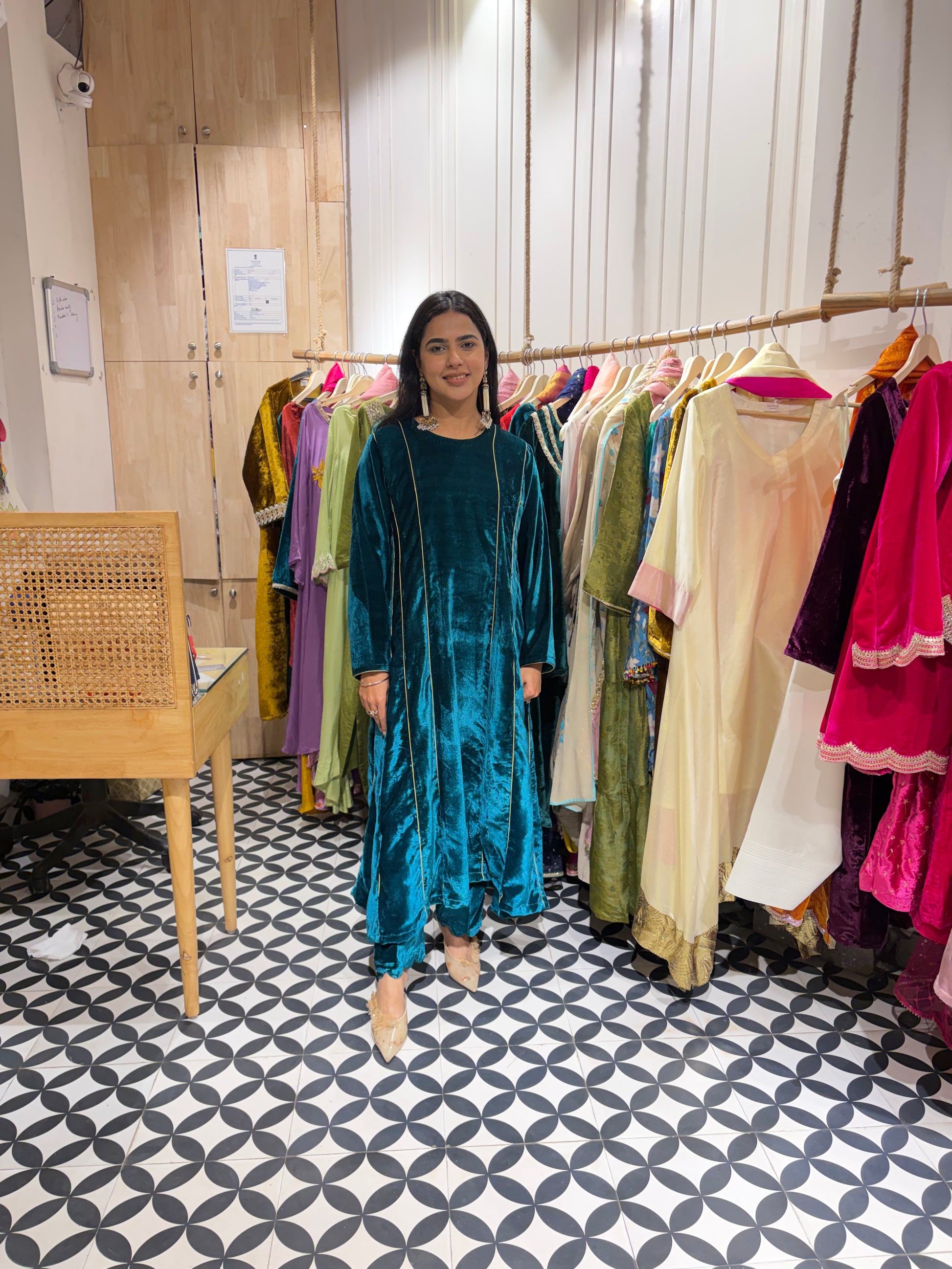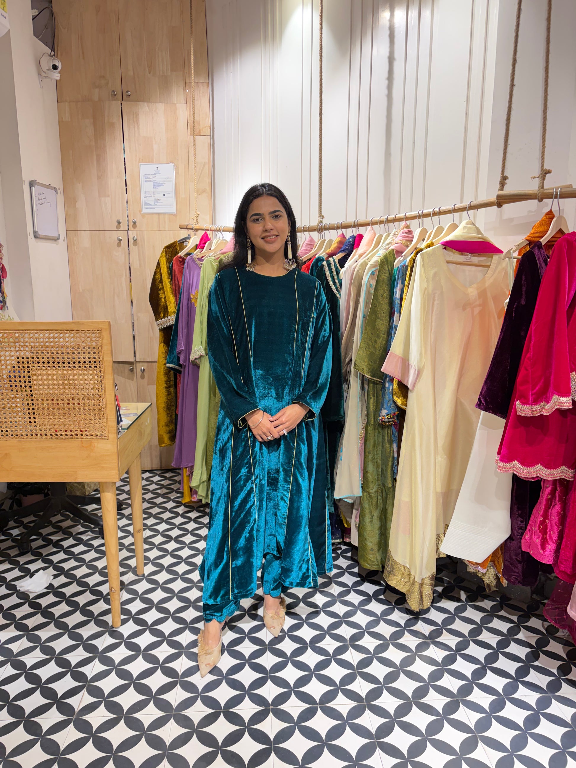 This turquoise co-ord set features elegant mustard contrast piping that adds a refined pop of colour to the soothing base. Designed for comfort and style, the silhouette is effortless yet polished. Ideal for daytime weddings, festive gatherings, brunches, and parties, this two-piece set is perfect for those who love understated elegance with a modern touch.