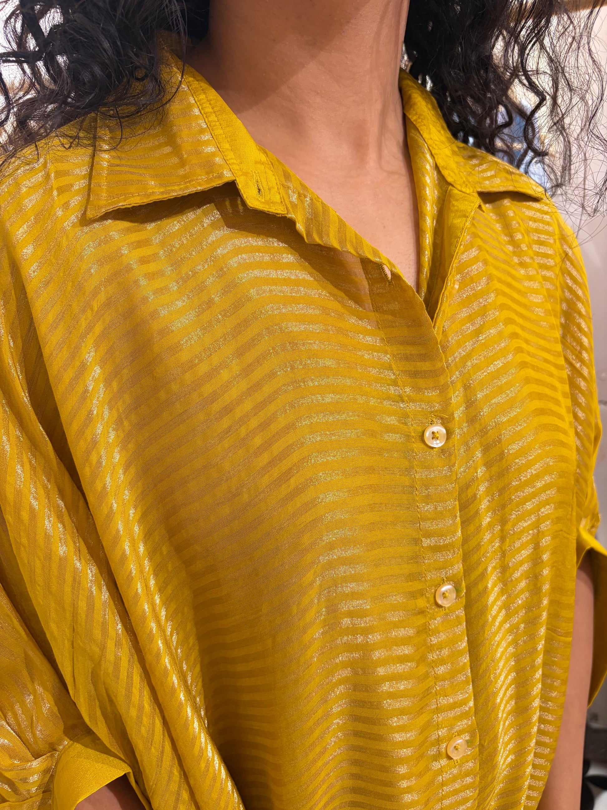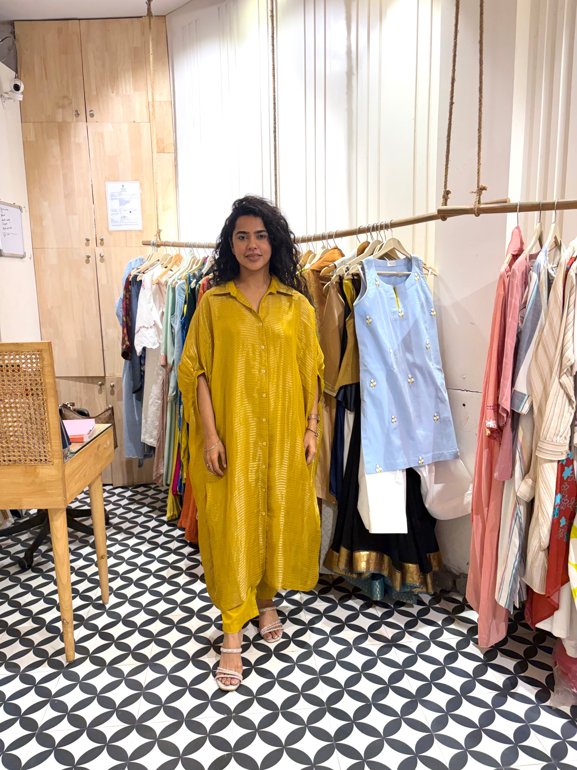 This mustard yellow kaftan set is designed for effortless sophistication and all-day comfort. Crafted in premium viscose organza, the kaftan drapes beautifully with a soft, graceful flow that flatters every silhouette. It comes as a coordinated 3-piece set with a crepe inner slip and matching crepe trousers for a seamless finish. The relaxed kaftan cut ensures ease of movement while maintaining a refined, polished look. A timeless piece that transitions effortlessly from day elegance to evening refinement.