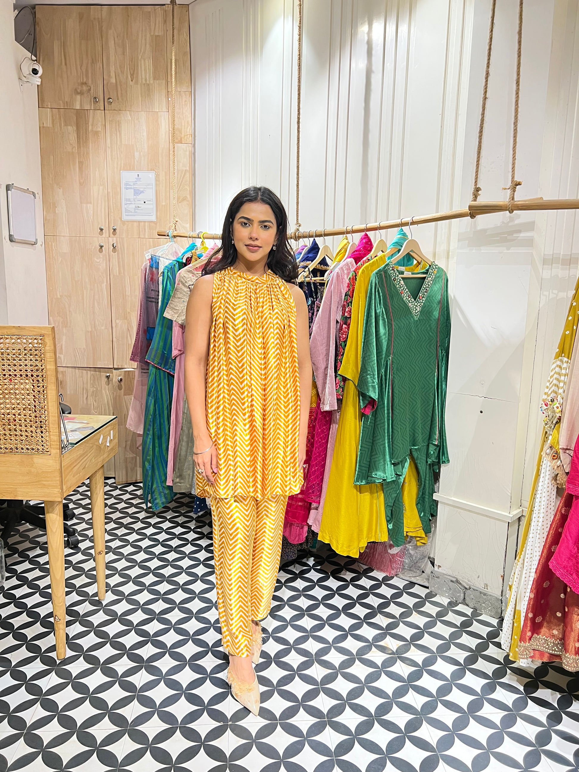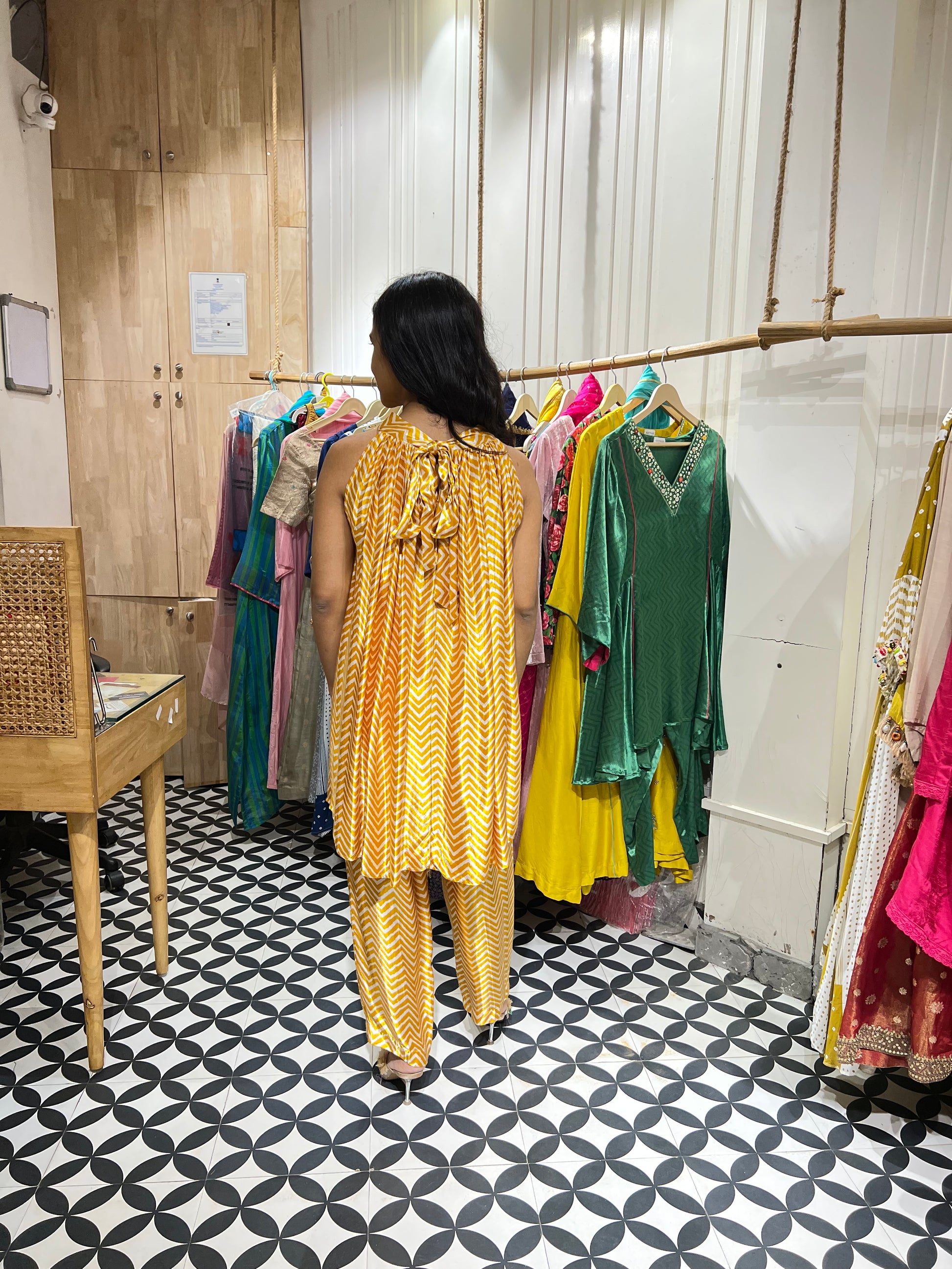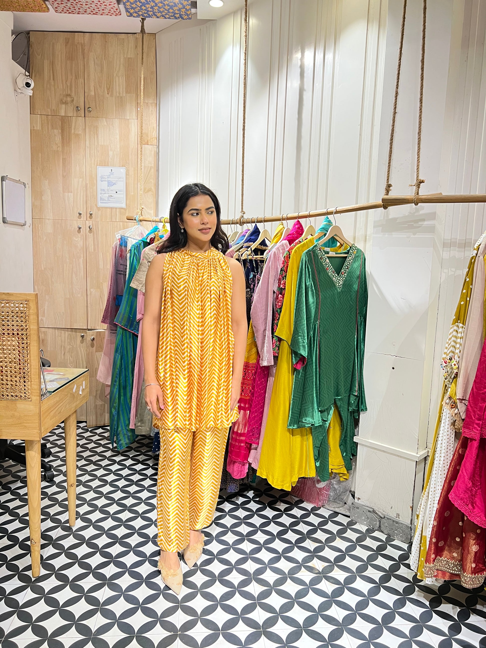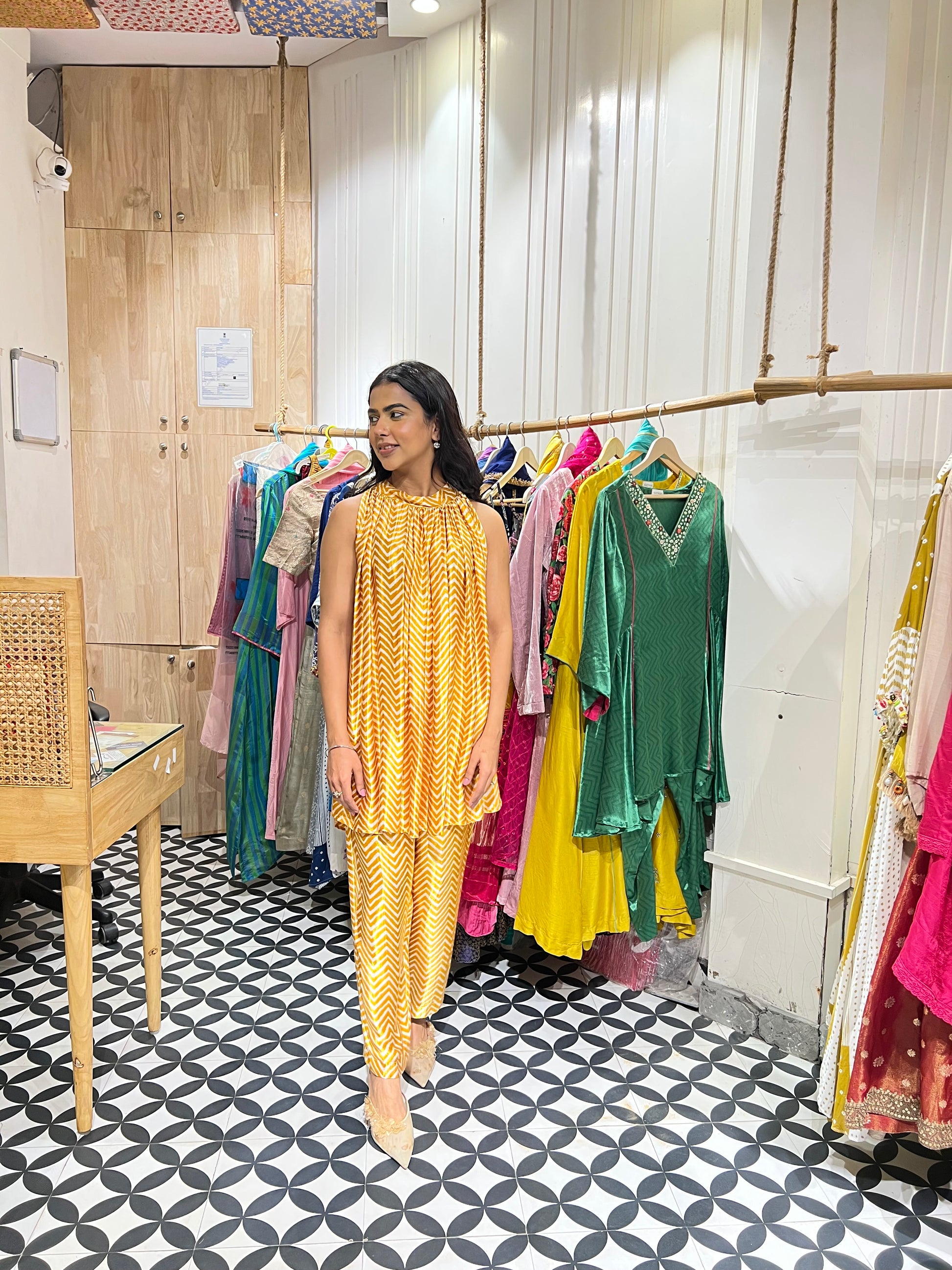 This Ajrakh print coord set features an A-line halter neck top paired with straight pants. Lightweight and comfortable, it’s perfect for everyday wear or casual outings. Girly, stylish, and affordable, it’s a versatile piece that adds charm to any wardrobe.