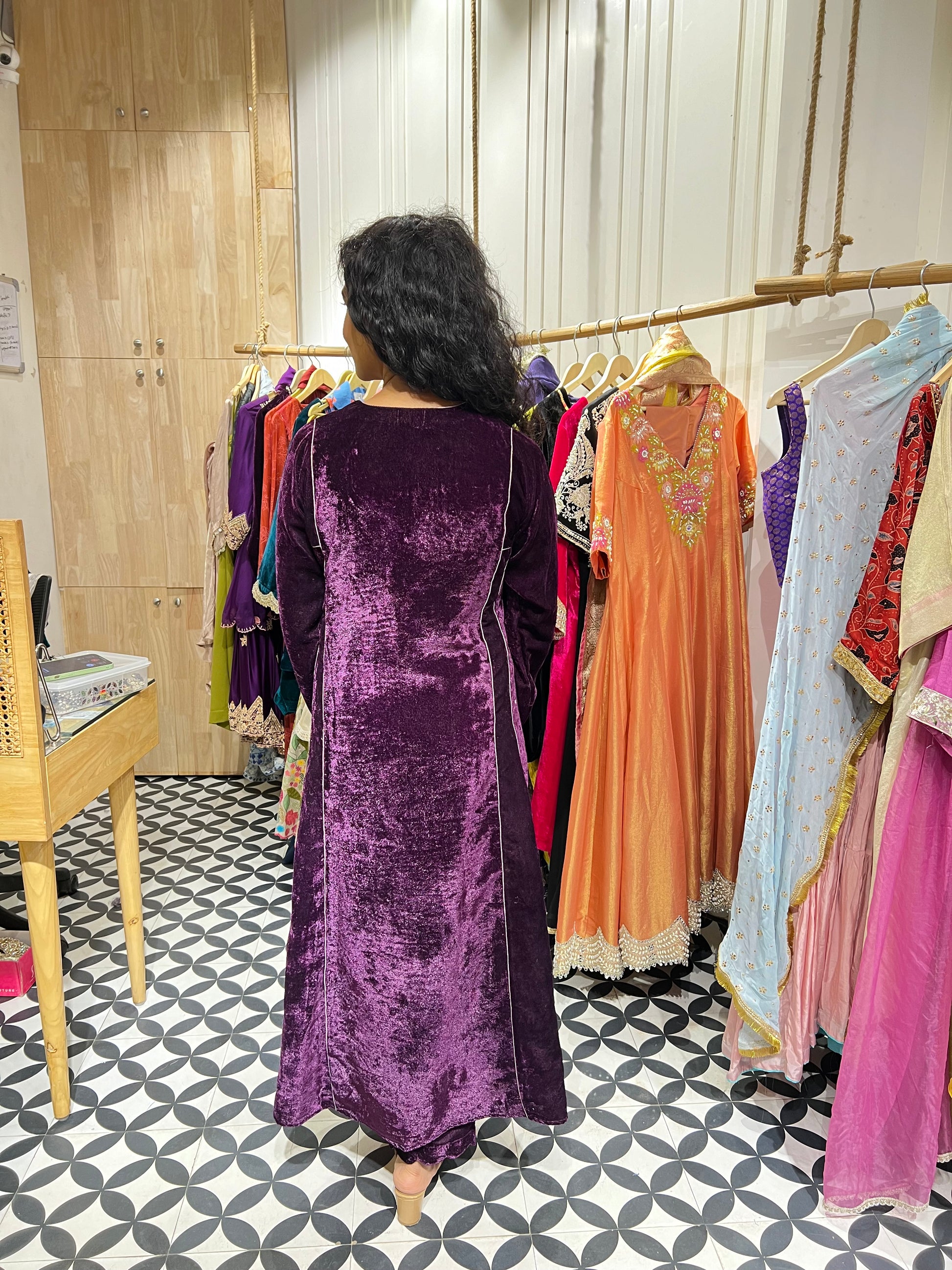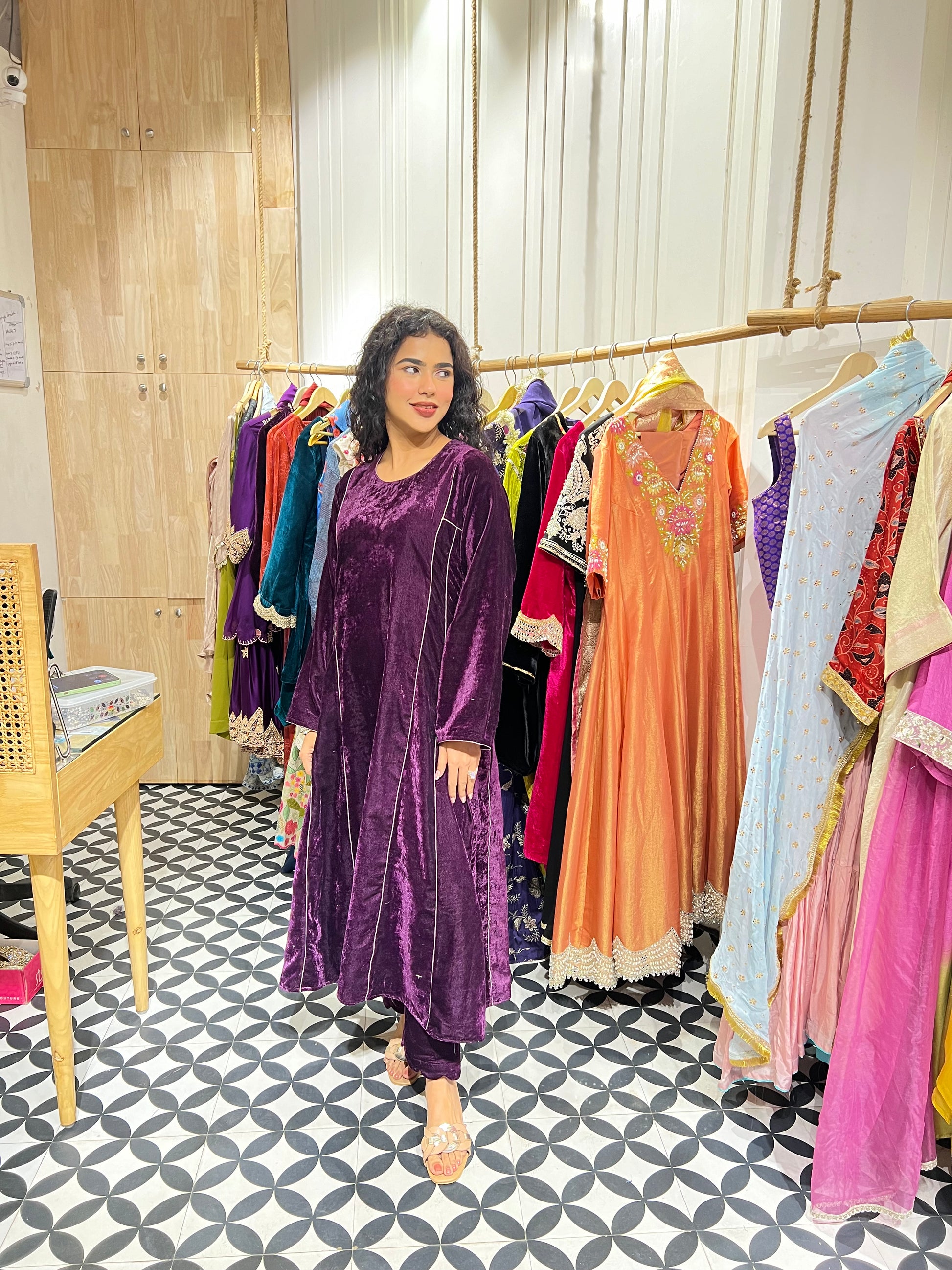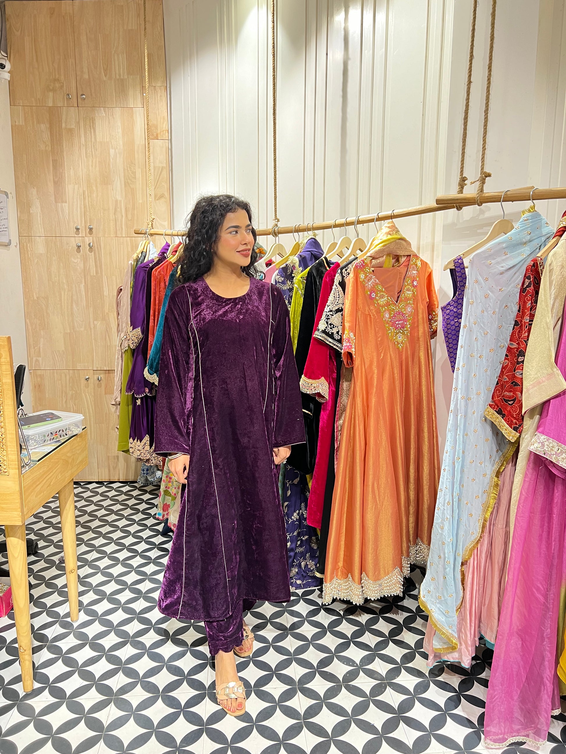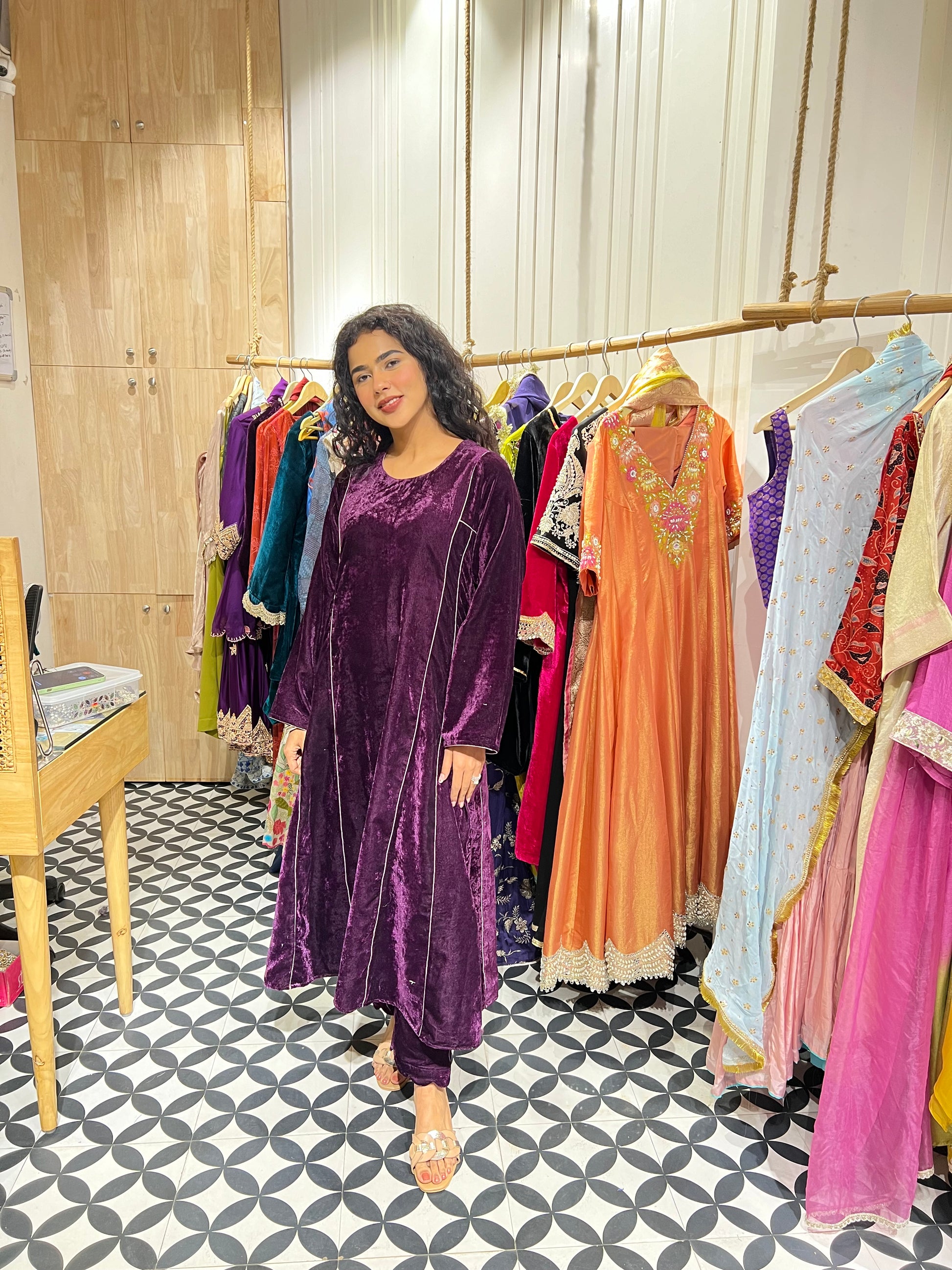This velvet coord set features a matching top and bottom in the same rich hue, highlighted with subtle light-colored piping for a refined touch. The soft texture of velvet adds warmth and luxury, making it perfect for festive evenings and special occasions. Designed to balance comfort and elegance, it exudes effortless sophistication. A timeless addition to your wardrobe that speaks understated glamour.