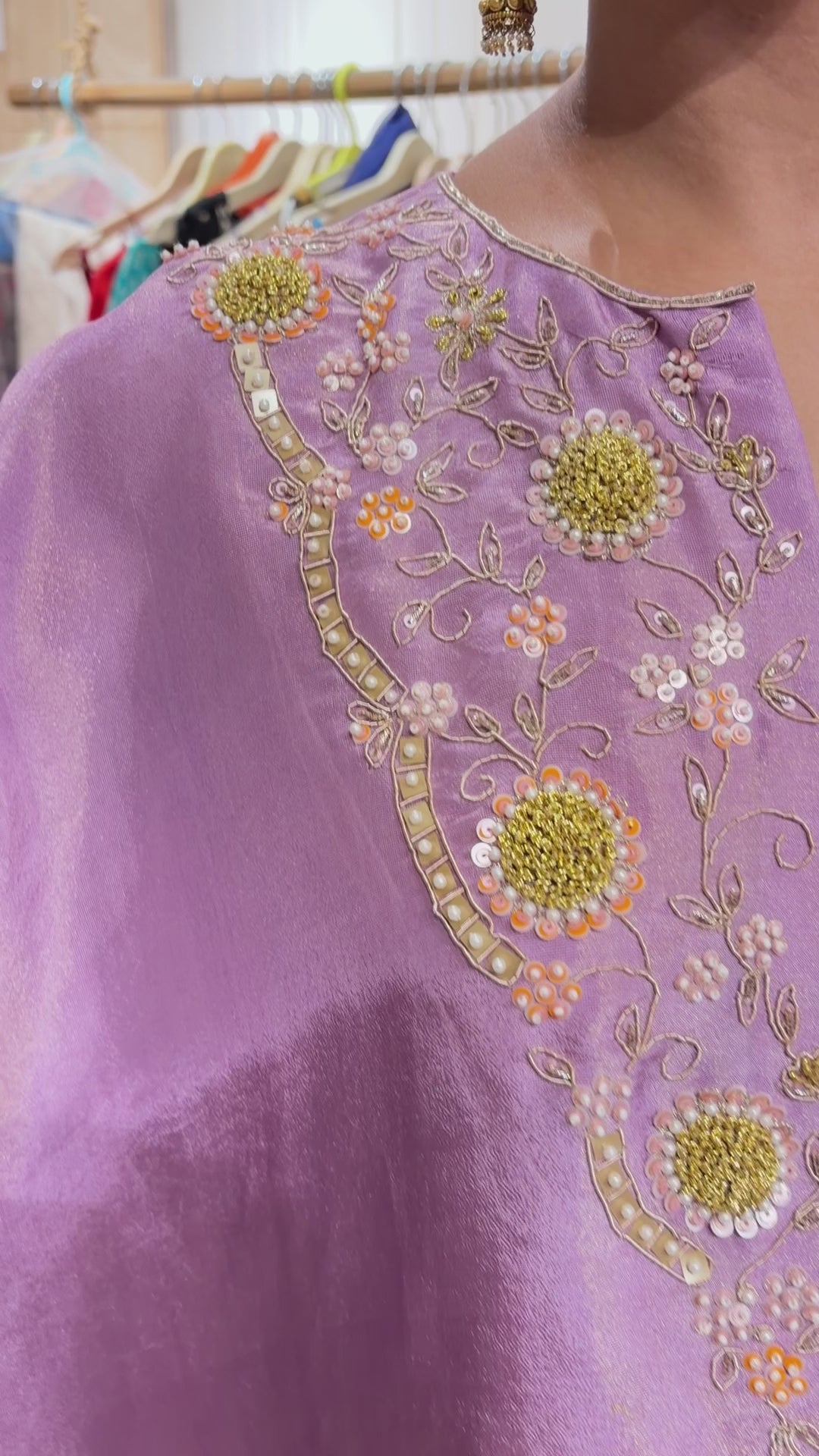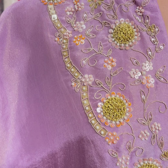 A blend of modern elegance and traditional charm - this lavender asymmetrical kurta in pure tissue fabric is perfect for days you want to keep it classy yet effortless. The hand-detailed neckline adds a hint of sparkle, while the signature moss satin salwar cut brings flow and comfort together beautifully.